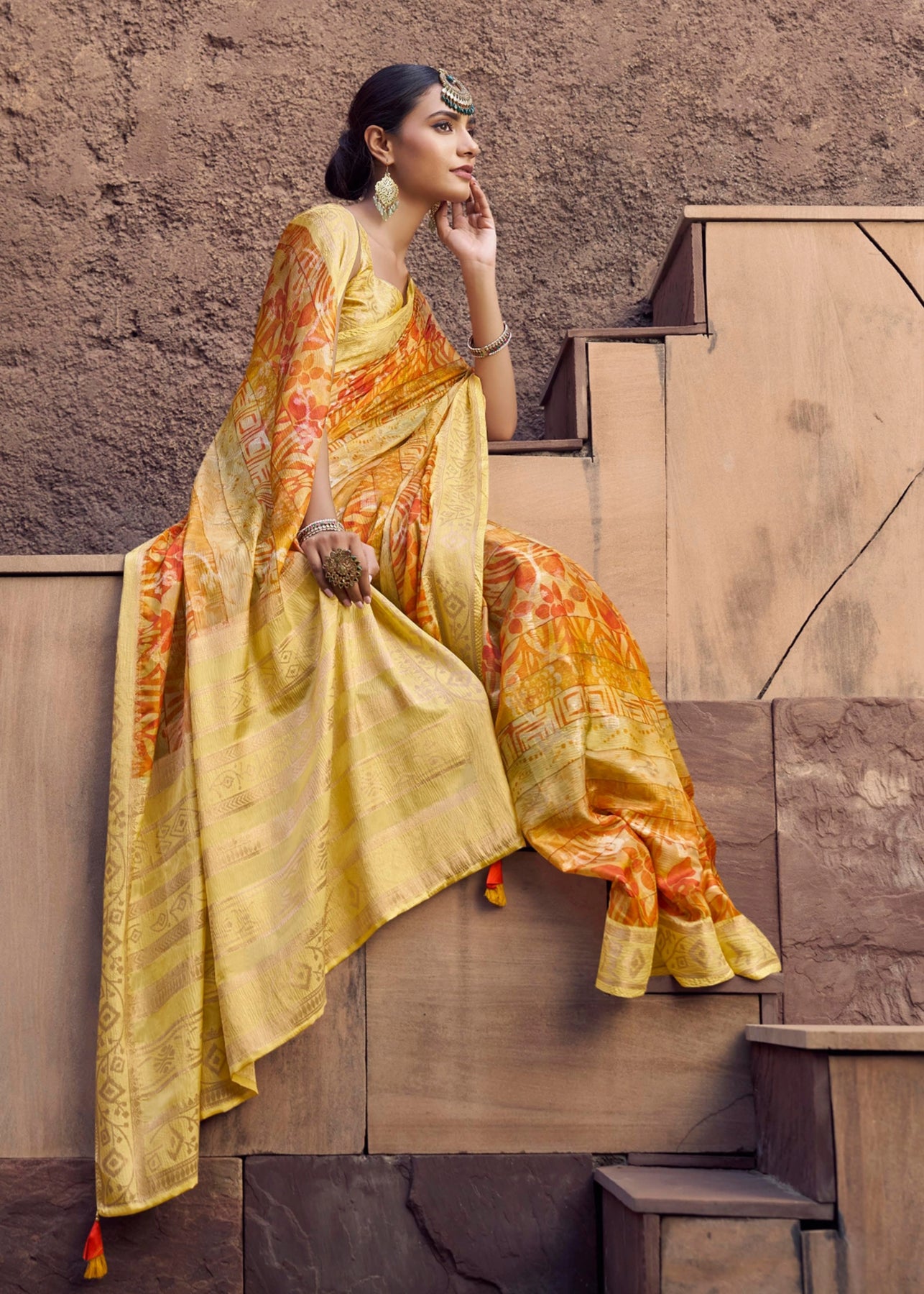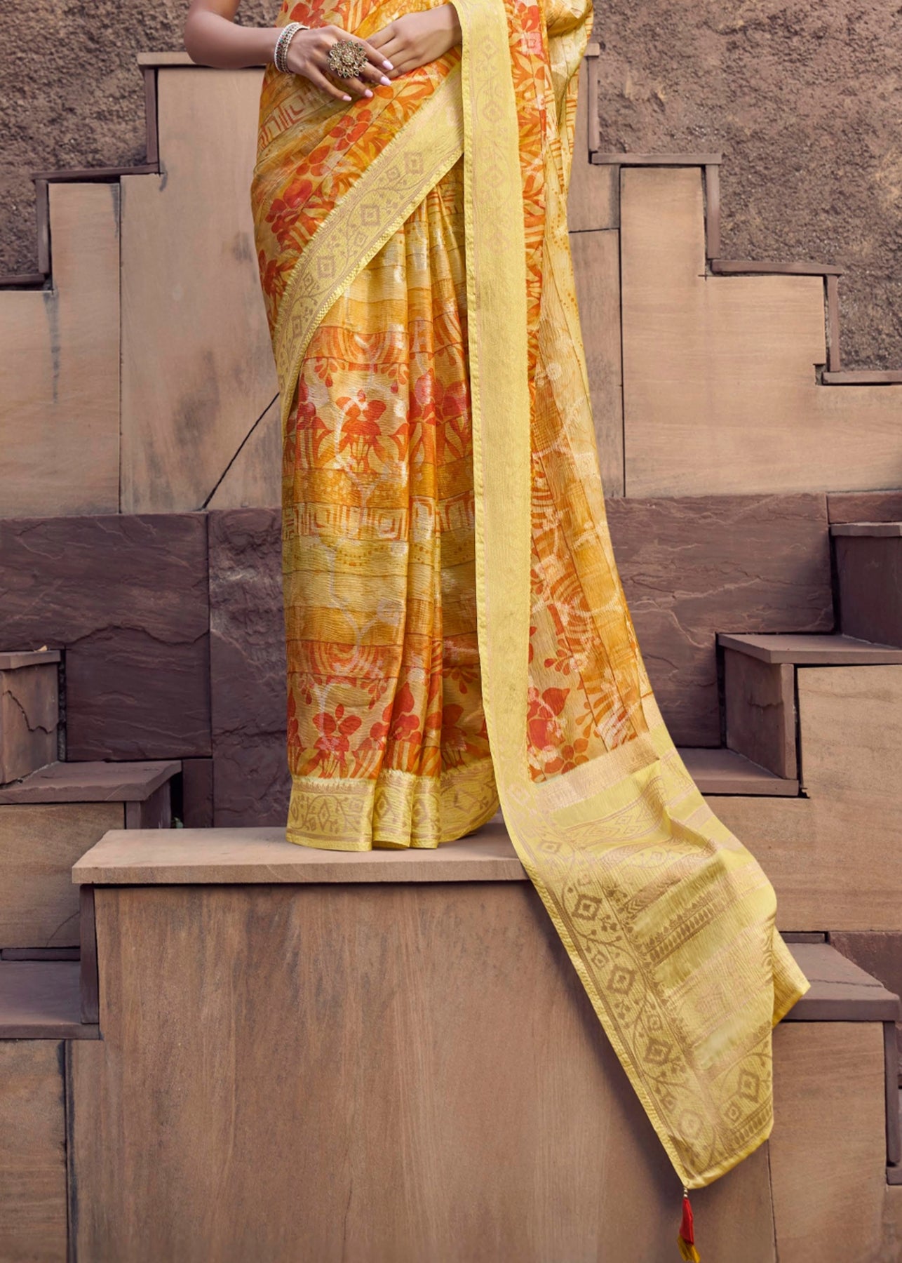 This radiant georgette saree features vibrant yellow and orange hues with traditional Bandhej work.It is embellished with rich moti, cut-dana, resham, sequins, pearls, zari, and zardosi detailing, making it ideal for weddings or festive occasions.