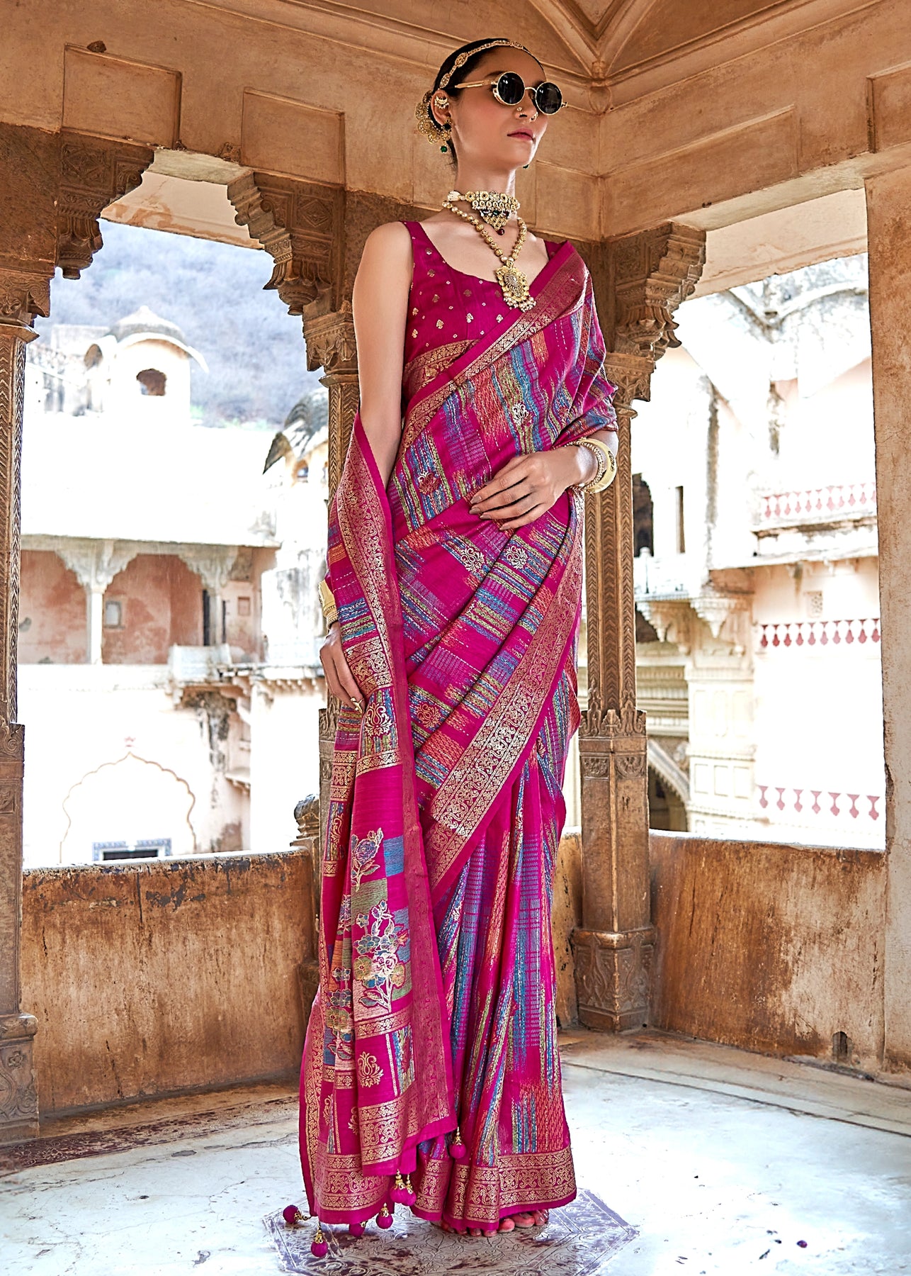 Hot Pink Woven Georgette Bandhej Designer Saree