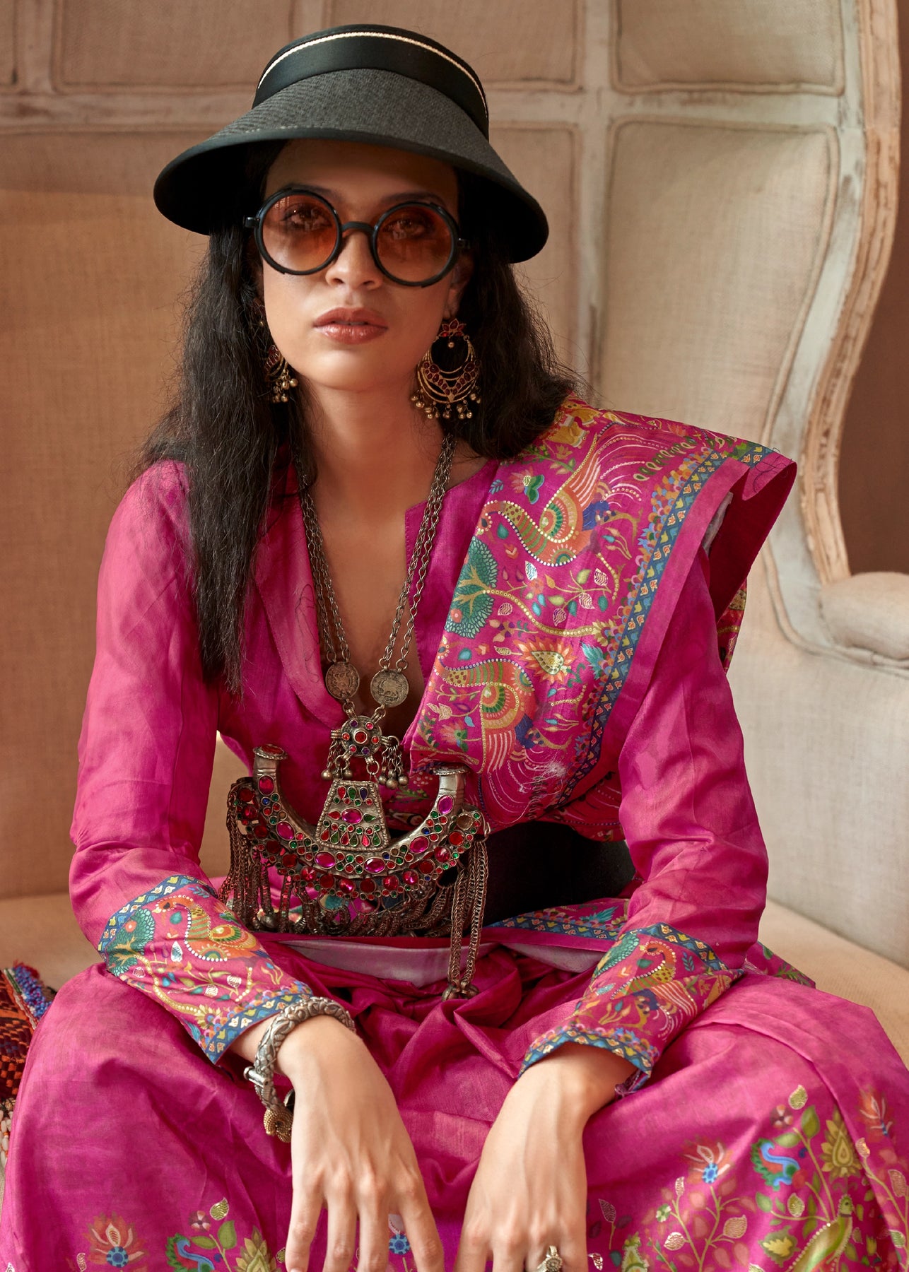 Carmine Pink Madhubani Printed Saree