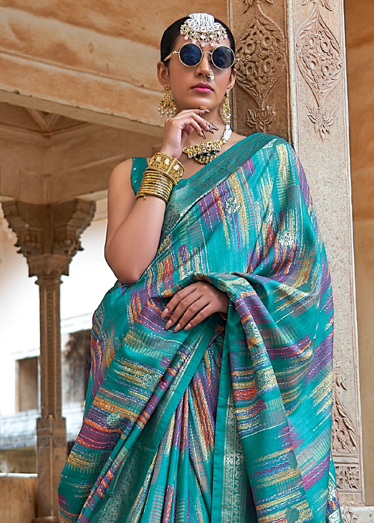 Teal Blue Printed Soft Silk Saree
