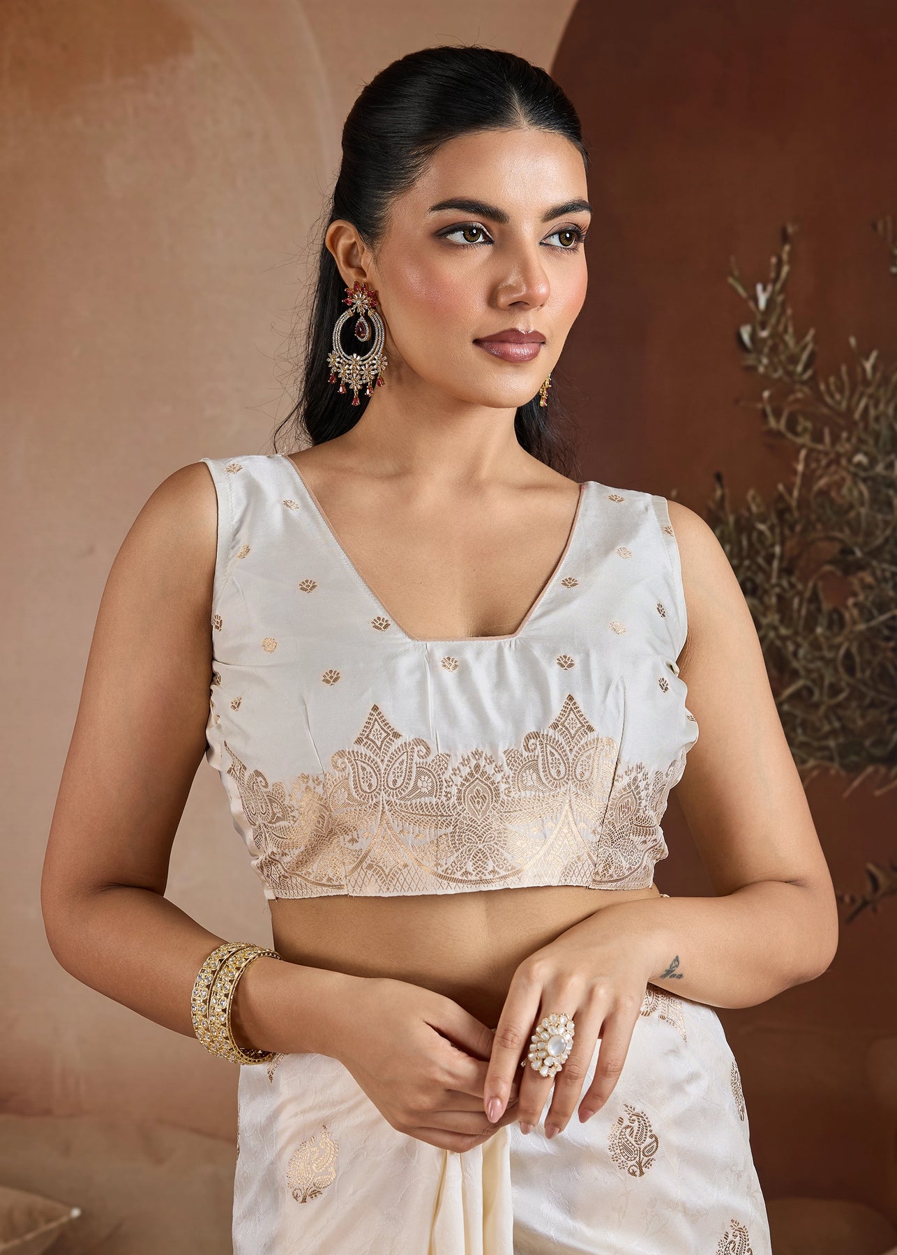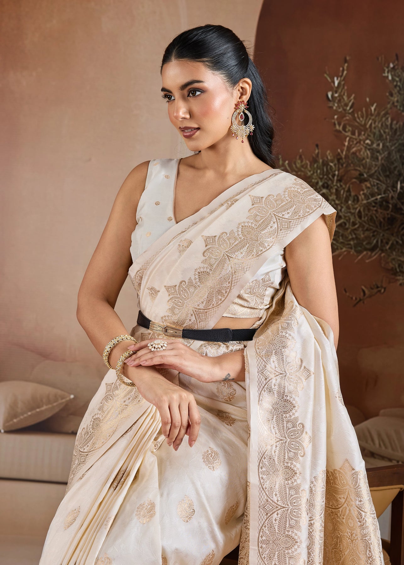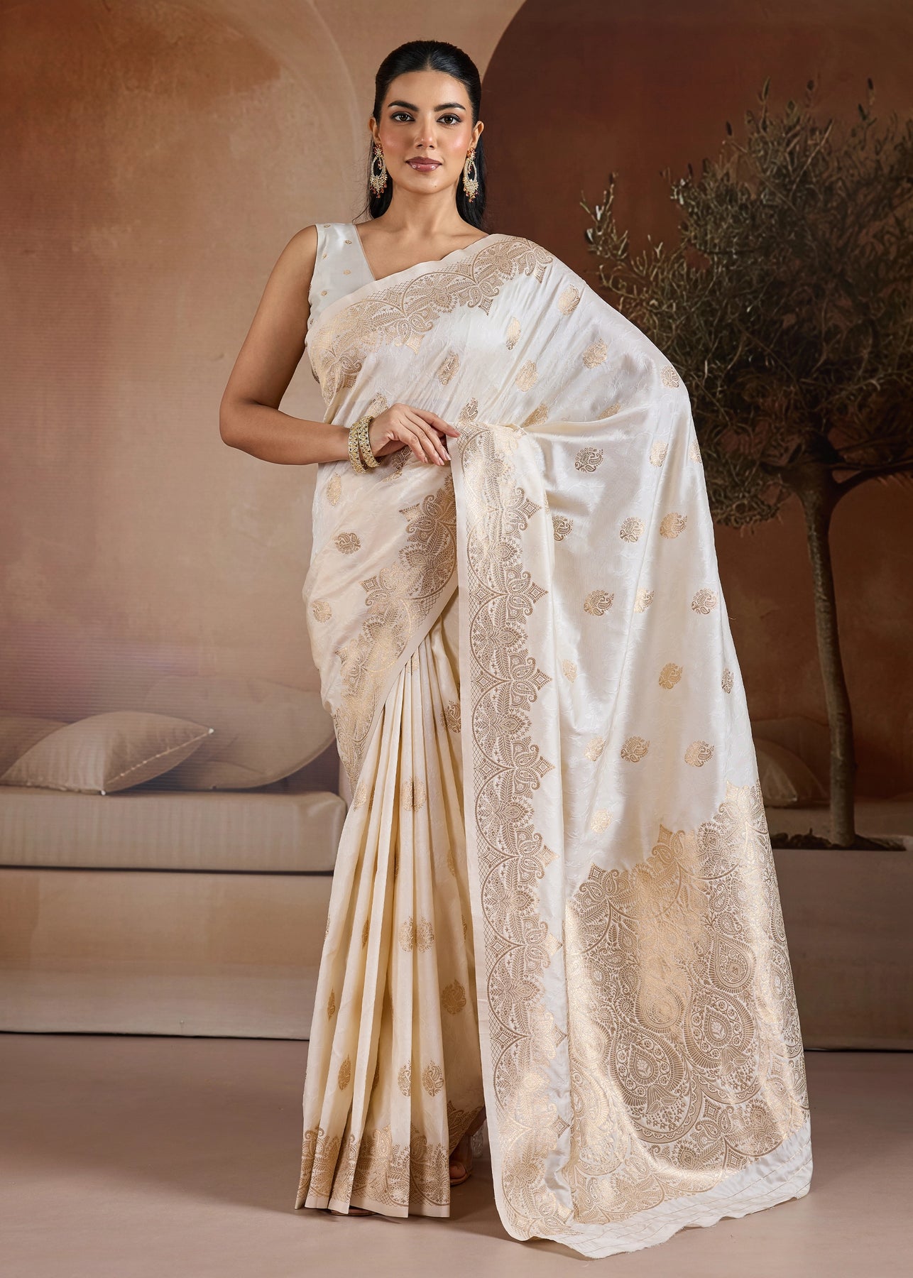 Cream Beige Woven Banarasi Silk Saree