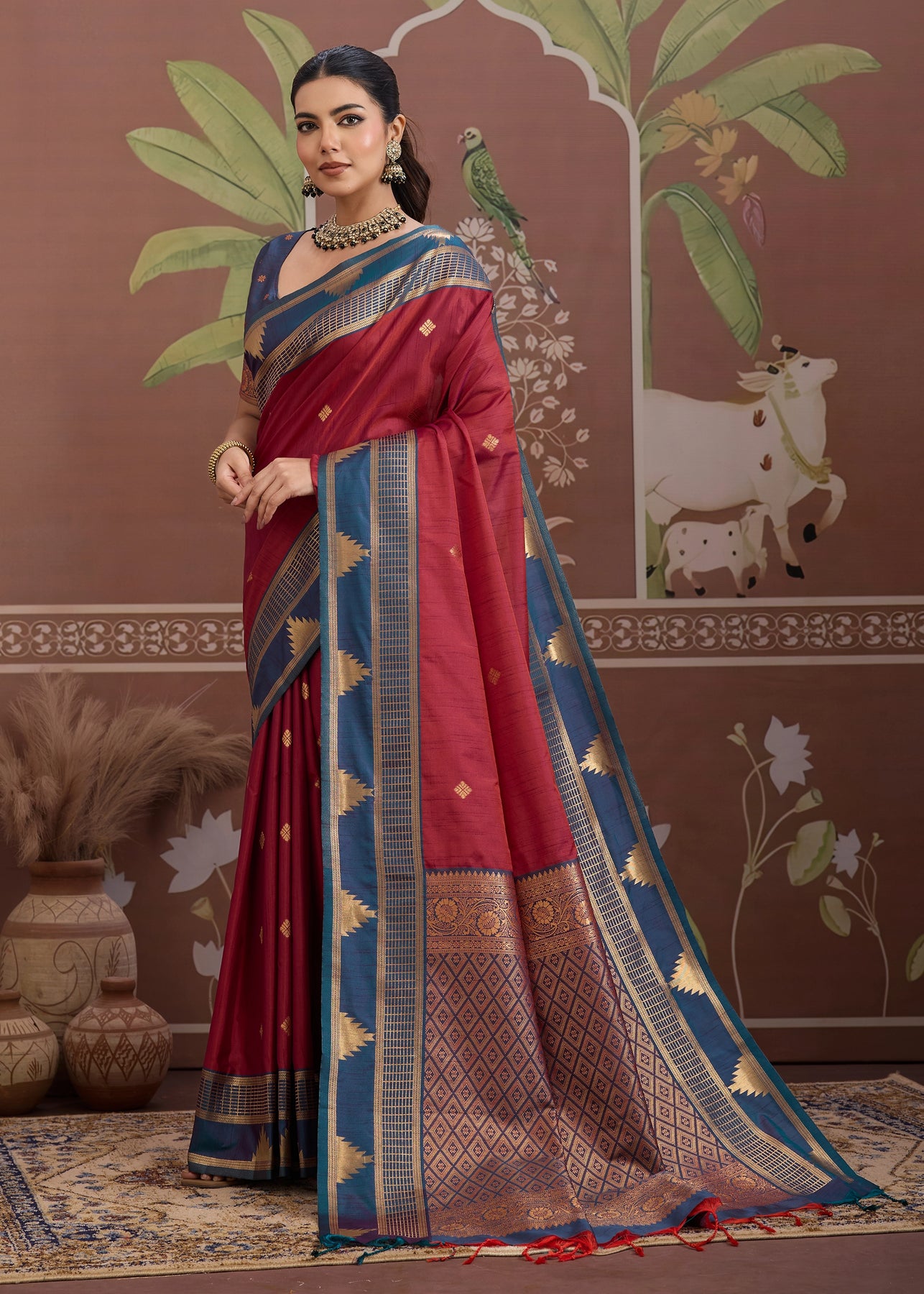 Maroon Red Woven Tussar Silk Saree