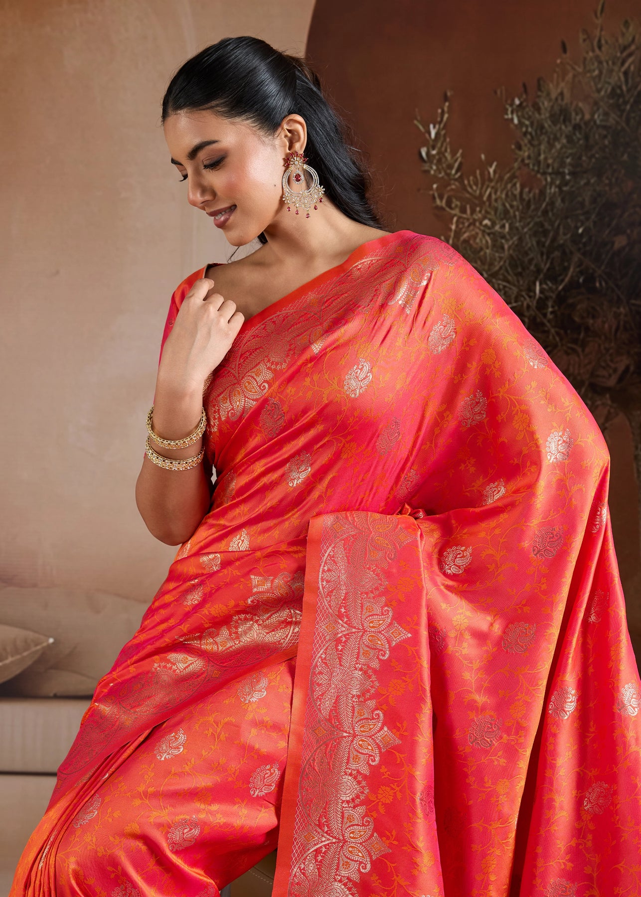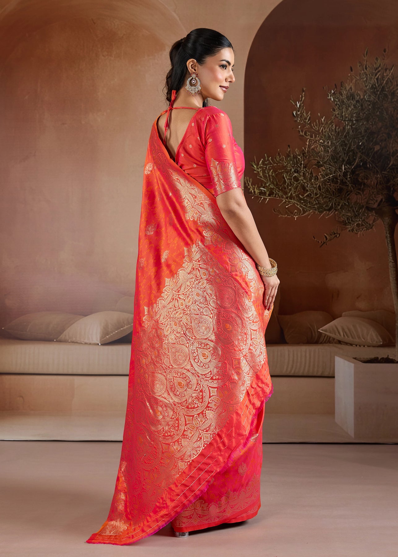 Peel Orange Woven Banarasi Satin Silk Saree
