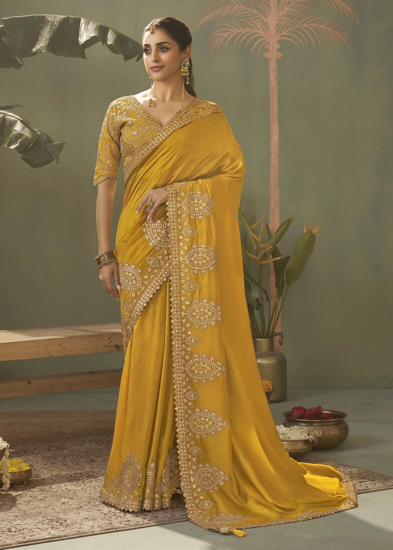 A stunning woman models an elegant saree.The vibrant garment is adorned with intricate gold zari work along its border and on the matching embroidered blouse, ideal for any special occasion.