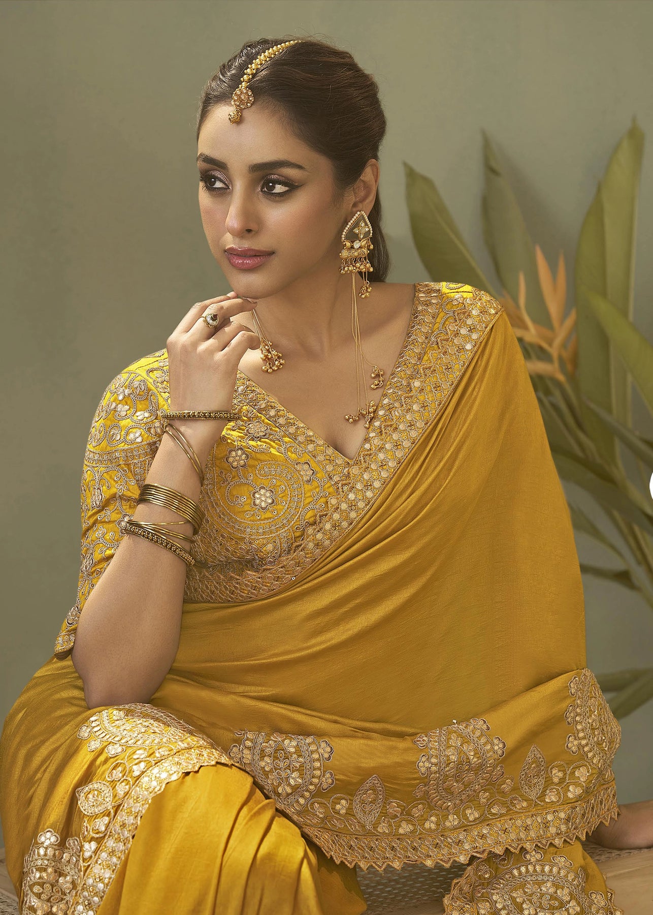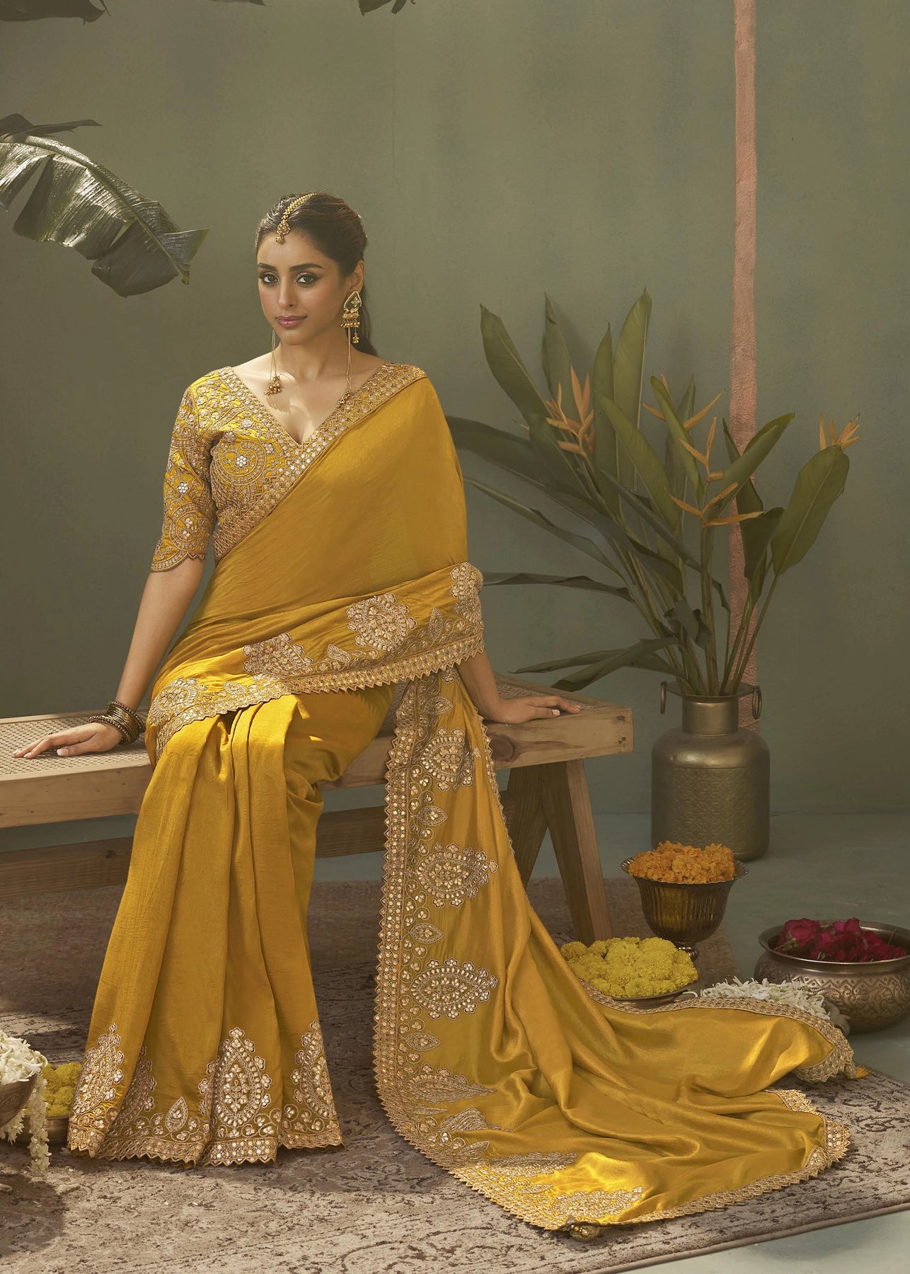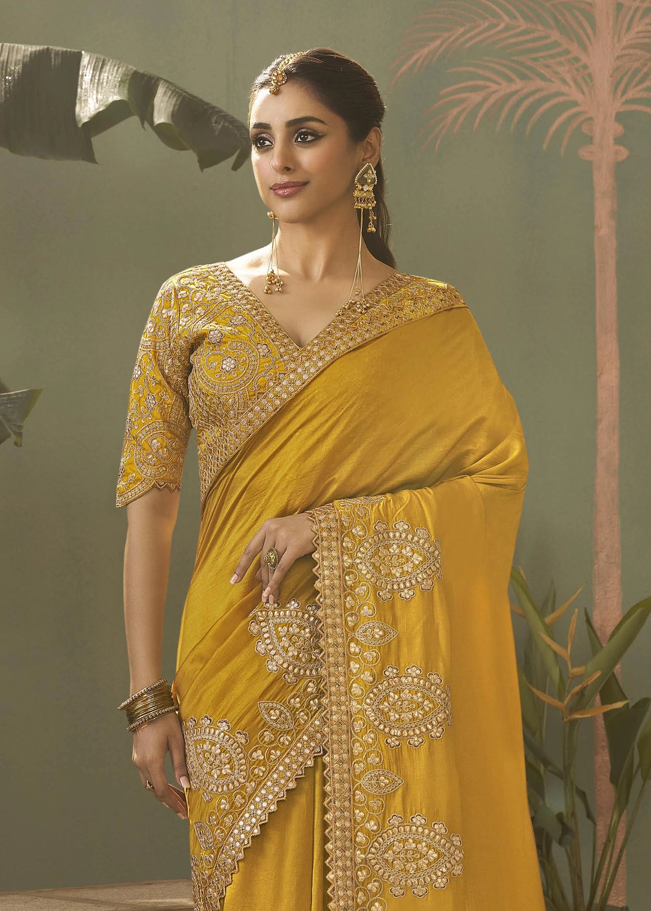 A stunning woman models an elegant saree.The vibrant garment is adorned with intricate gold zari work along its...