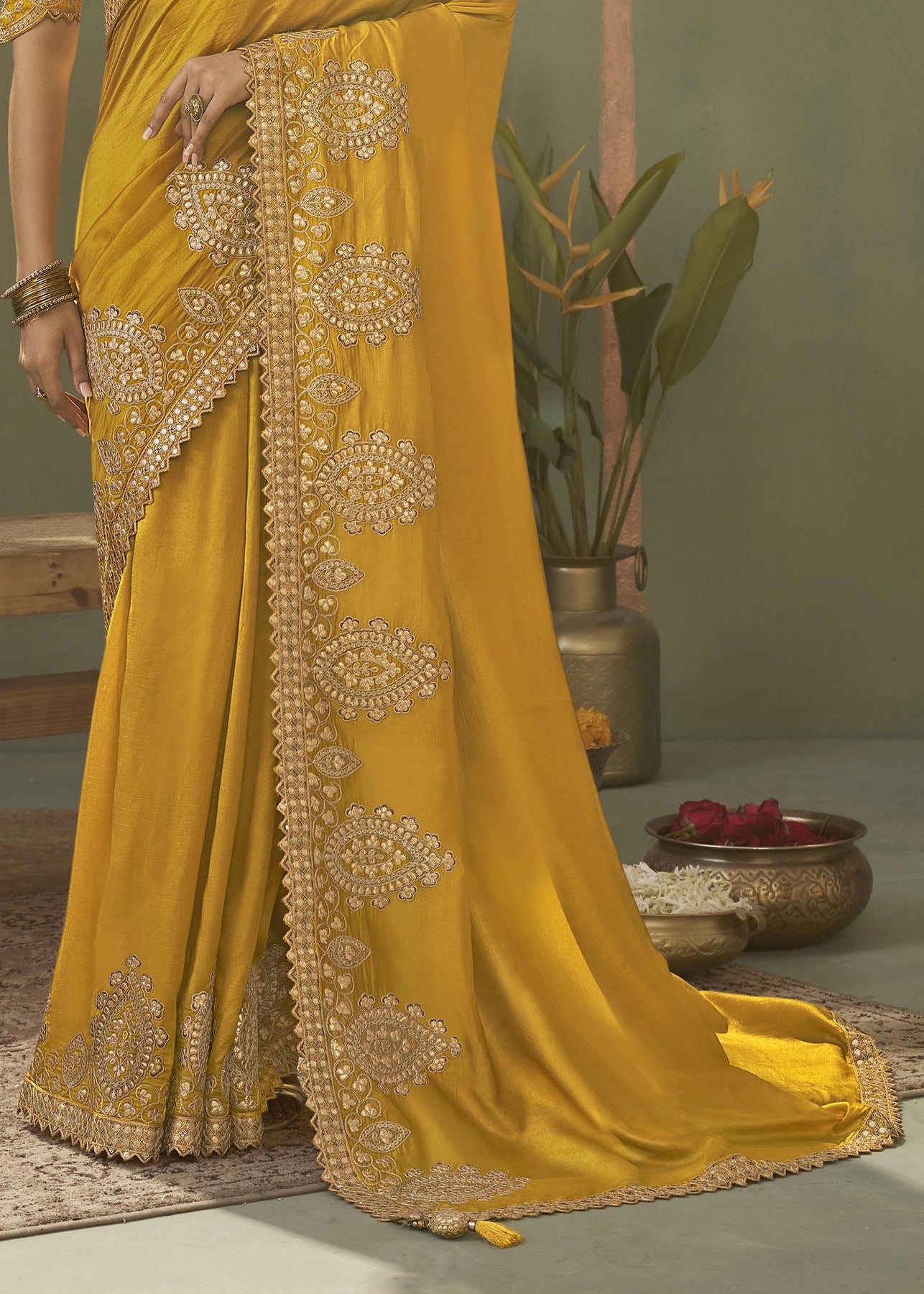 “Exclusive Offer” : Golden Yellow Woven Embroidered Silk Saree