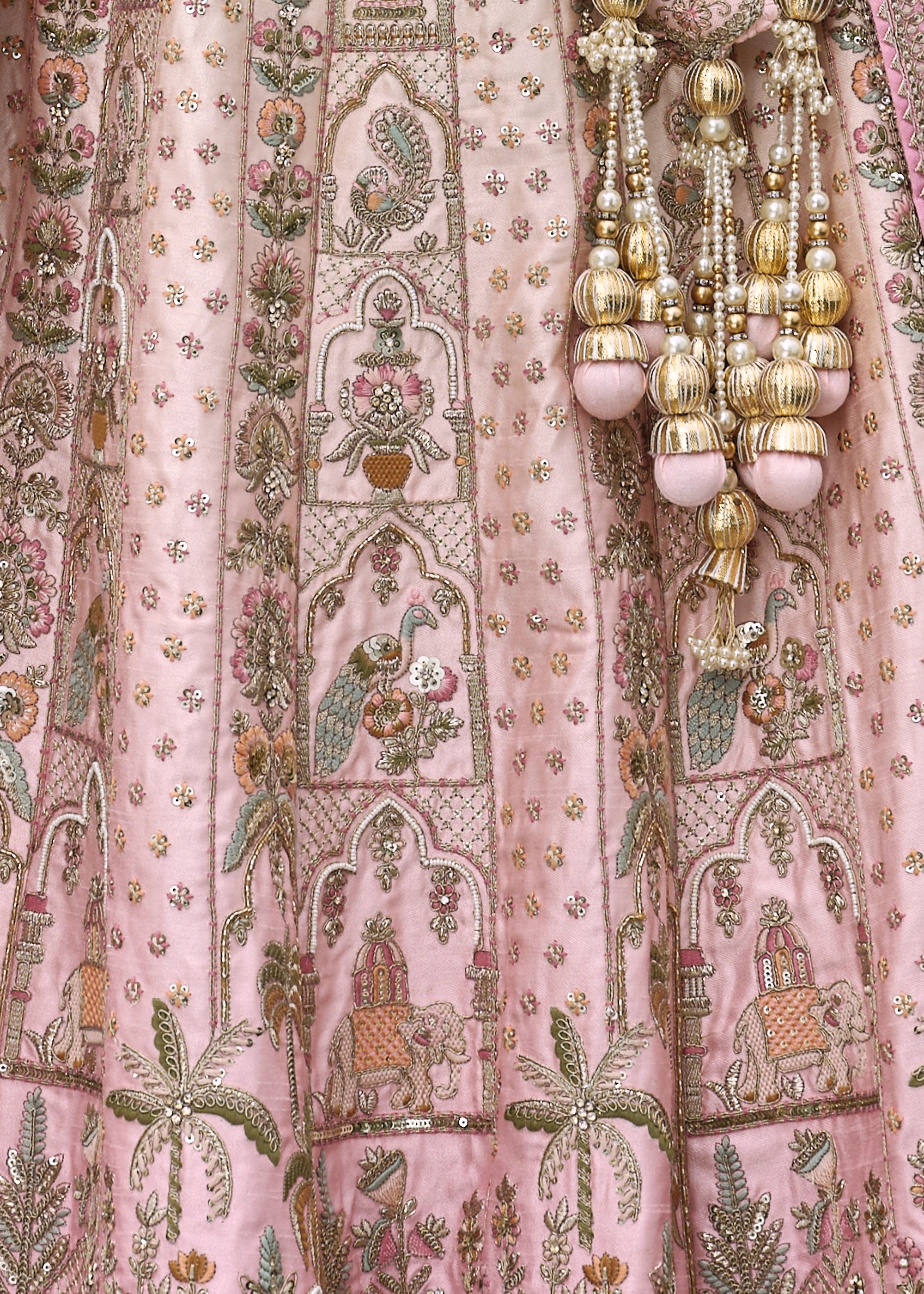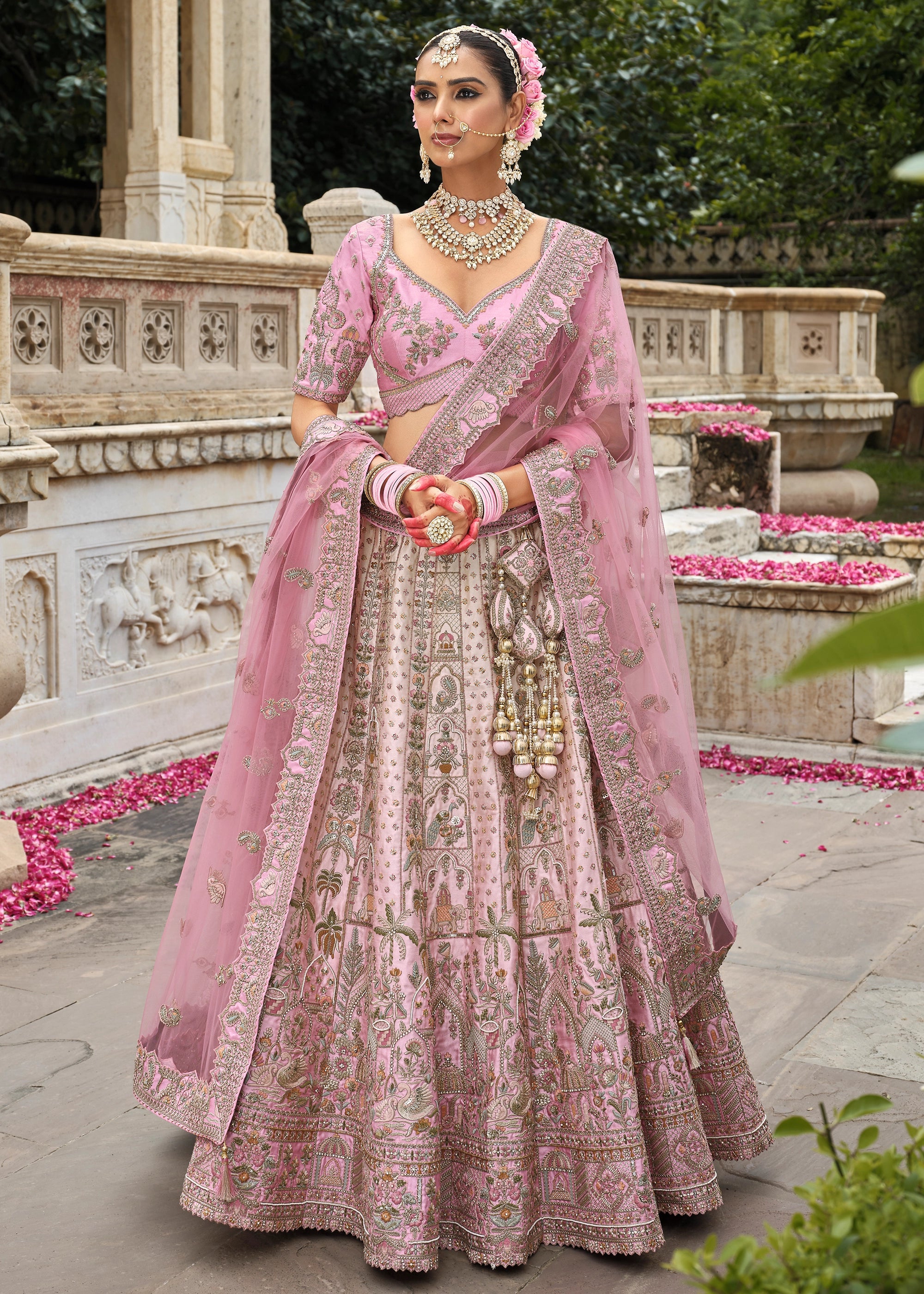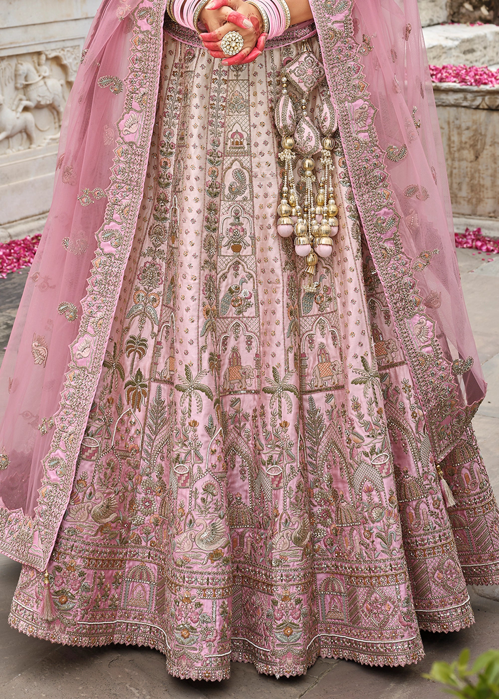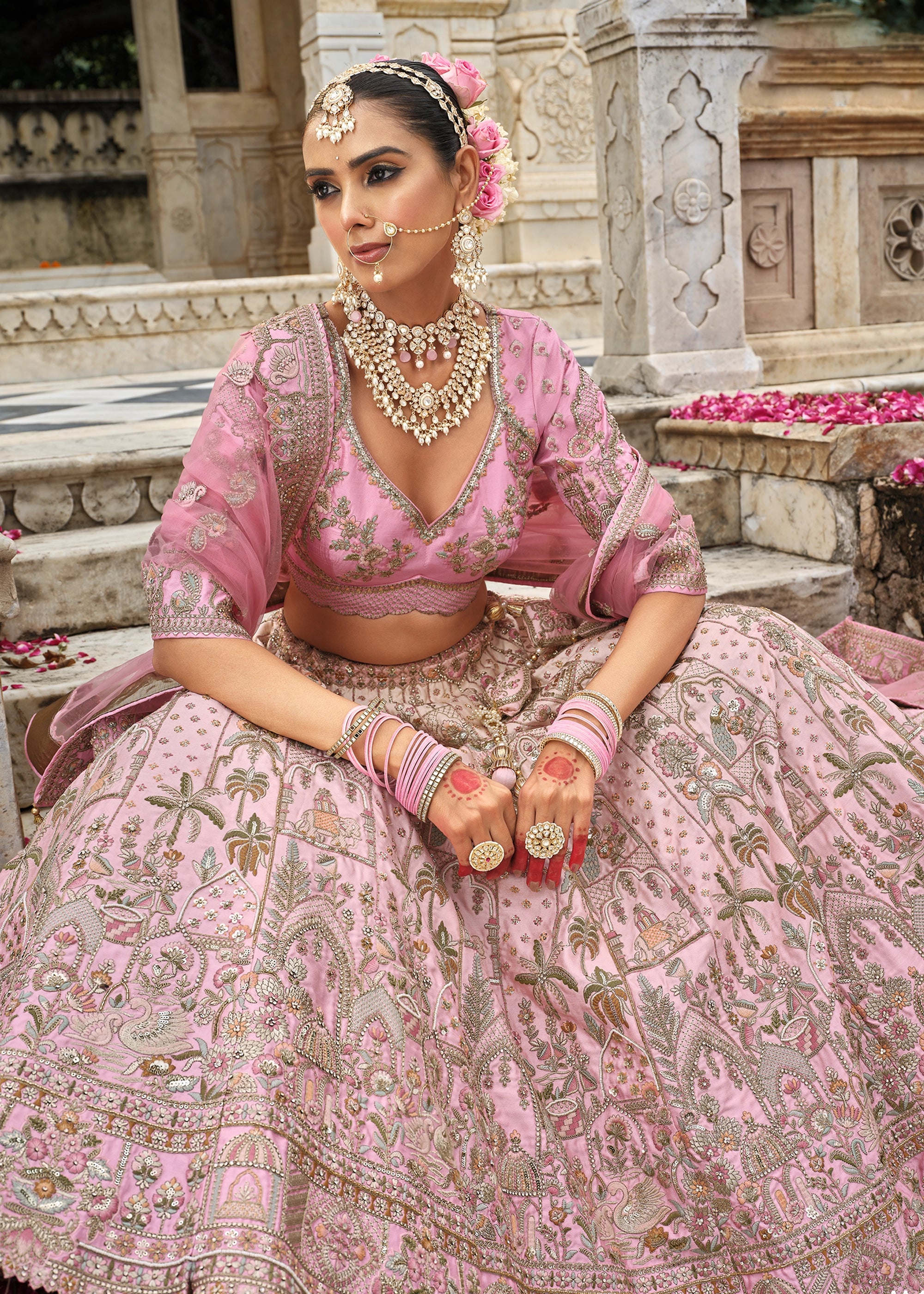 Dazzle in our exquisite bridal lehenga! Crafted from heavy bridal silk with intricate Khatli embroidery and rich work. Paired with a matching silk blouse and delicate net dupatta.