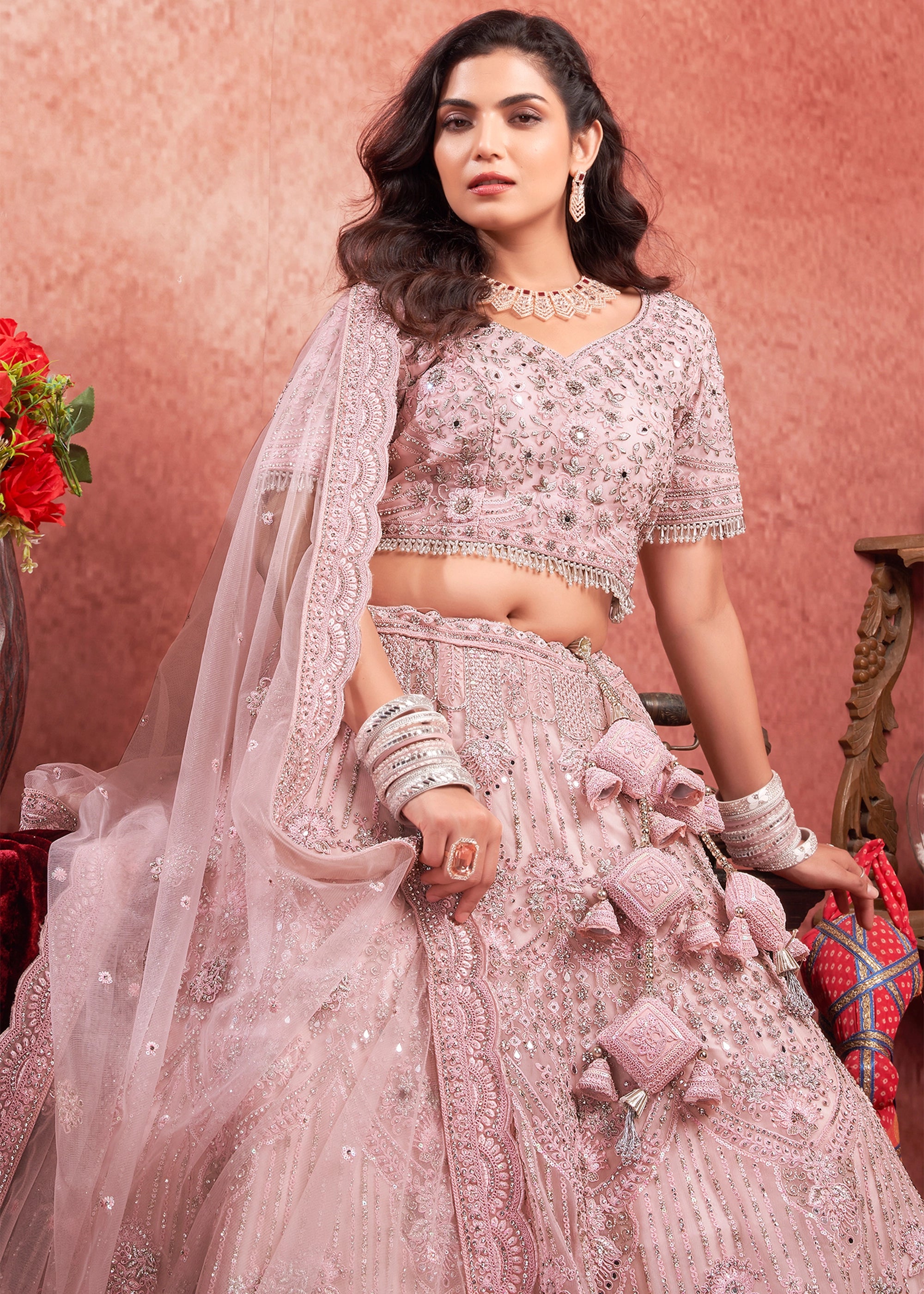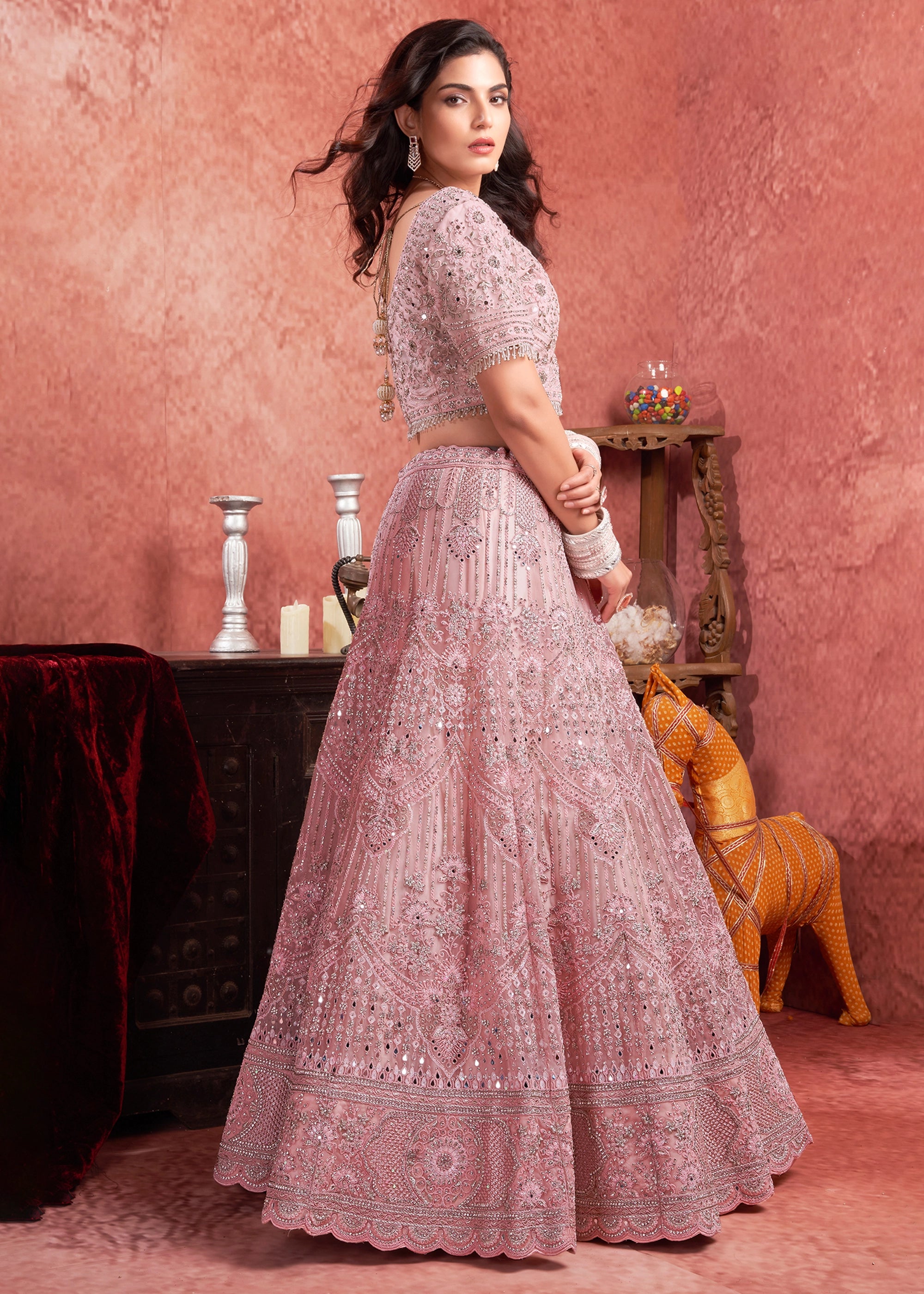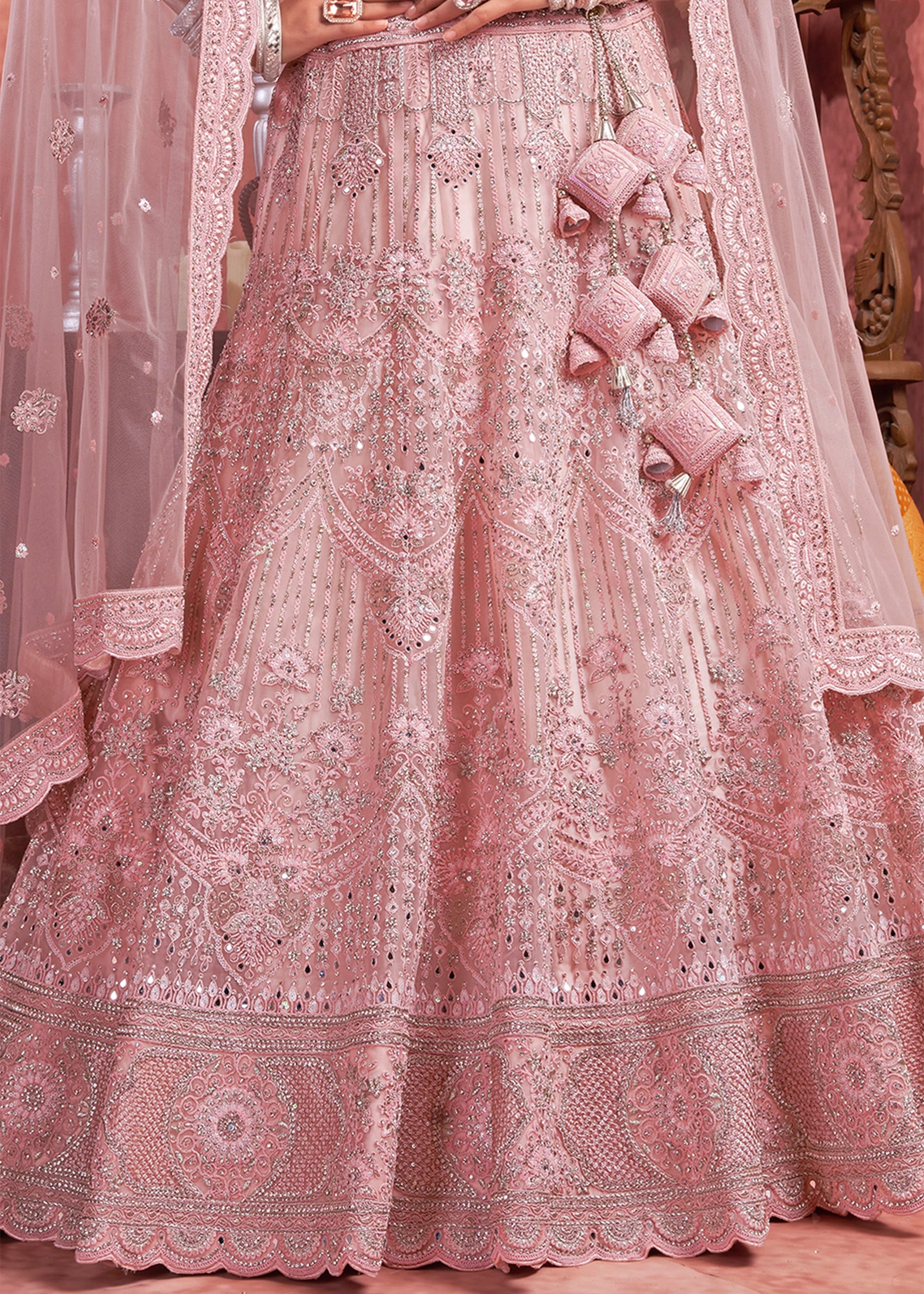 Embrace ethereal elegance with this exquisite premium net lehenga choli set. Featuring meticulous zarkan and mirror handwork, it is perfect for weddings, engagements, or sangeet.