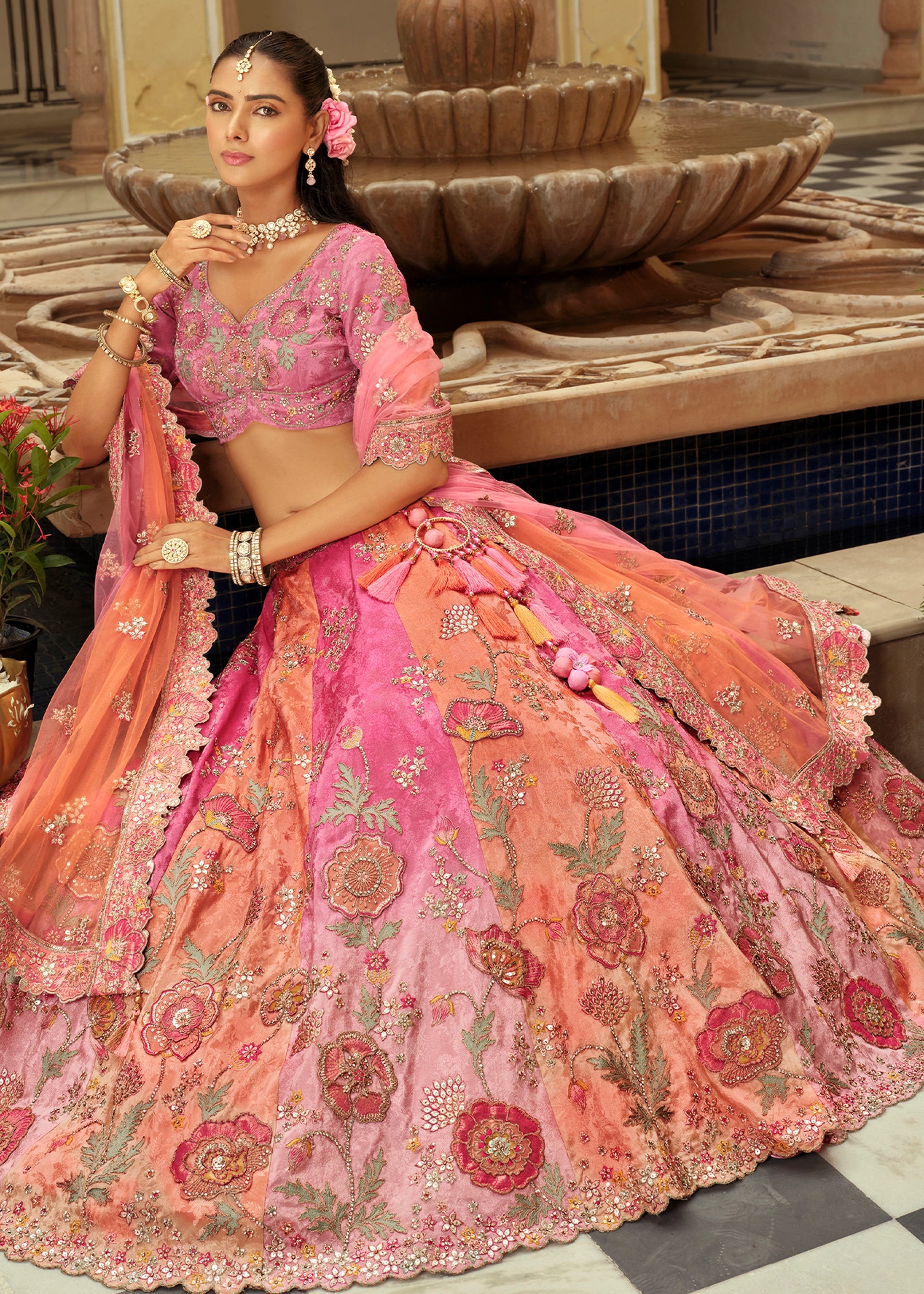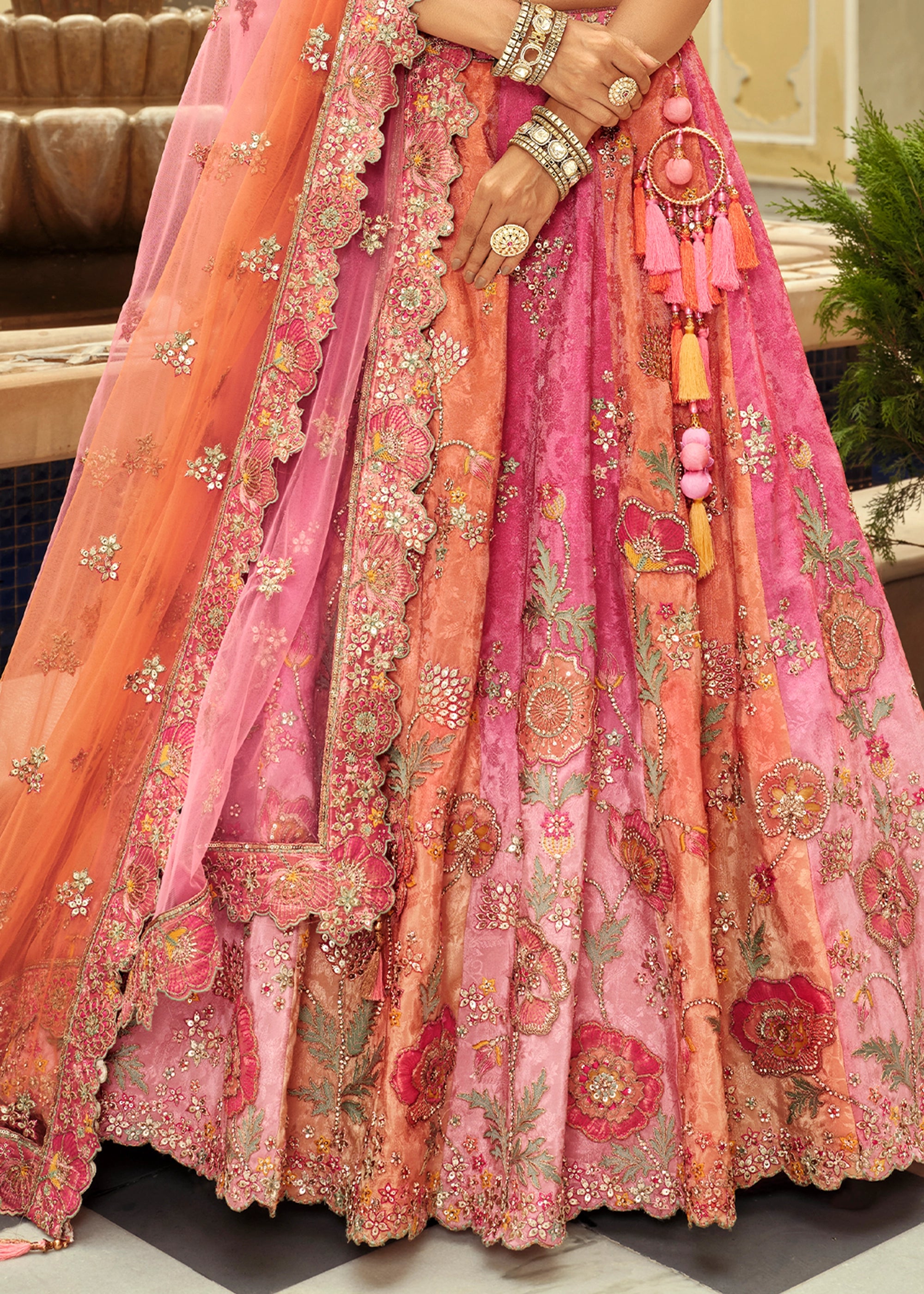 This elegant lehenga set with dupatta features intricate floral embroidery on silk fabric, blending tradition and modern style perfectly.