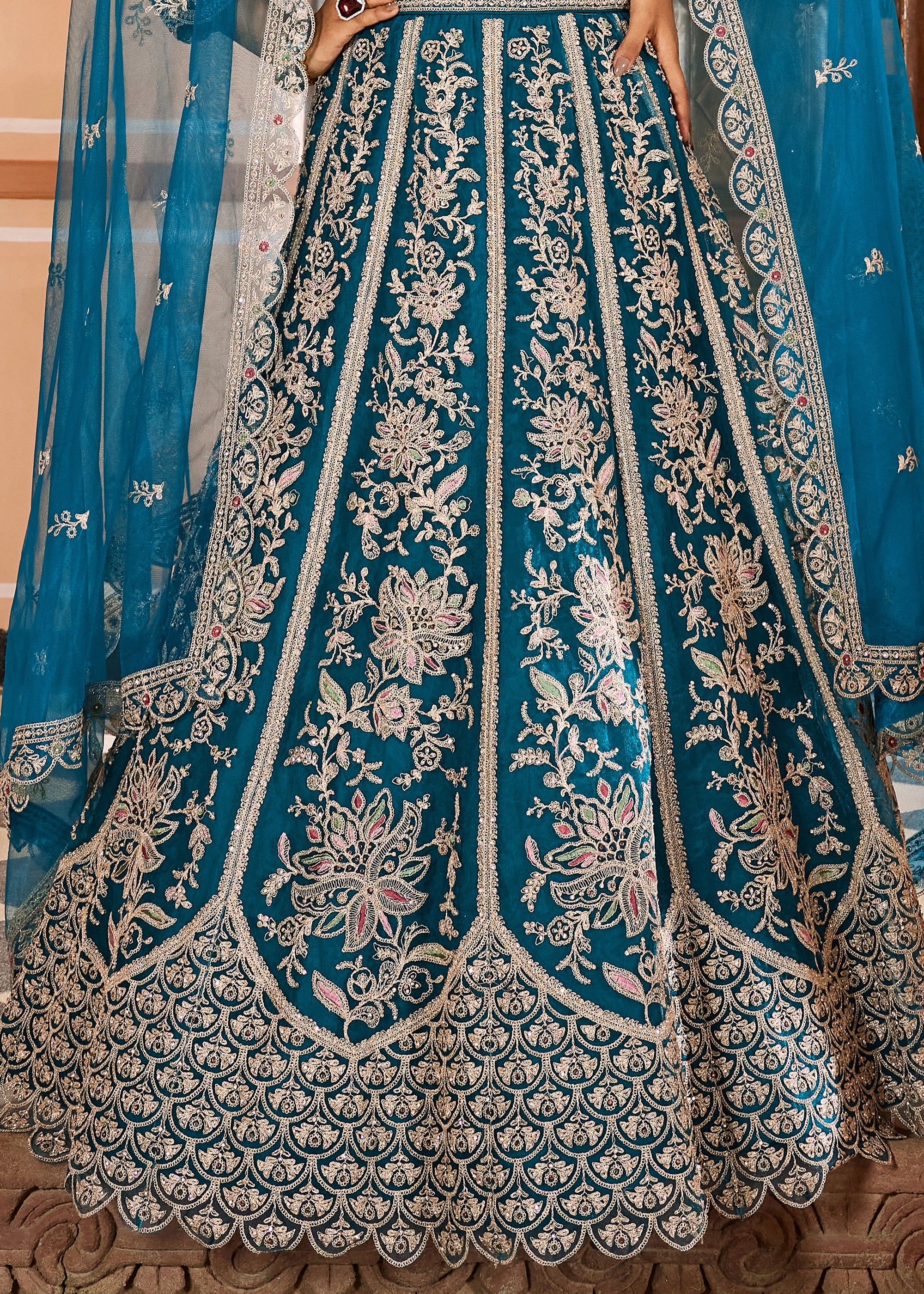 Lehenga Detail: Full 4M Flair; Thread Cutwork Border on hemline.