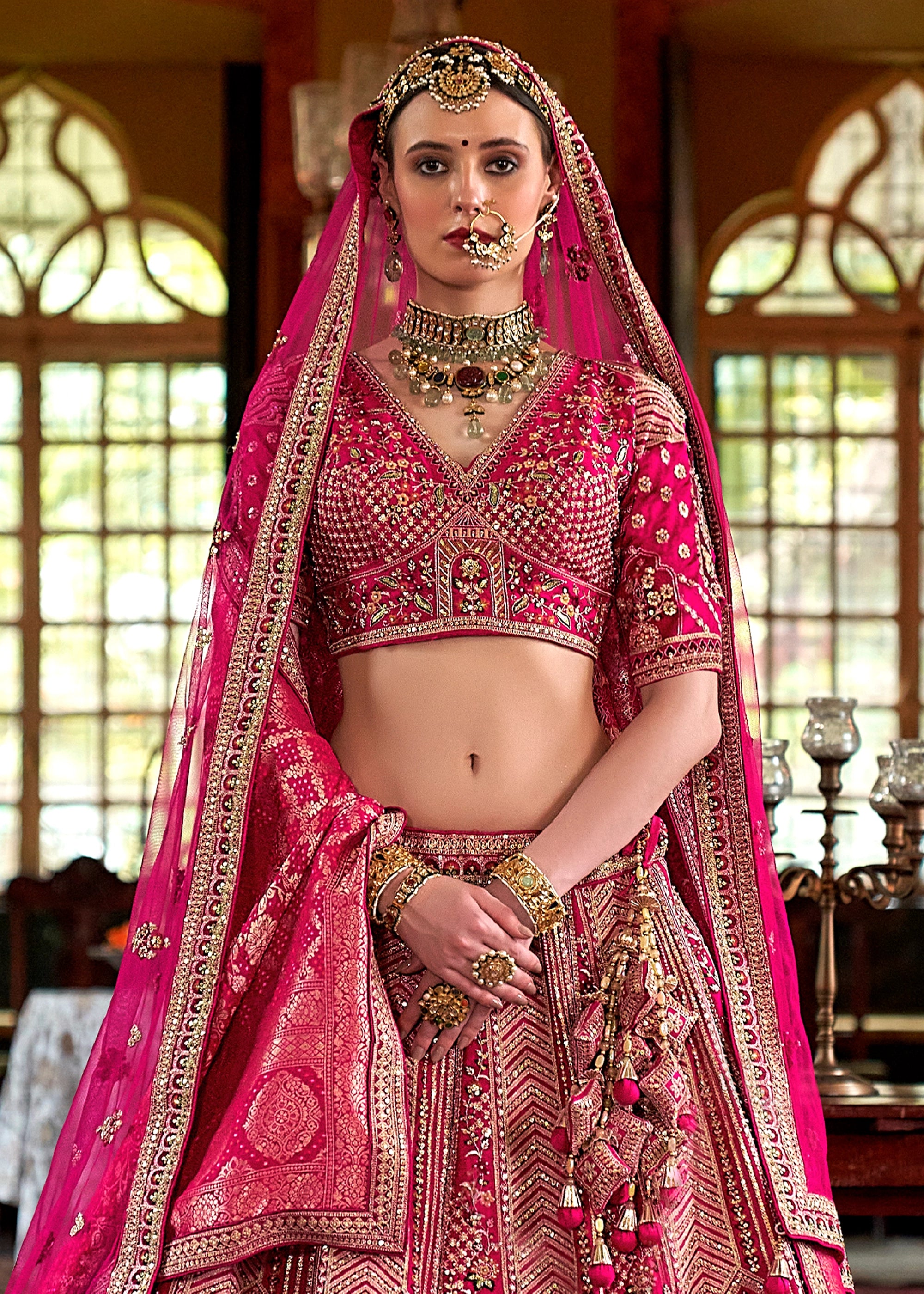 This bridal lehenga is crafted from silk with intricate zari, sequins, and thread embroidery. The ensemble features a heavy...