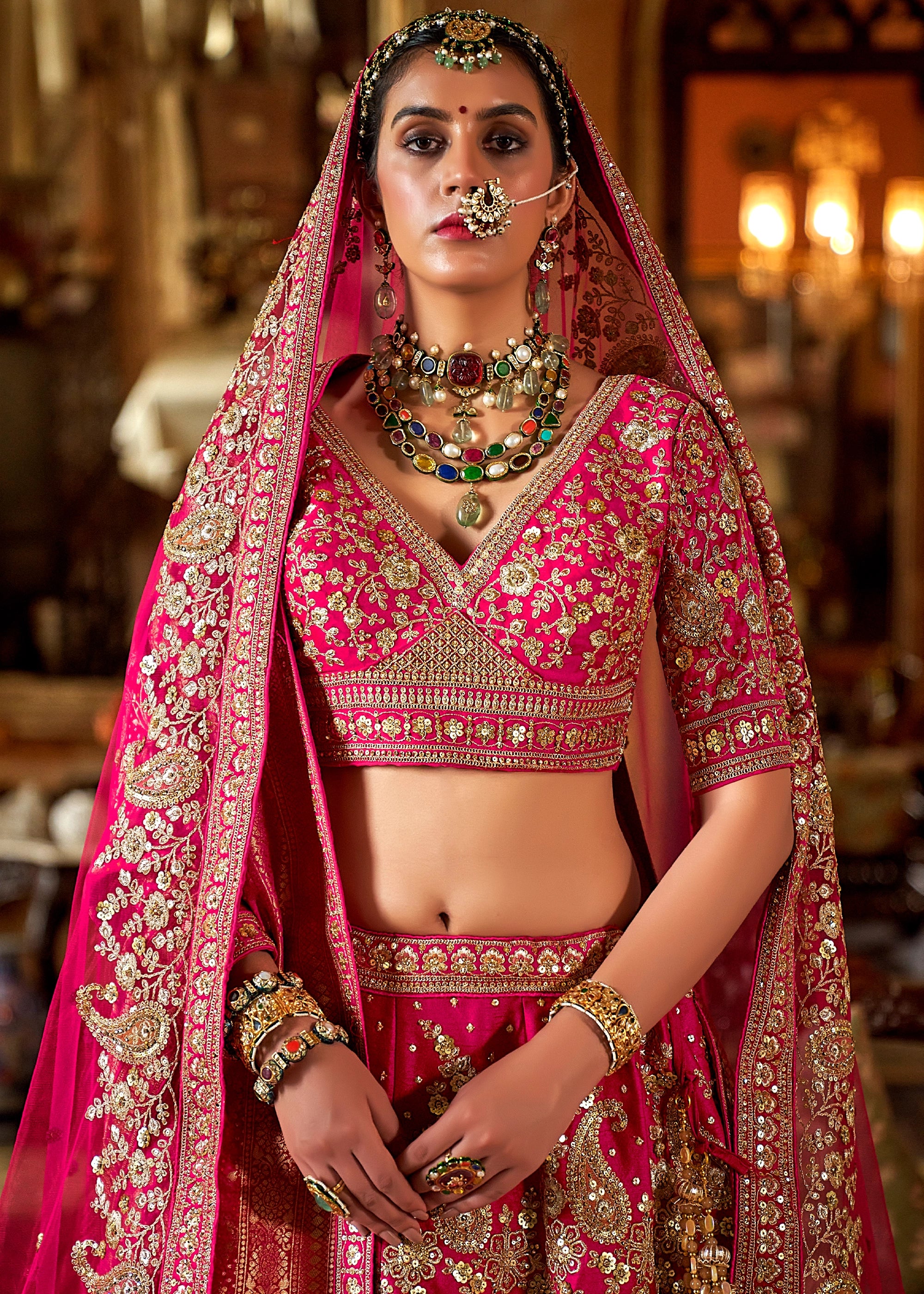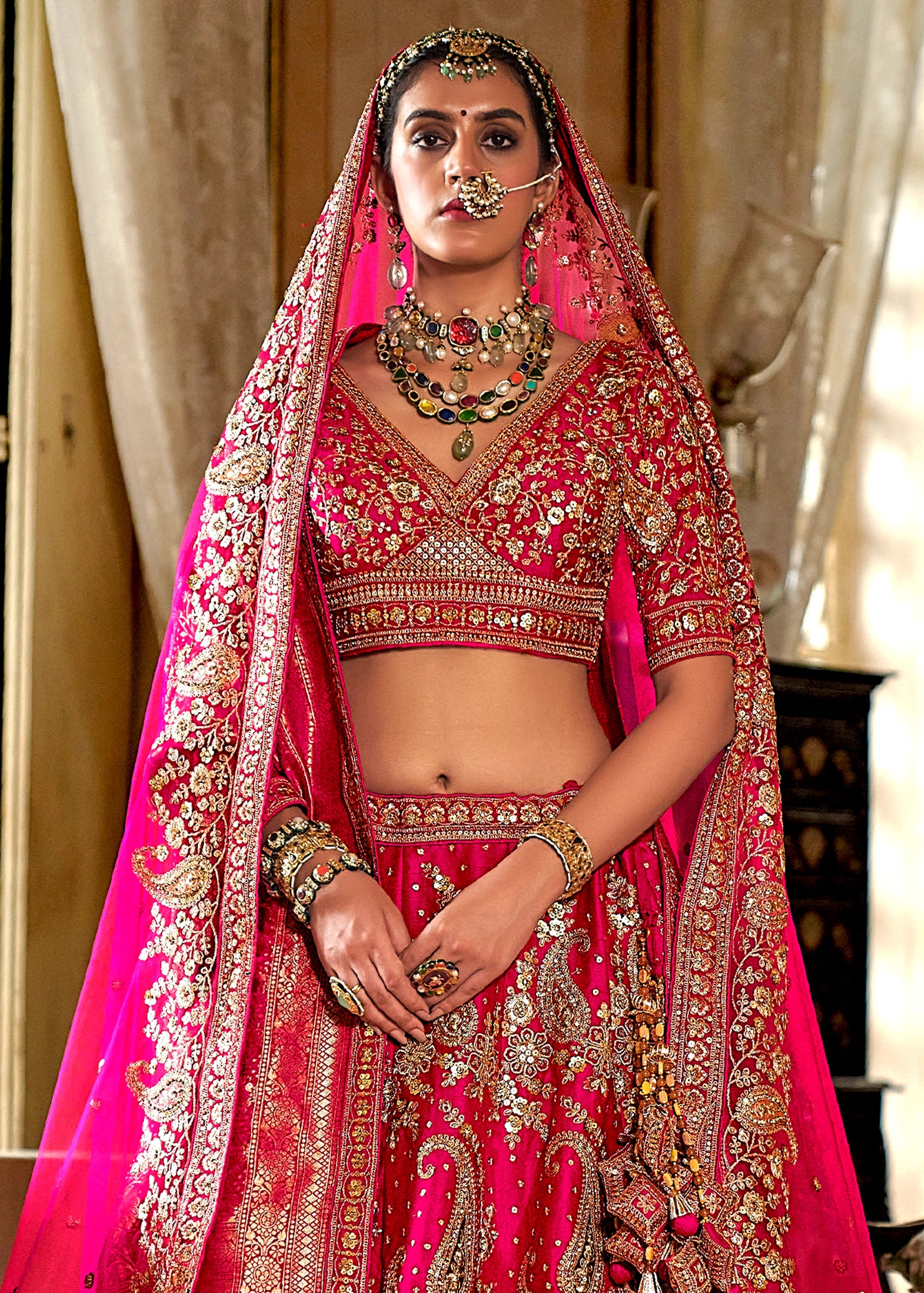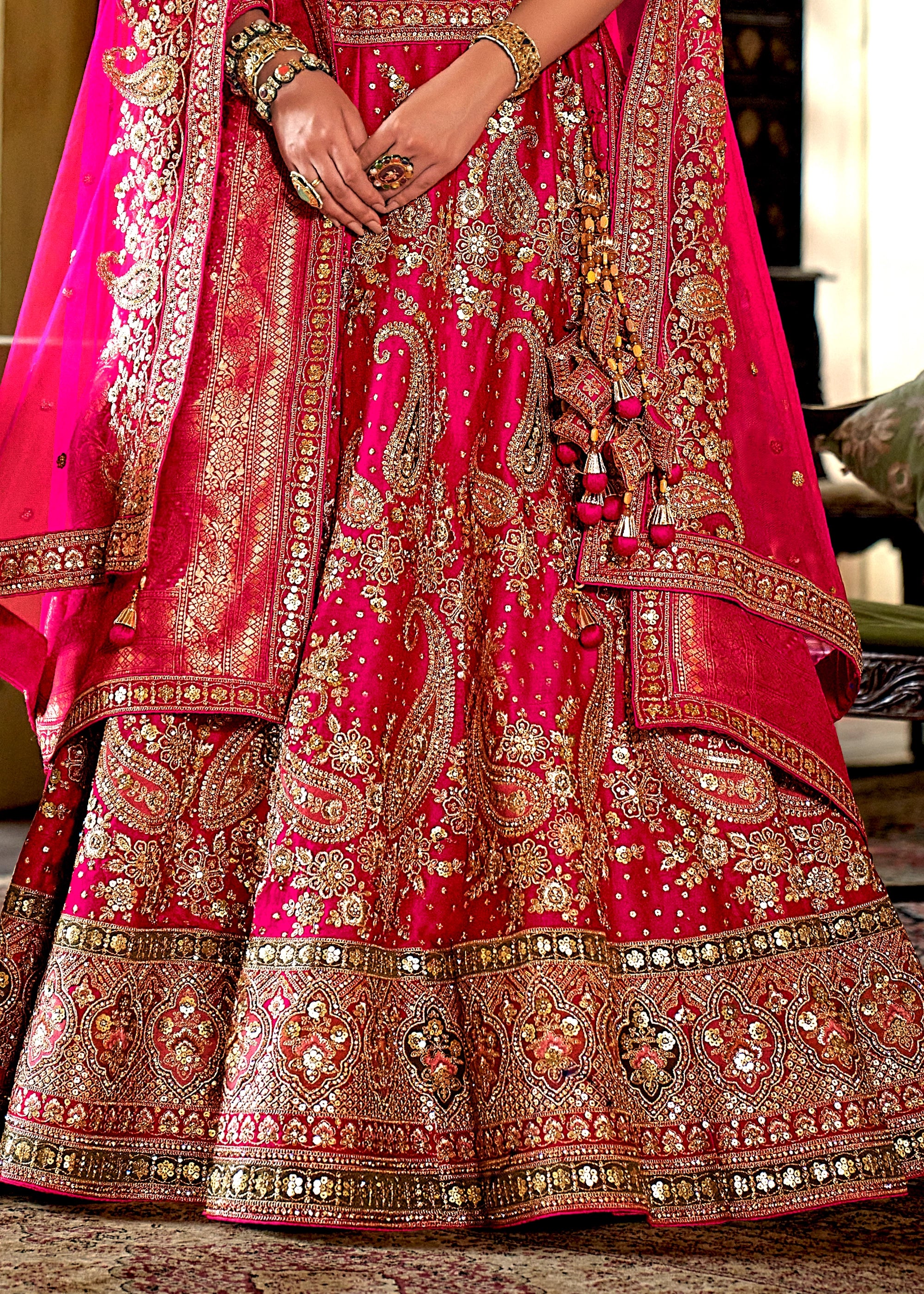 This bridal lehenga is crafted from silk with intricate zari, sequins, and thread embroidery. The ensemble features a heavy...
