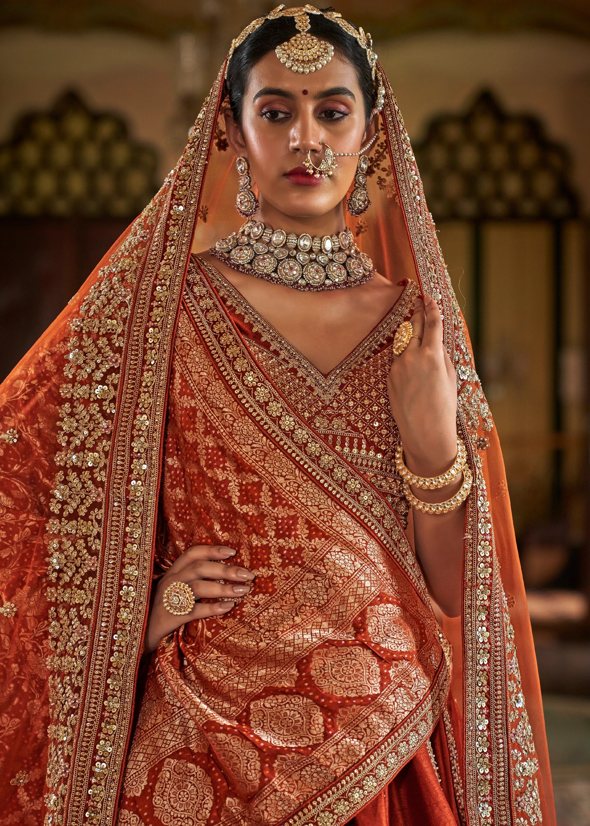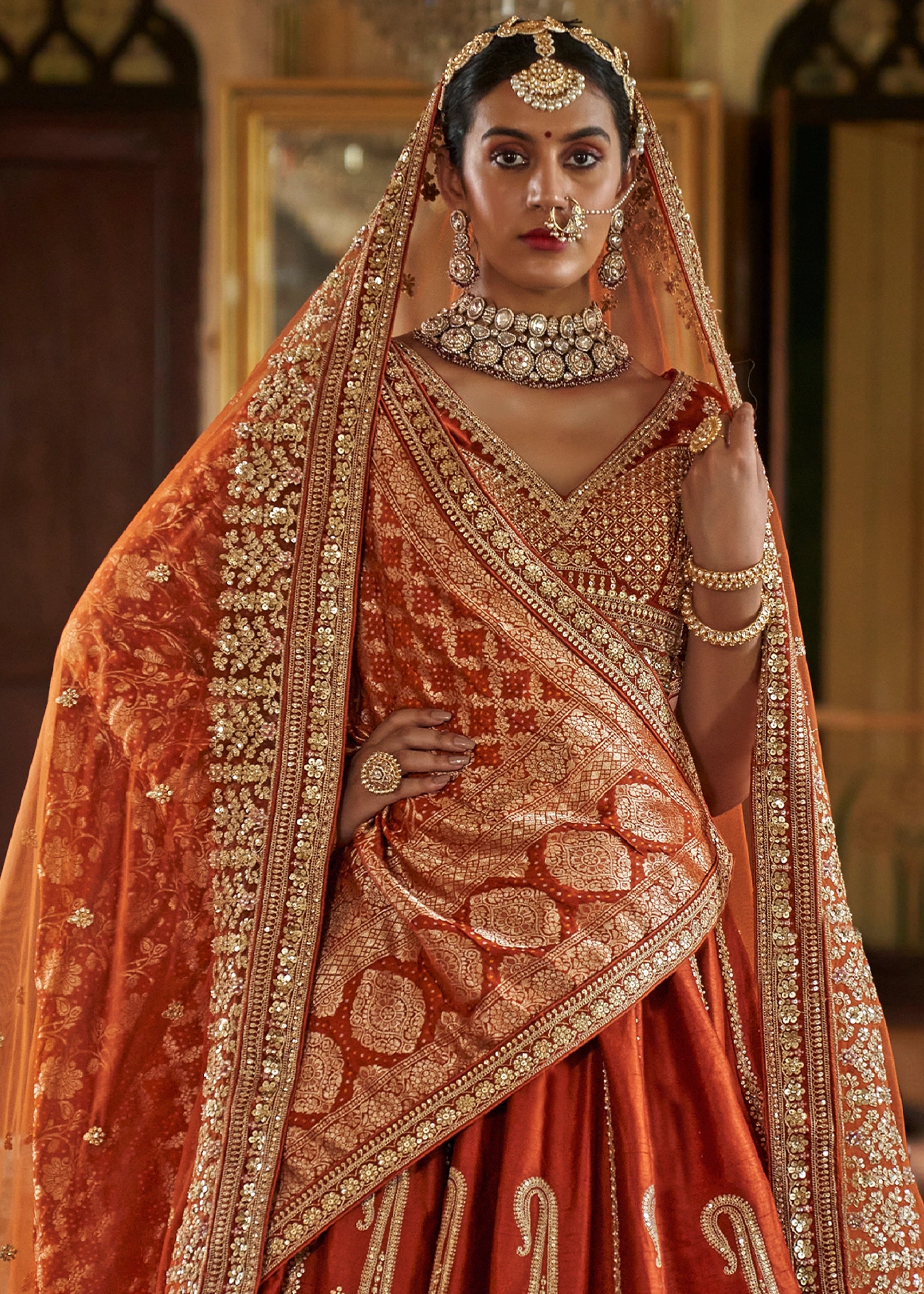 Rust Orange Heavy Embroidered Designer Lehenga