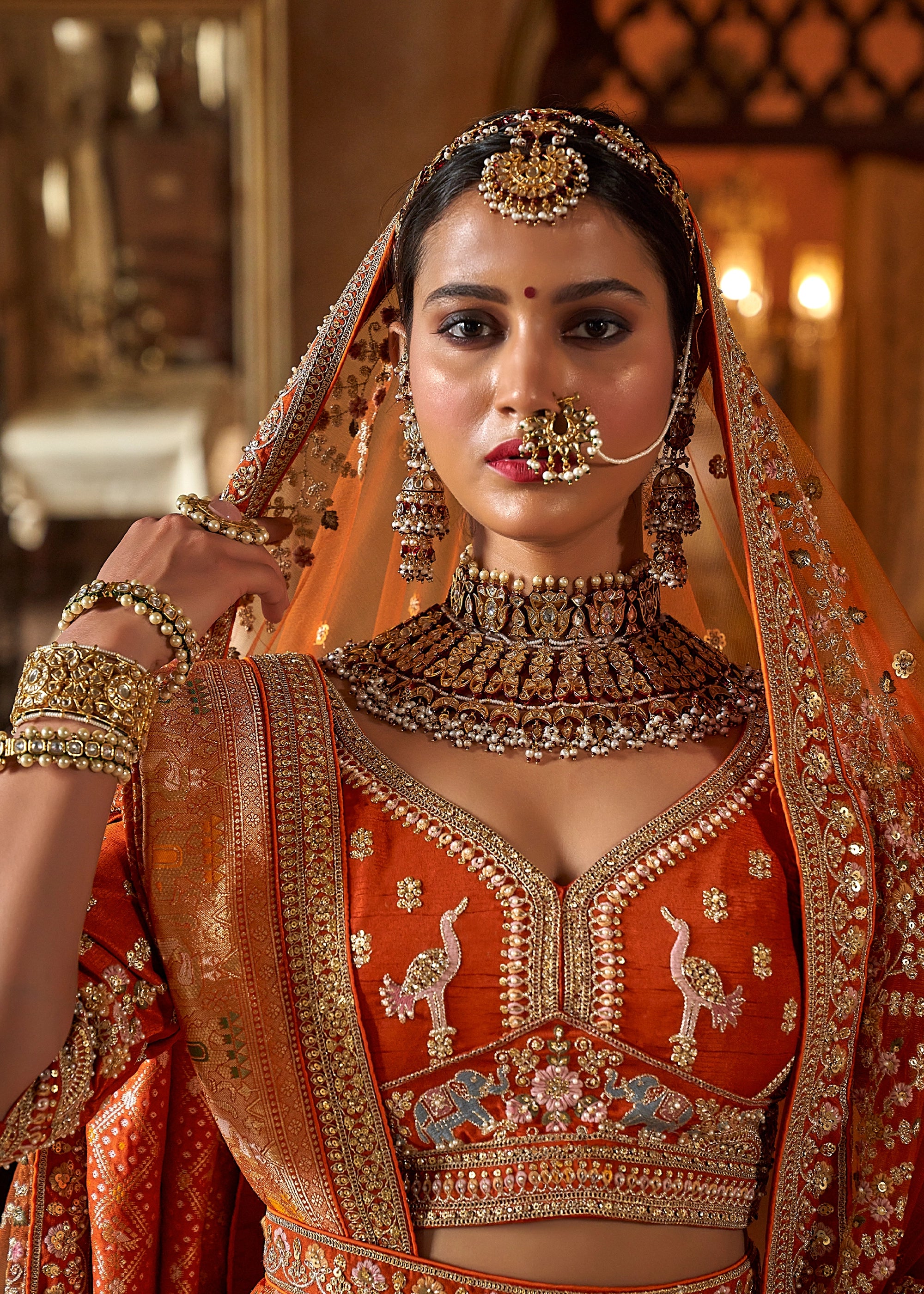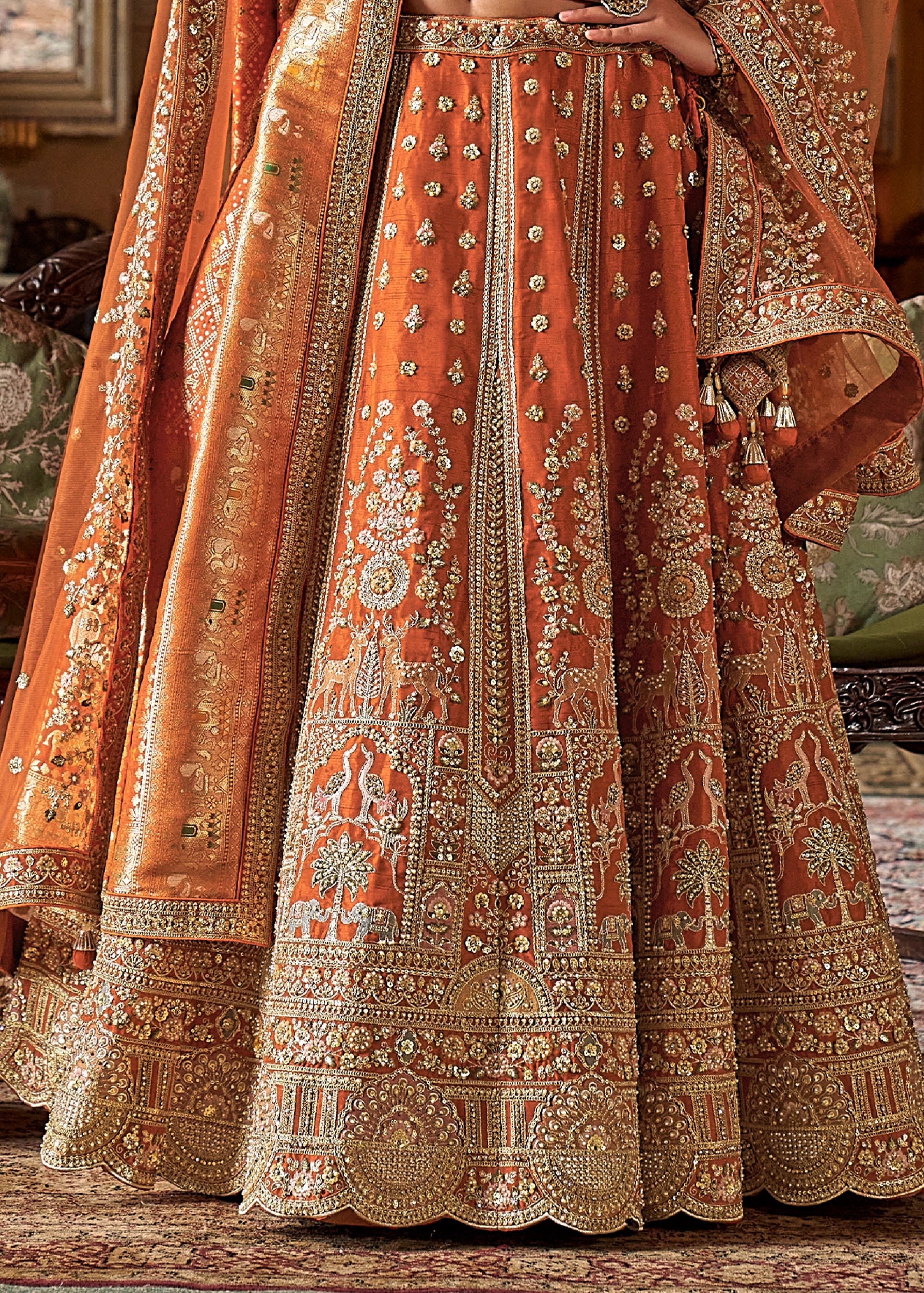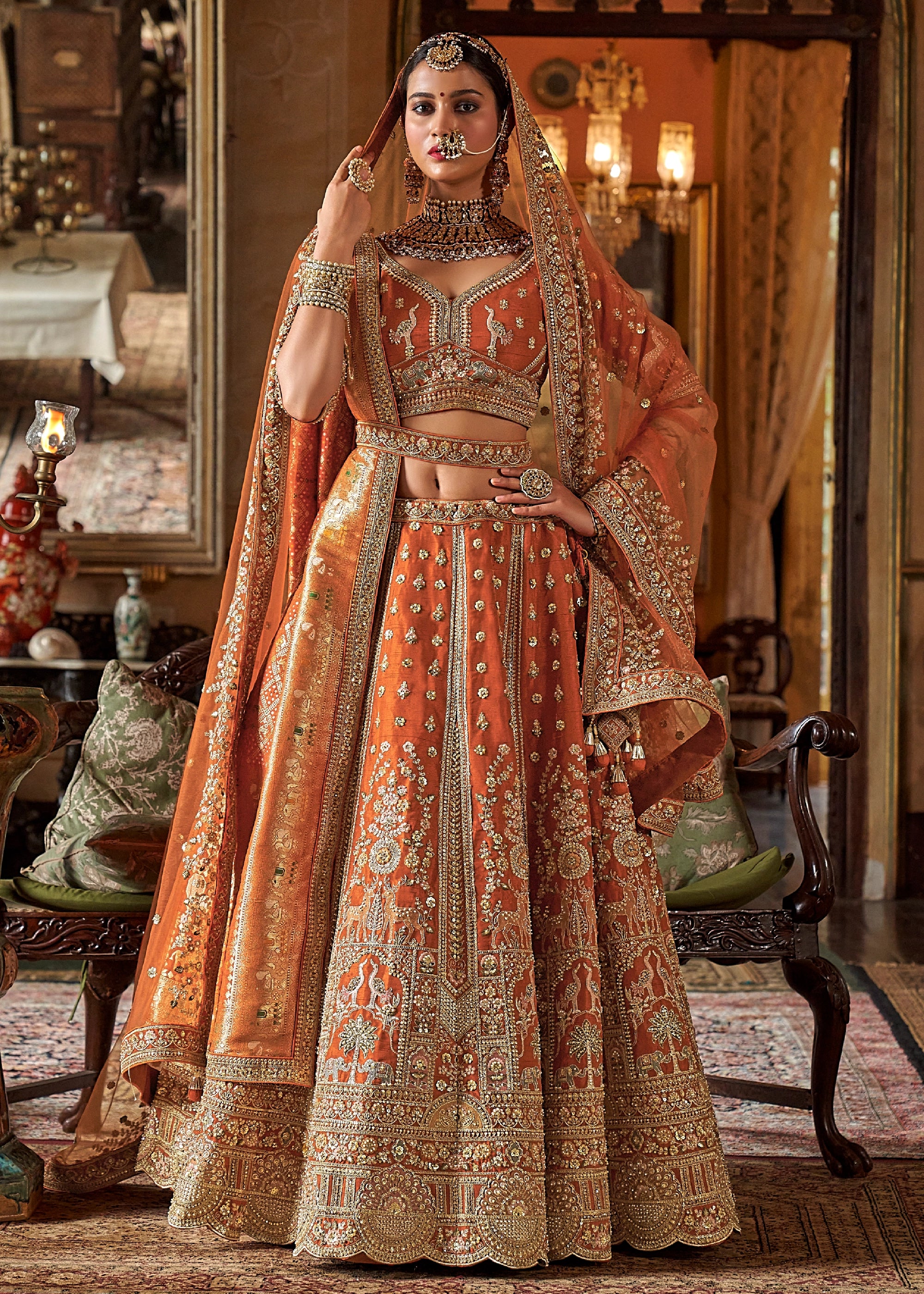 Rust Orange Heavy Embroidered Designer Lehenga