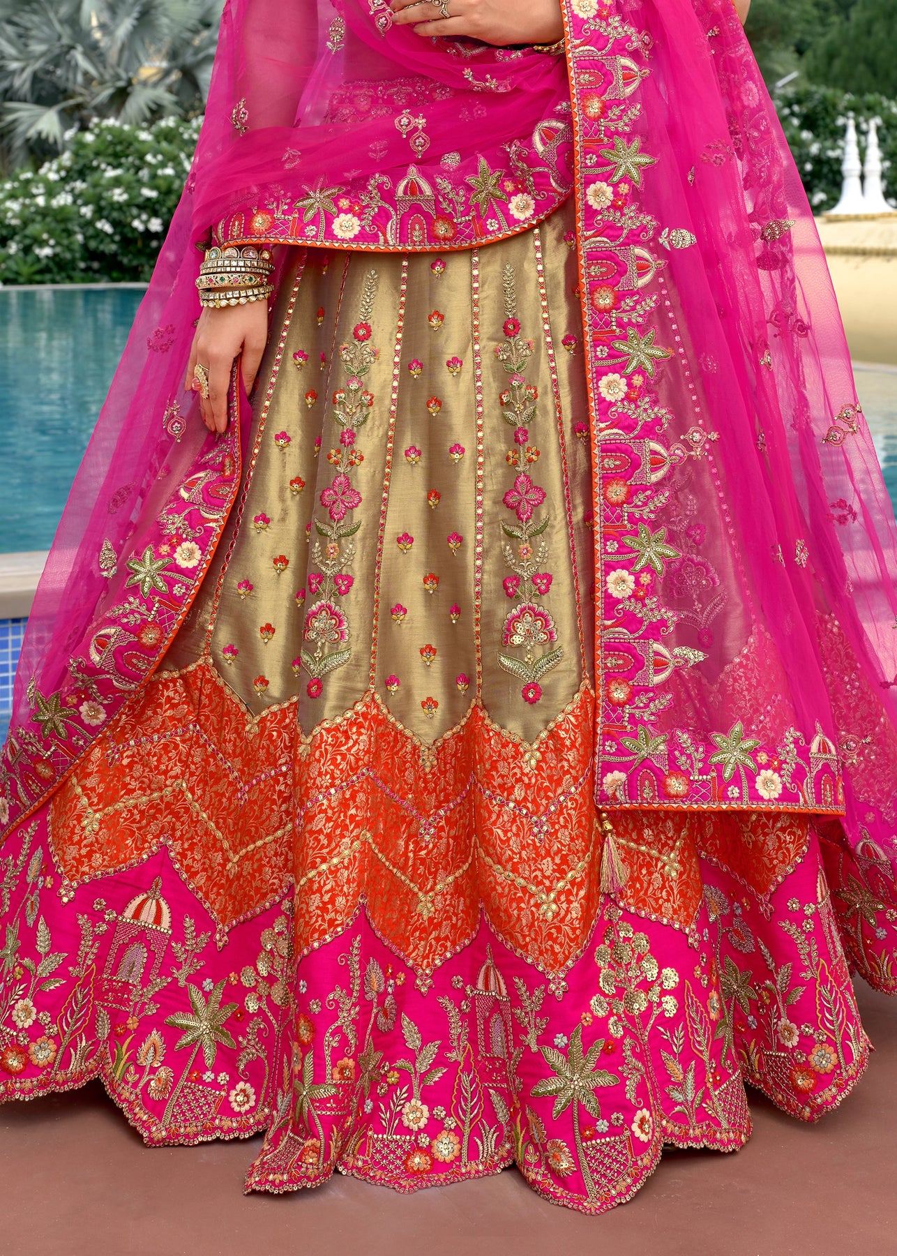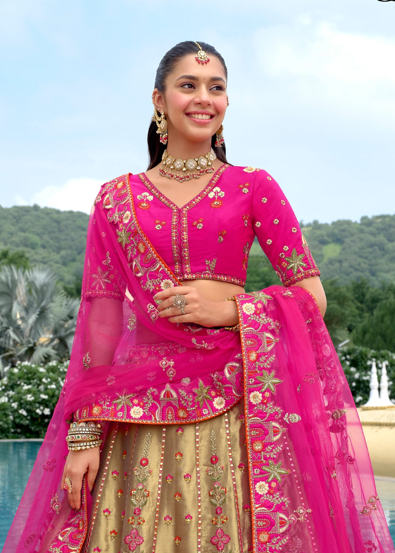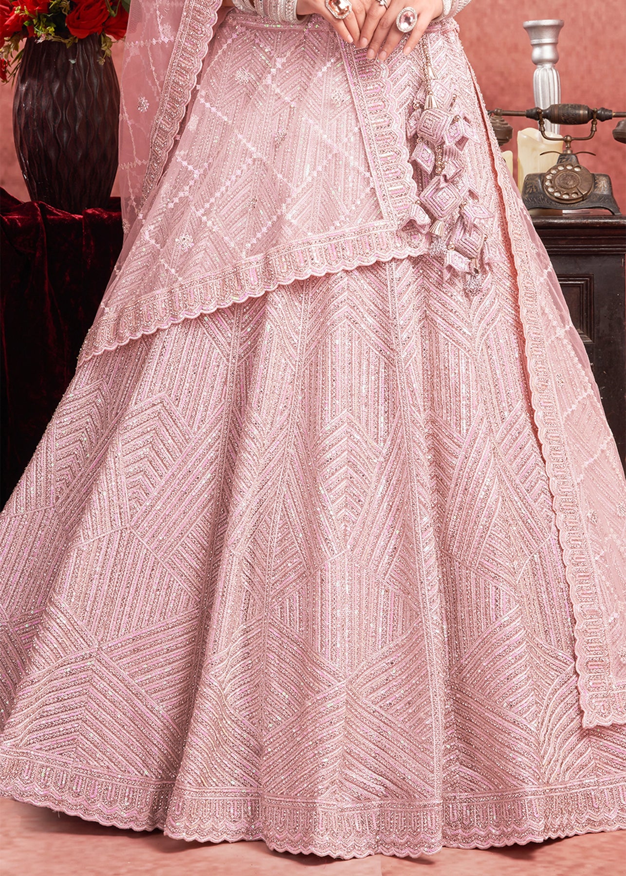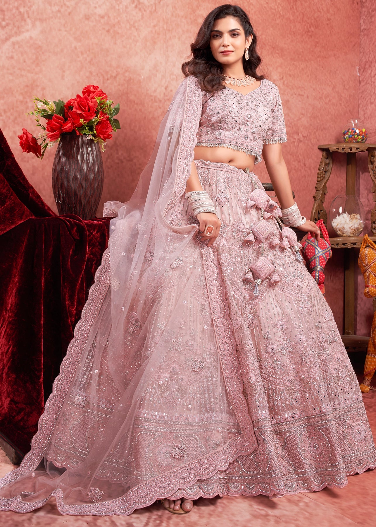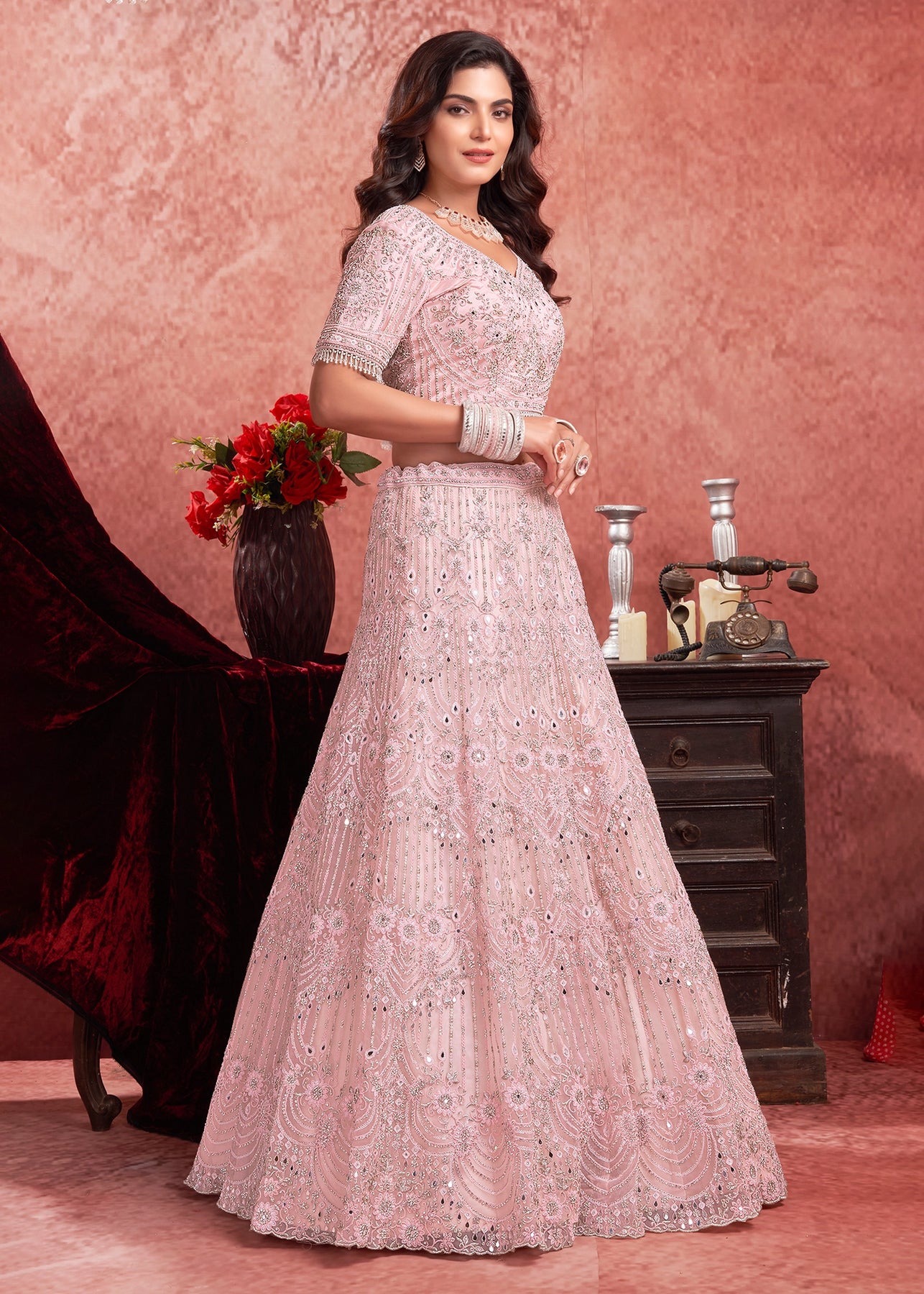 Adorn yourself in this gorgeous Fancy Silk Lehenga, featuring all-over designer embroidery, intricate Cut Work border, stone, sequence, and mirror...