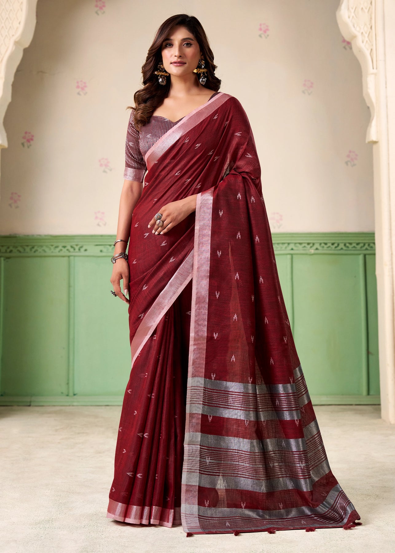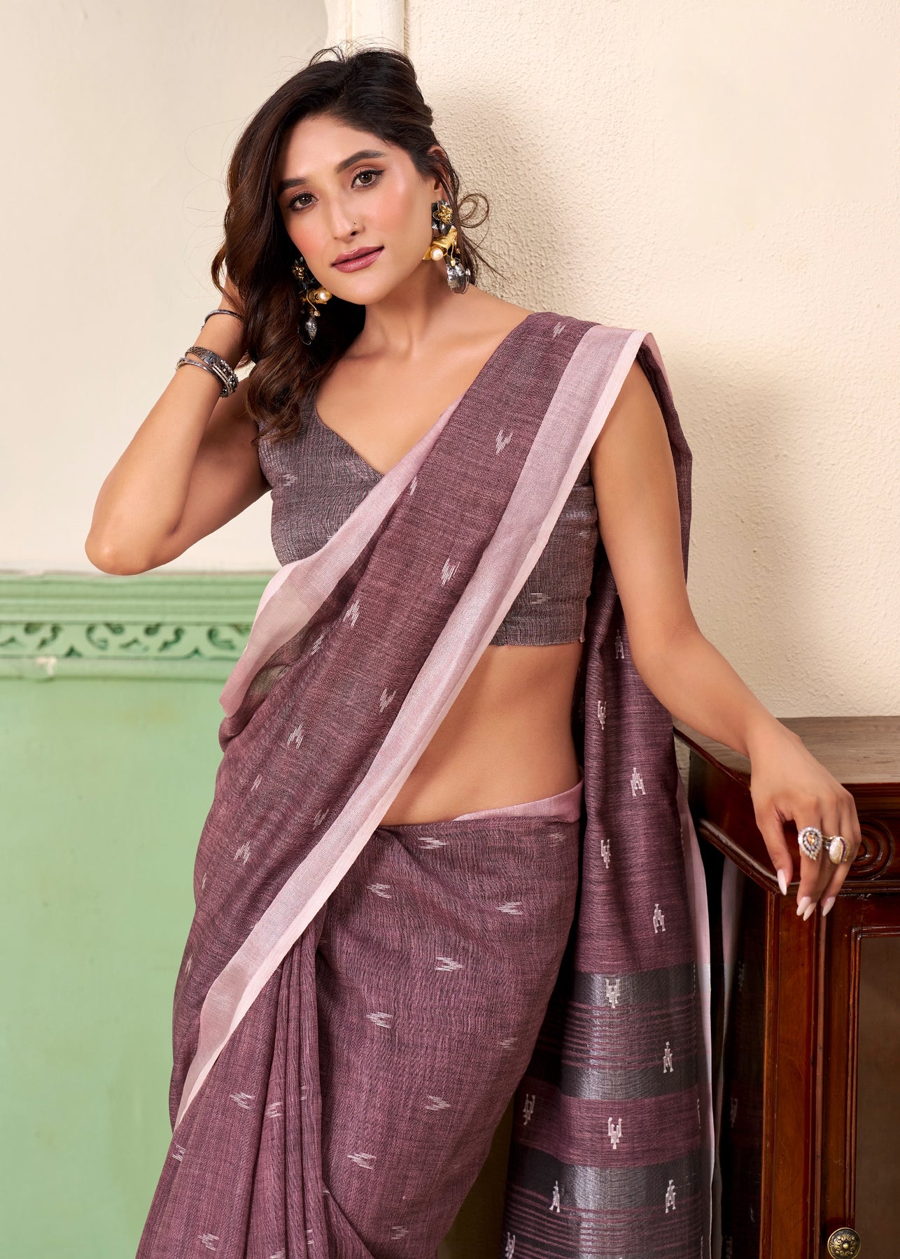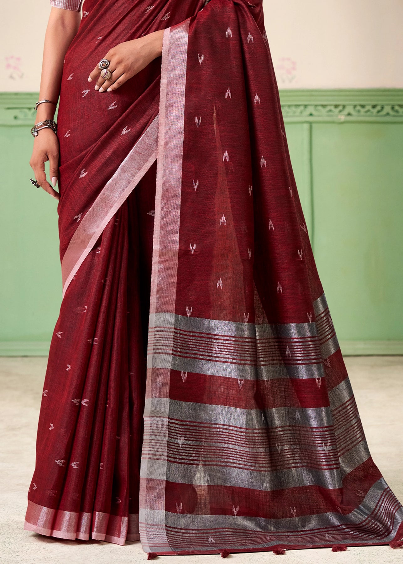 A unique amalgamation of linen silk saree to enhance with resham embroidered silver zari work with soothing feel to the body. suitable for all occasions.