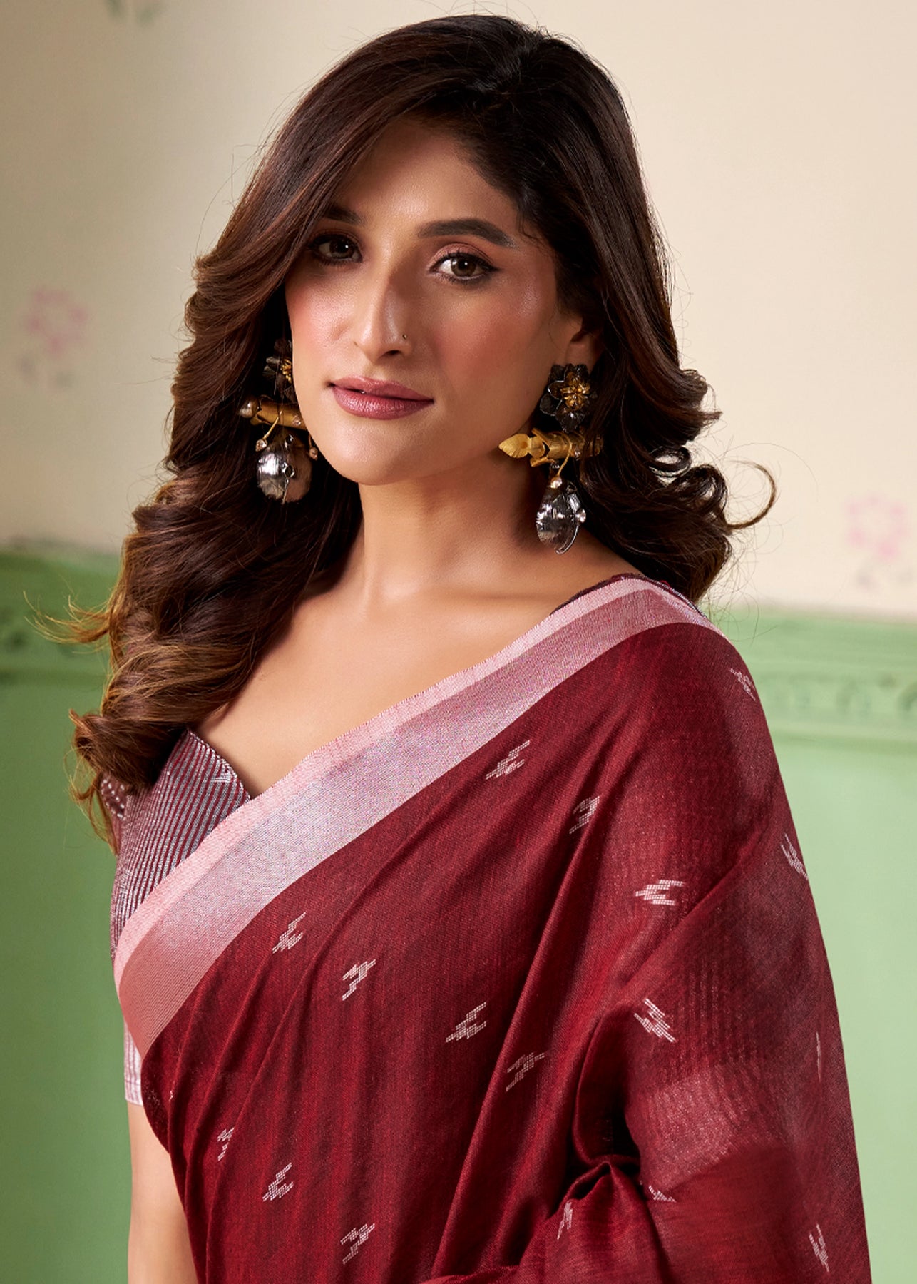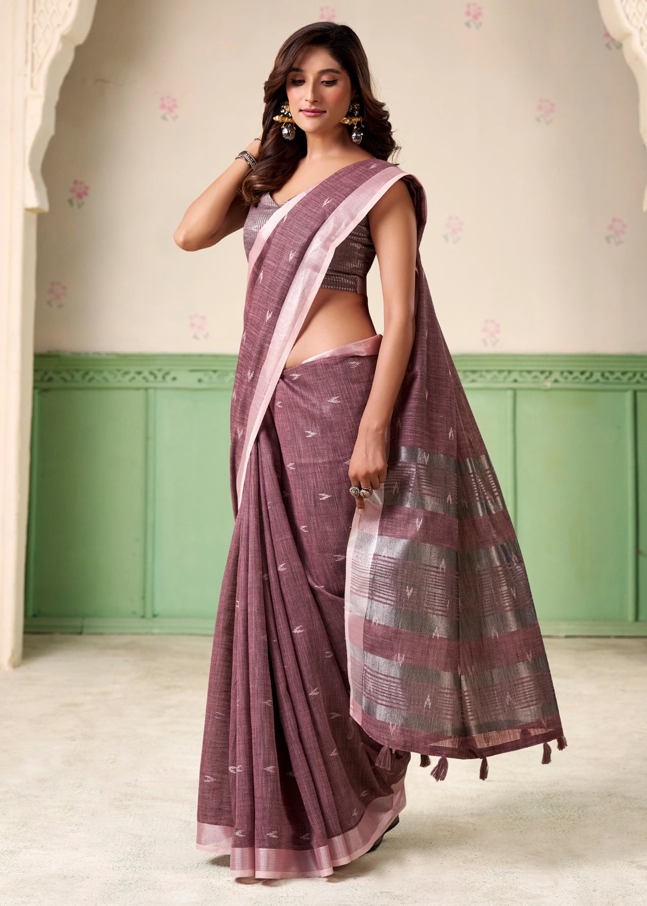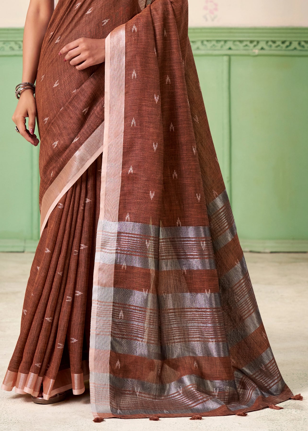A unique amalgamation of linen silk saree to enhance with resham embroidered silver zari work with soothing feel to the body. suitable for all occasions.