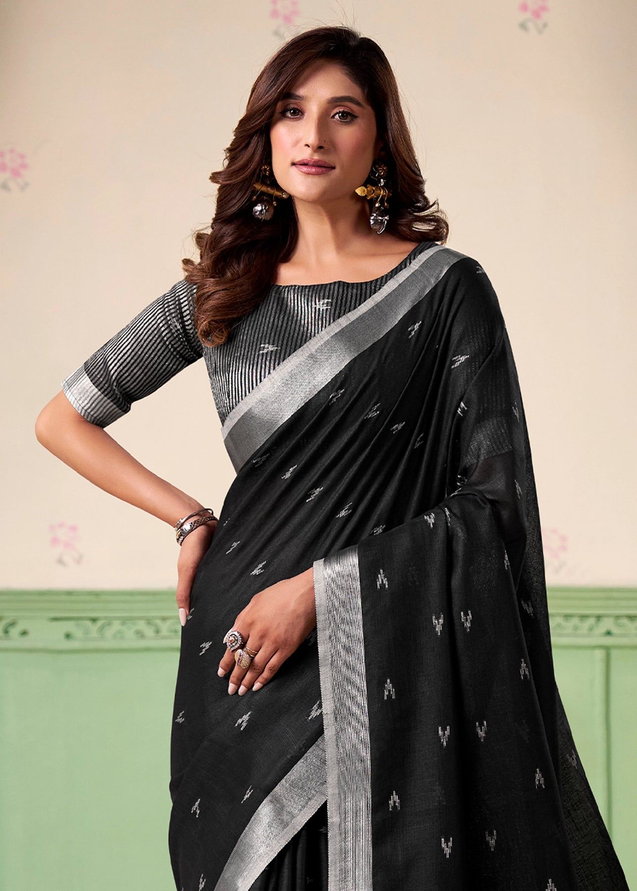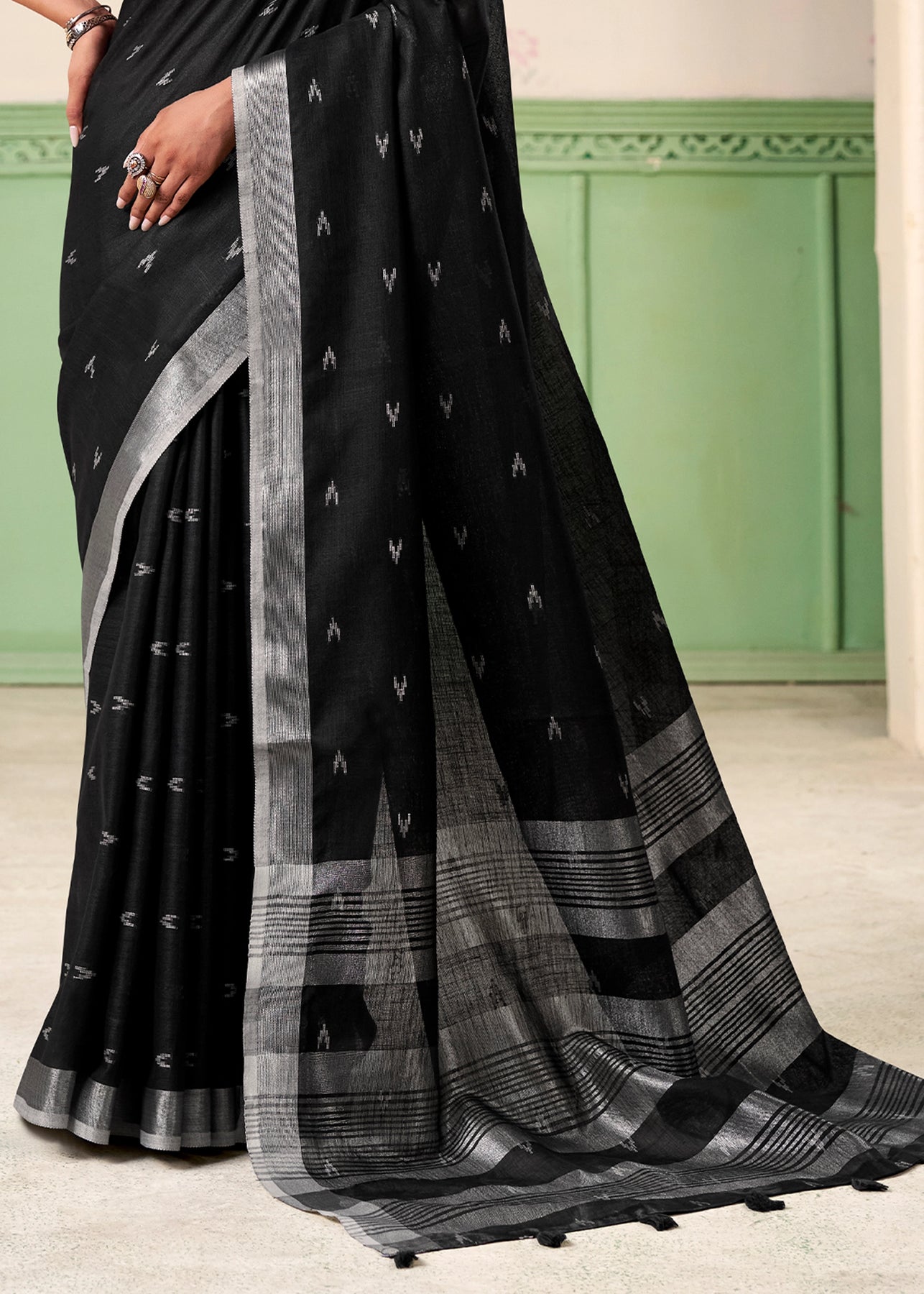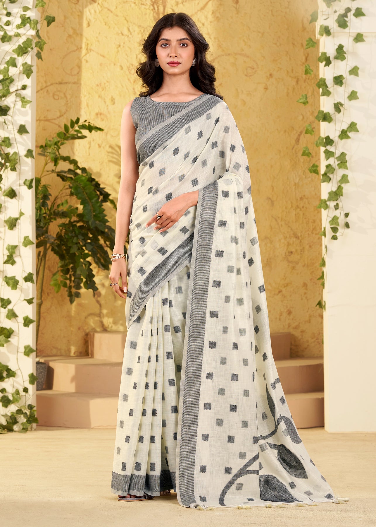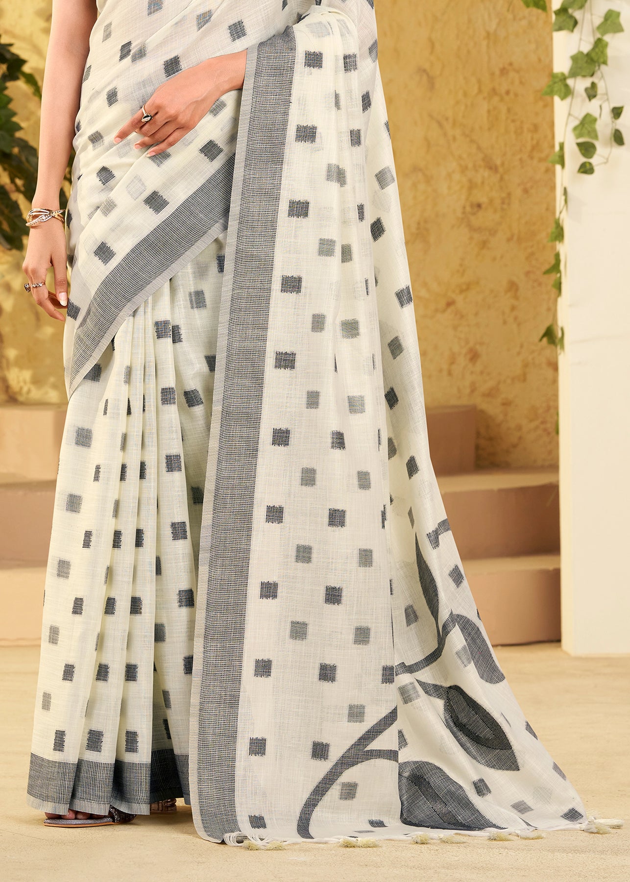 A unique amalgamation of linen silk saree to enhance with resham embroidered silver zari work with soothing feel to...