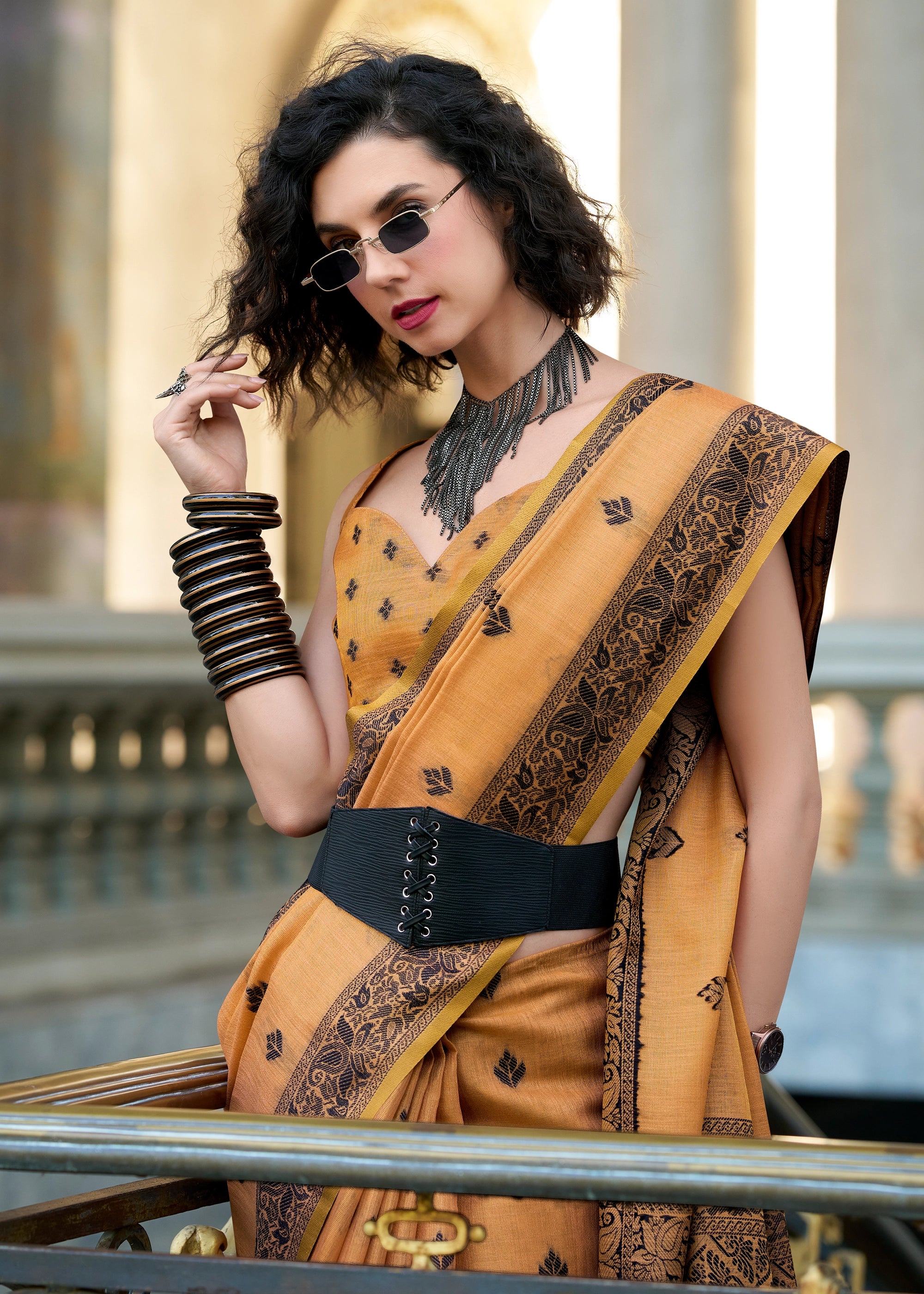 Dusky Orange Woven Tissue Linen Silk Saree