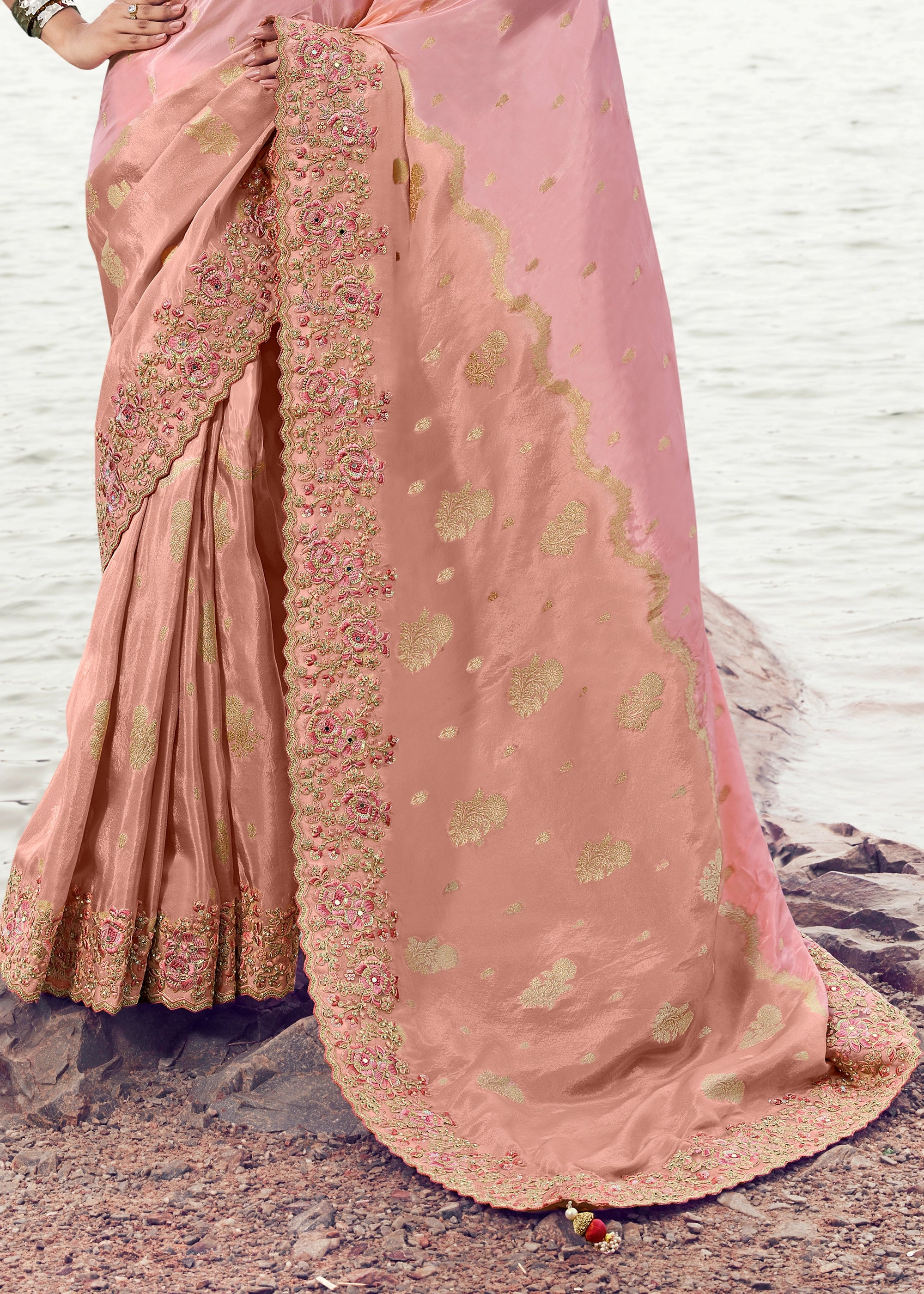 This elegant light pink half tissue half organza saree features intricate sequin, moti, and resham embroidery work on the...