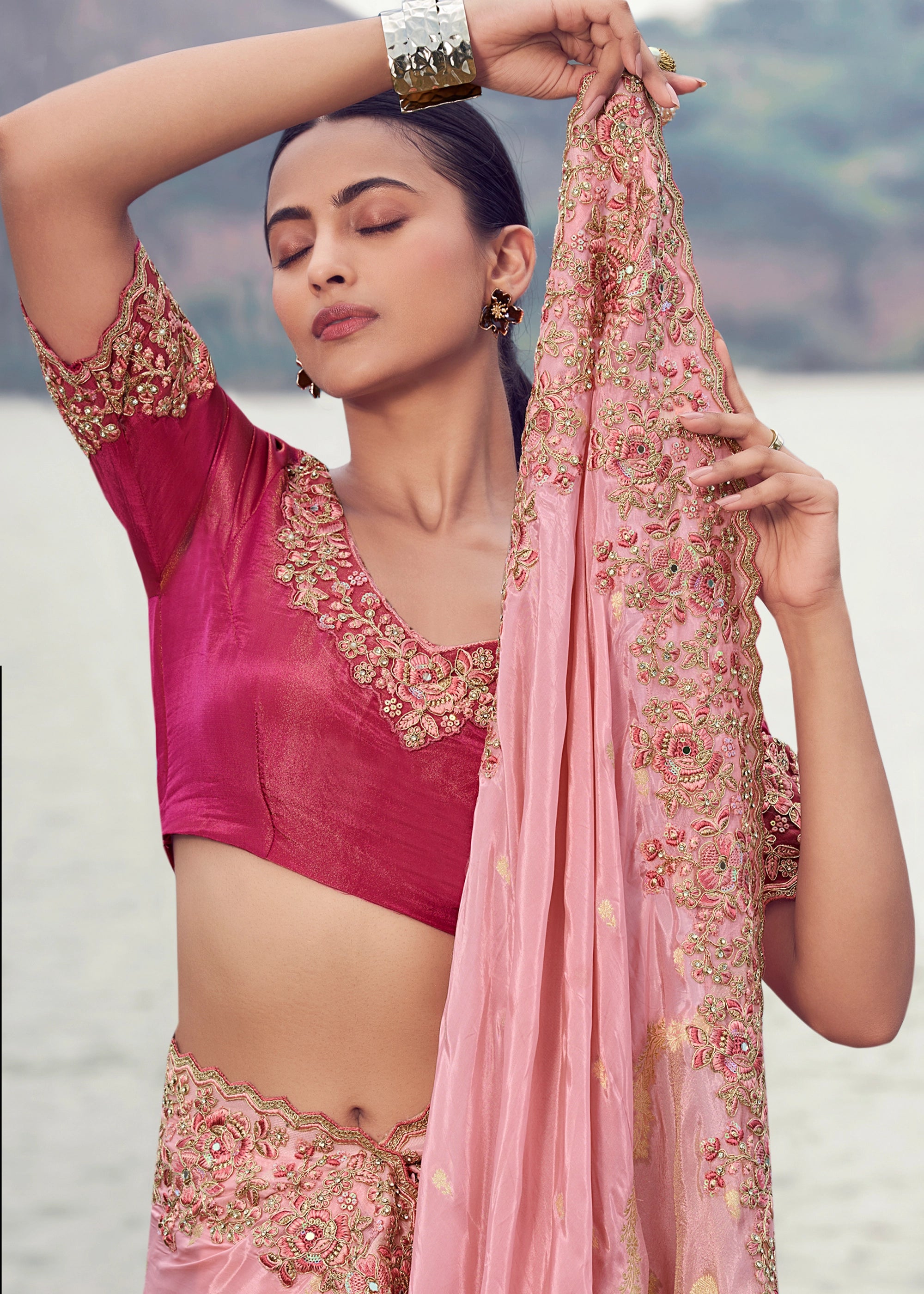 This elegant light pink half tissue half organza saree features intricate sequin, moti, and resham embroidery work on the border and pallu, offering a glamorous party-wear look.Crafted from a silk blend or georgette fabric, it drapes beautifully for special occasions.