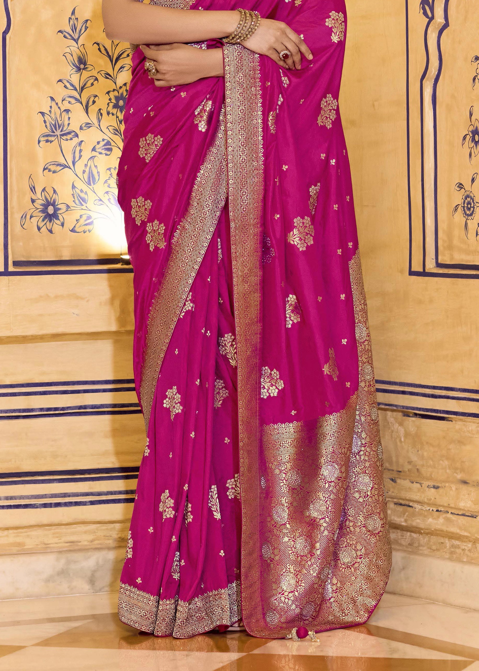 This silk saree shimmers with regal splendor. Its opulent silk threads create a rich texture and a captivating sheen.  Intricate zari work, often in gold or silver, intricately weaves traditional motifs like paisleys, florals, and geometric patterns across the fabric.
