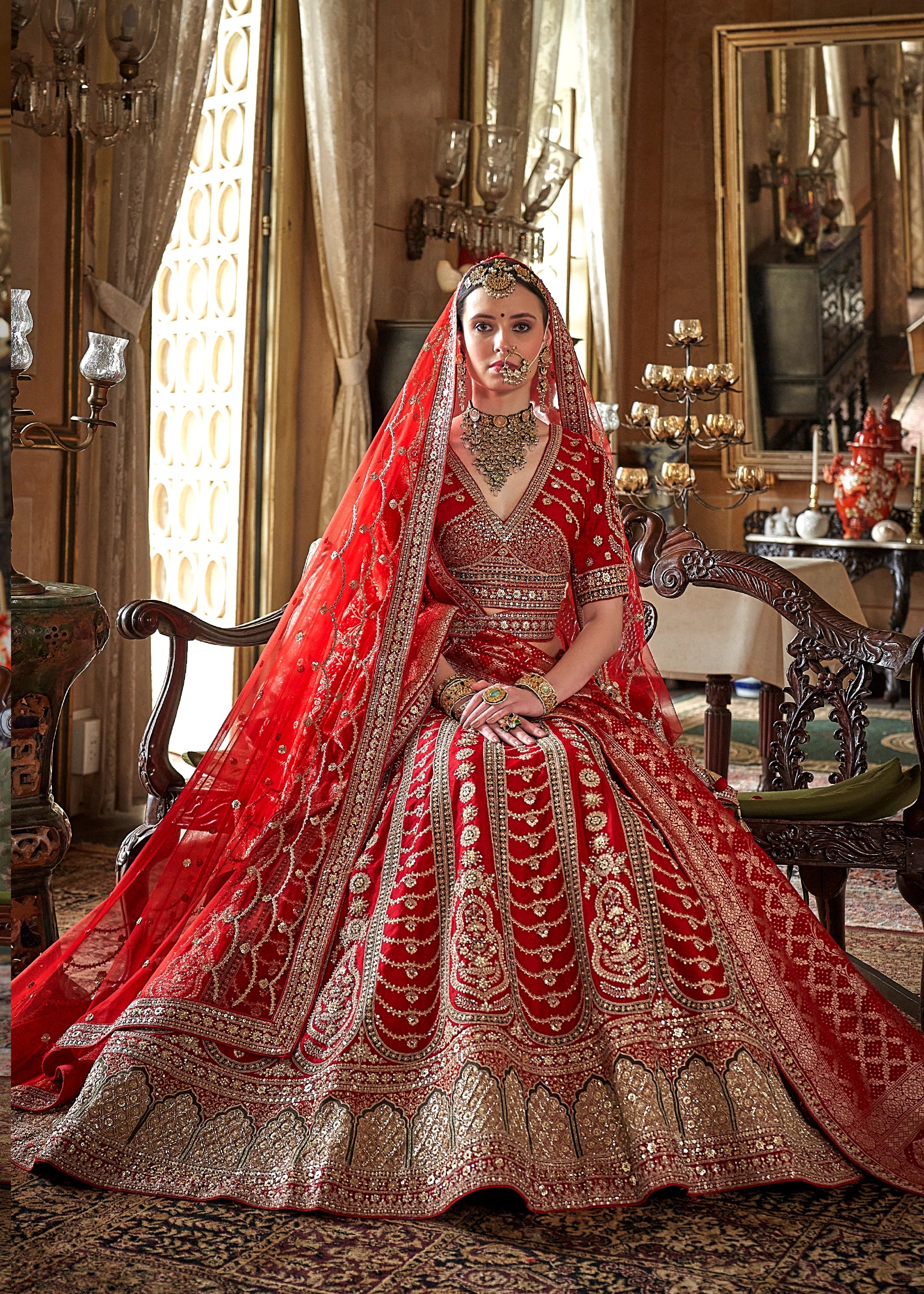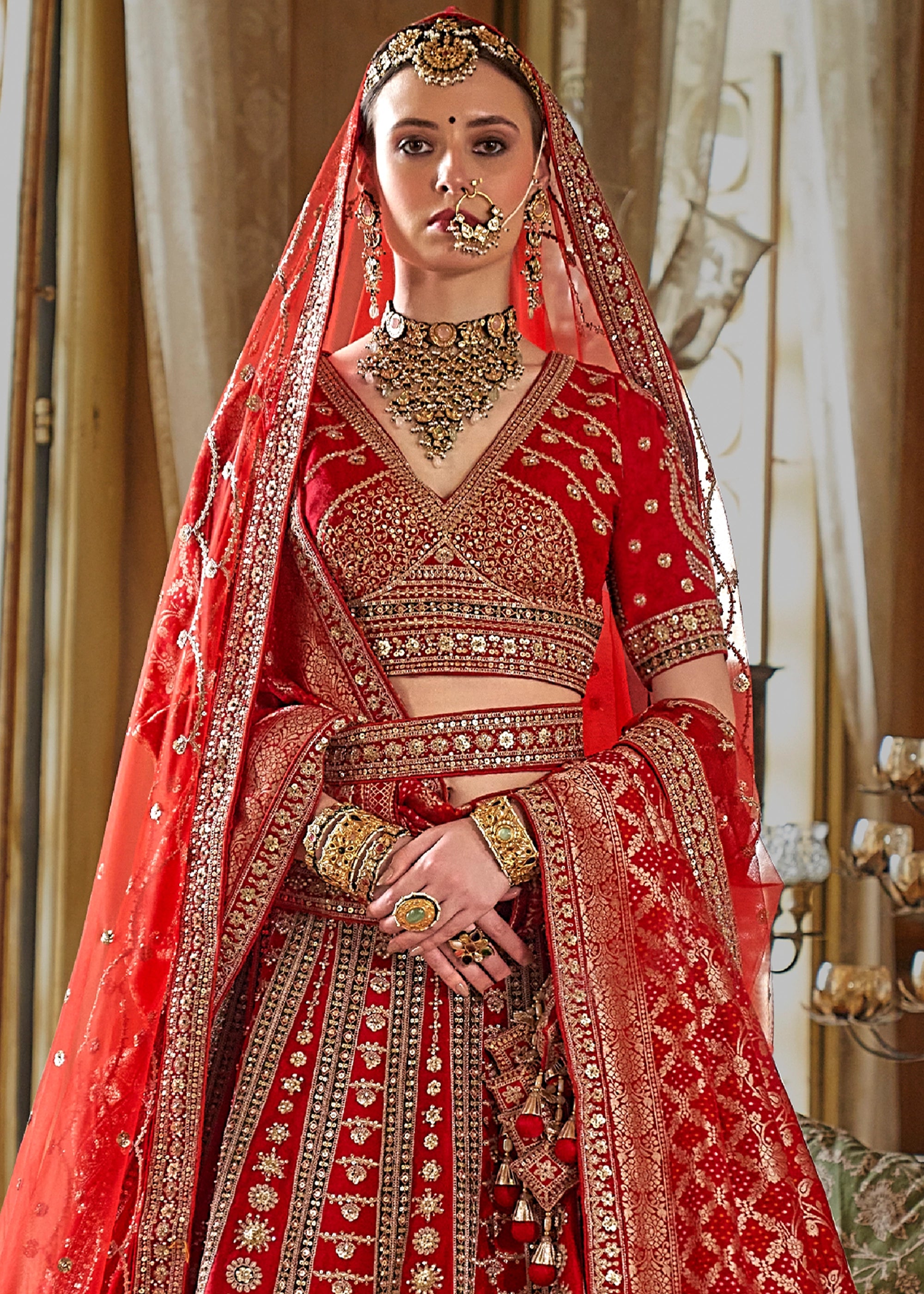 This elegant semi-stitched bridal lehenga in silk is enhanced with delicate thread woven details, shimmering sequins, gleaming zari, and bead embellishments for a luxurious appeal.It features a contrasting red Banarasi silk dupatta, perfect for special occasions.
