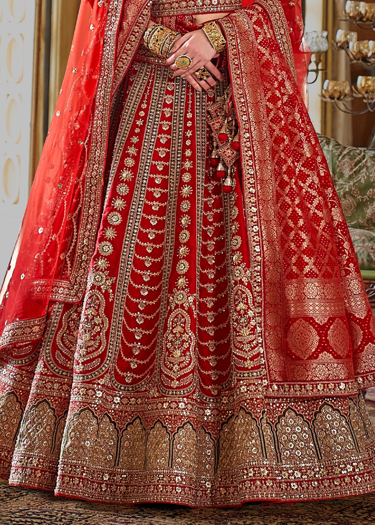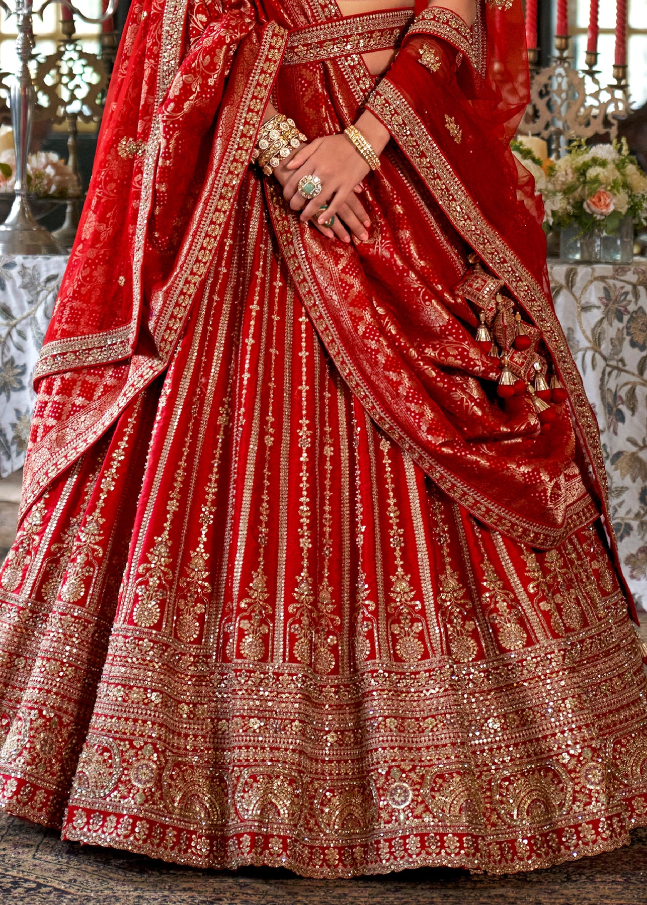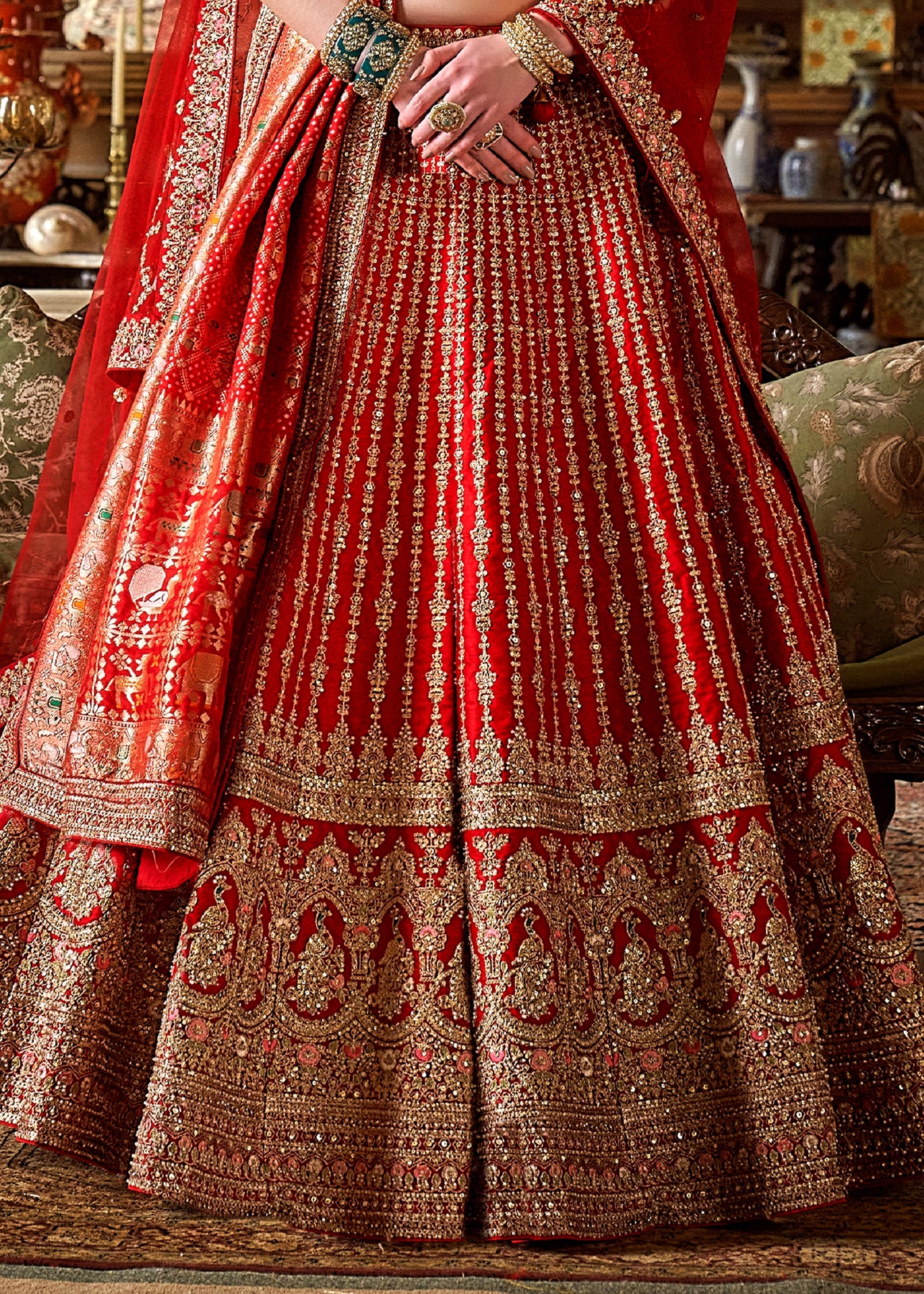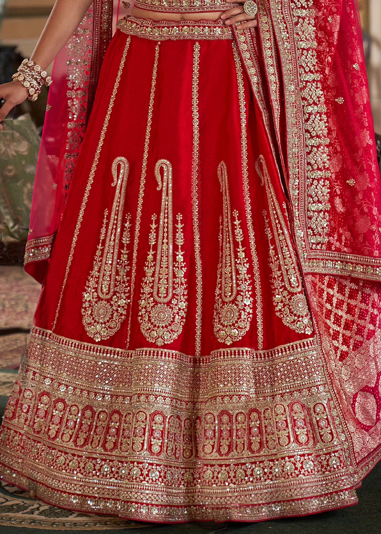 This opulent Sea Green Kanjipuram Silk Saree features traditional weaving, brought to life with heavy handwork. It is richly embellished with Zari, thread, Moti (beads), Cut-Dana, and reflective mirror work, making it a stunning choice for any grand celebration.