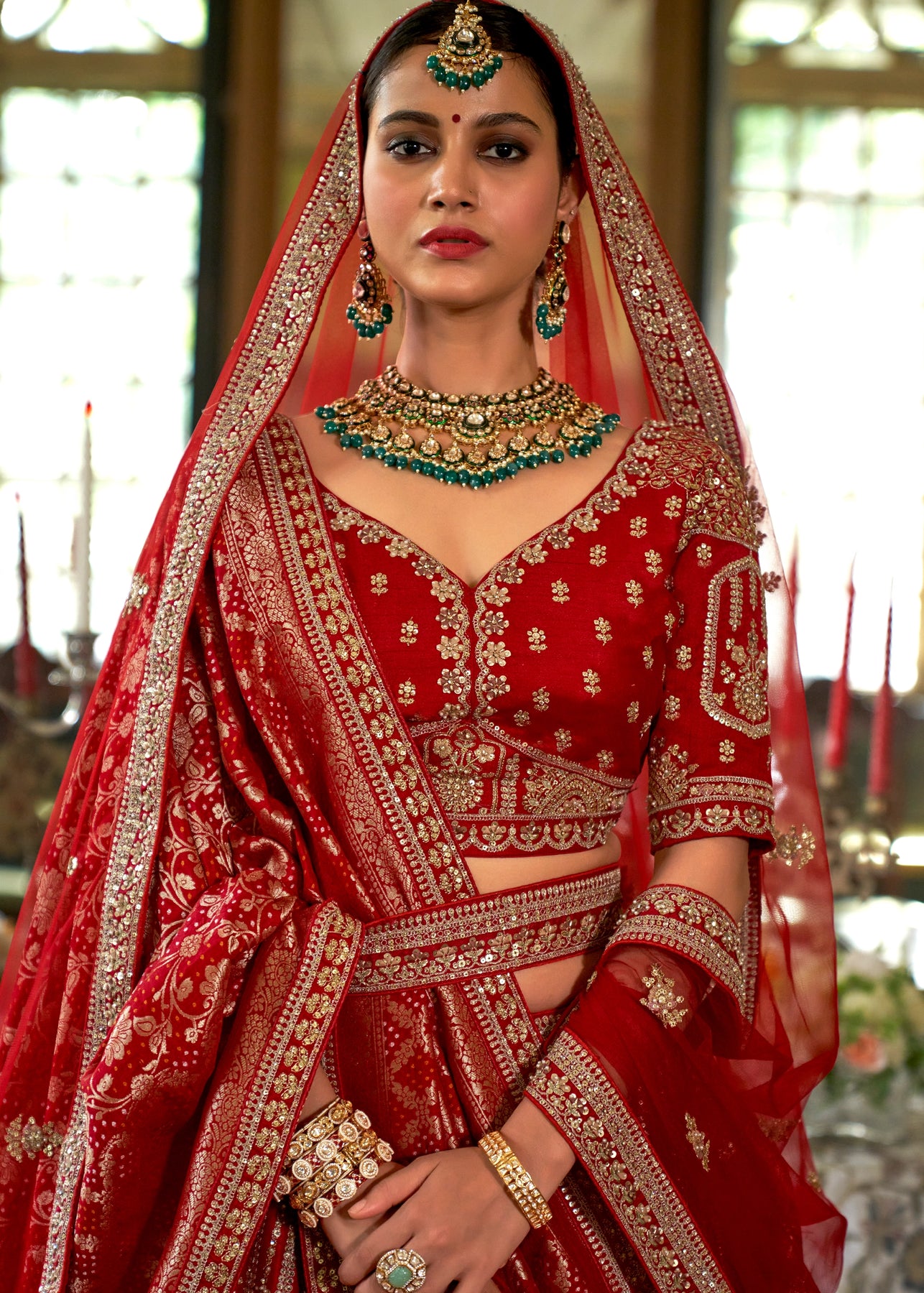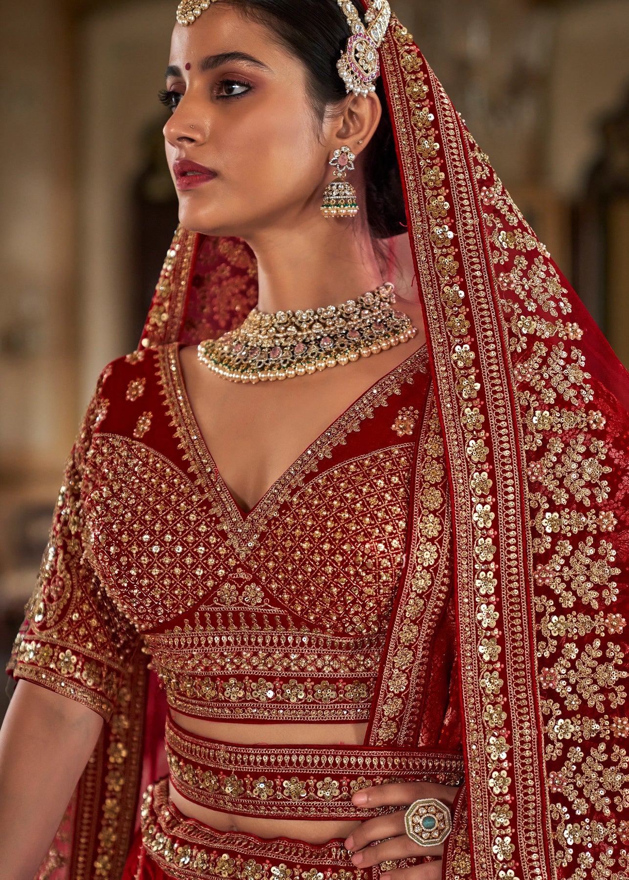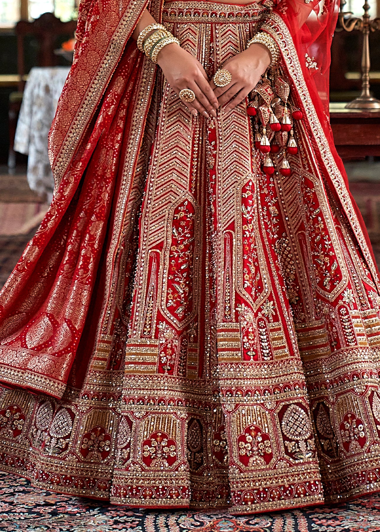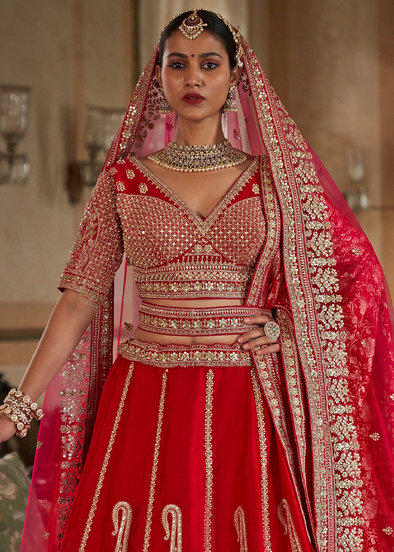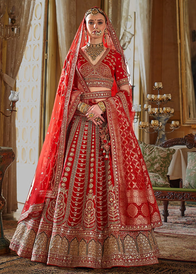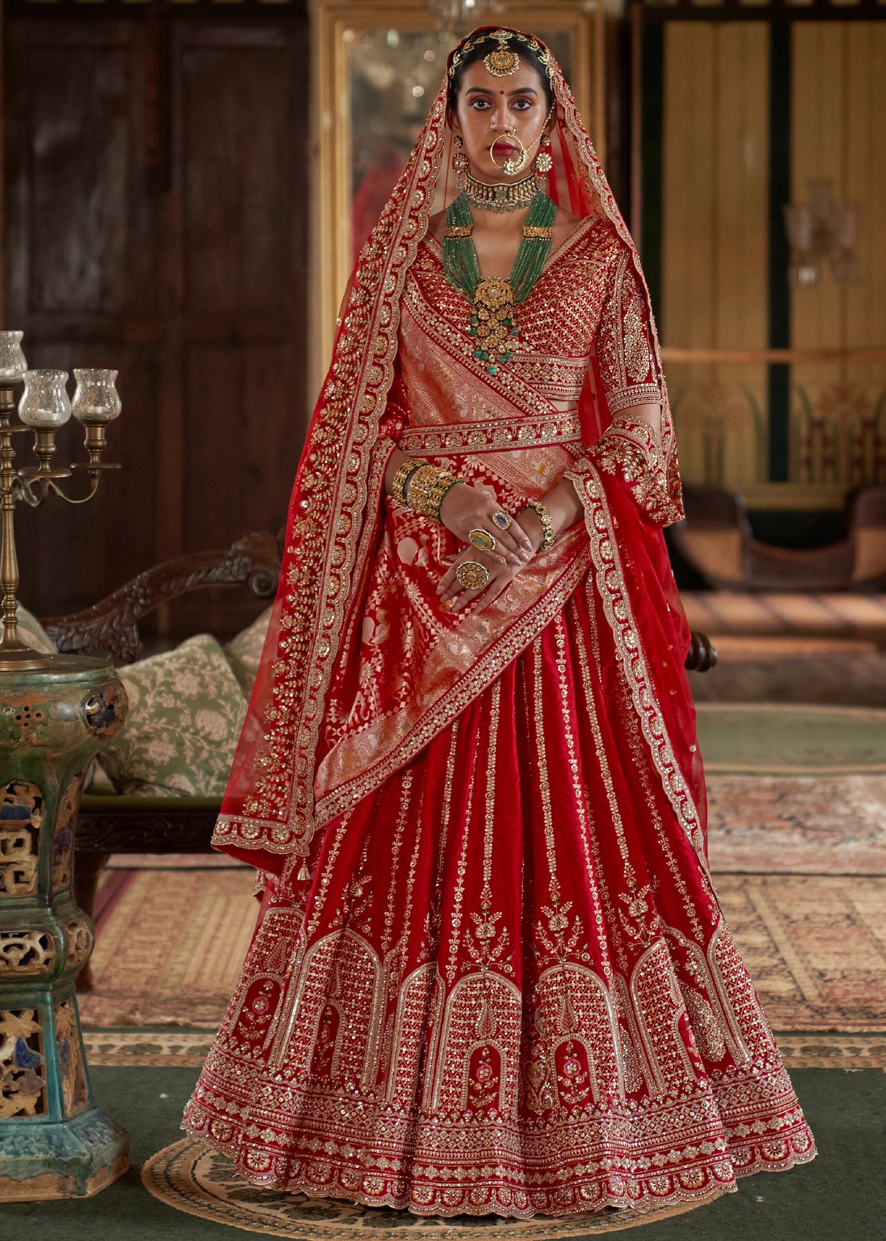 This opulent Sea Green Kanjipuram Silk Saree features traditional weaving, brought to life with heavy handwork. It is richly embellished with Zari, thread, Moti (beads), Cut-Dana, and reflective mirror work, making it a stunning choice for any grand celebration.