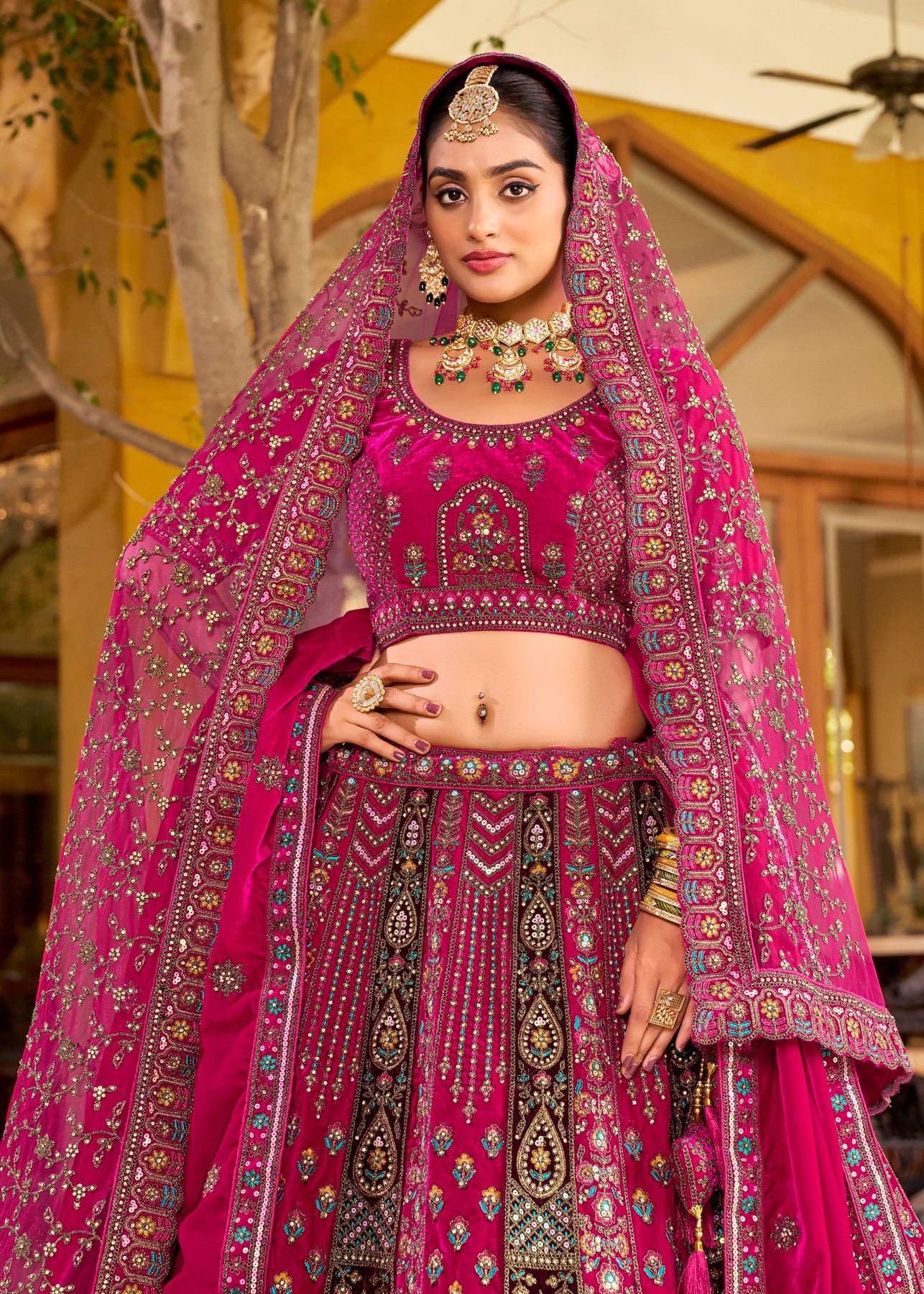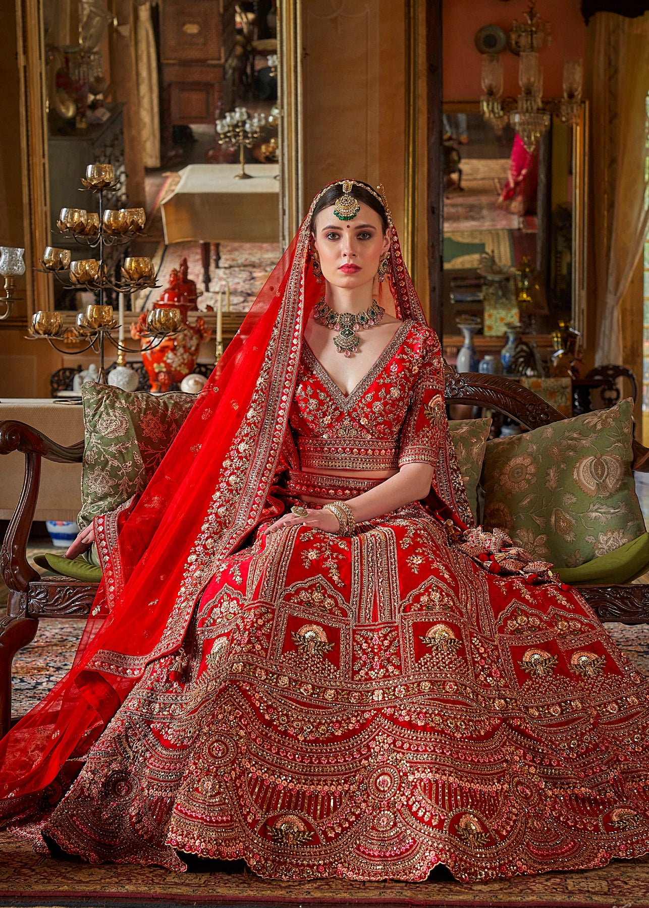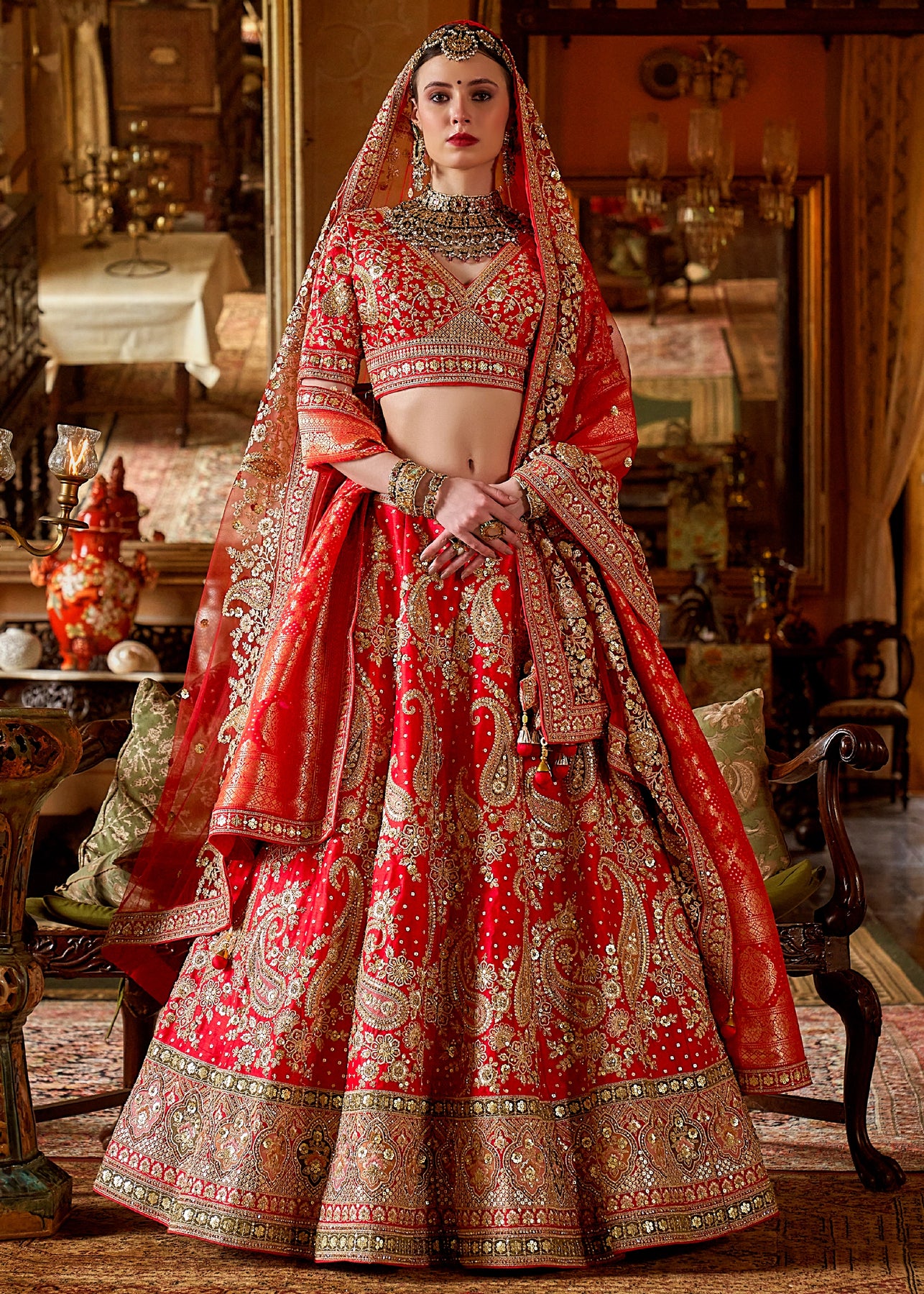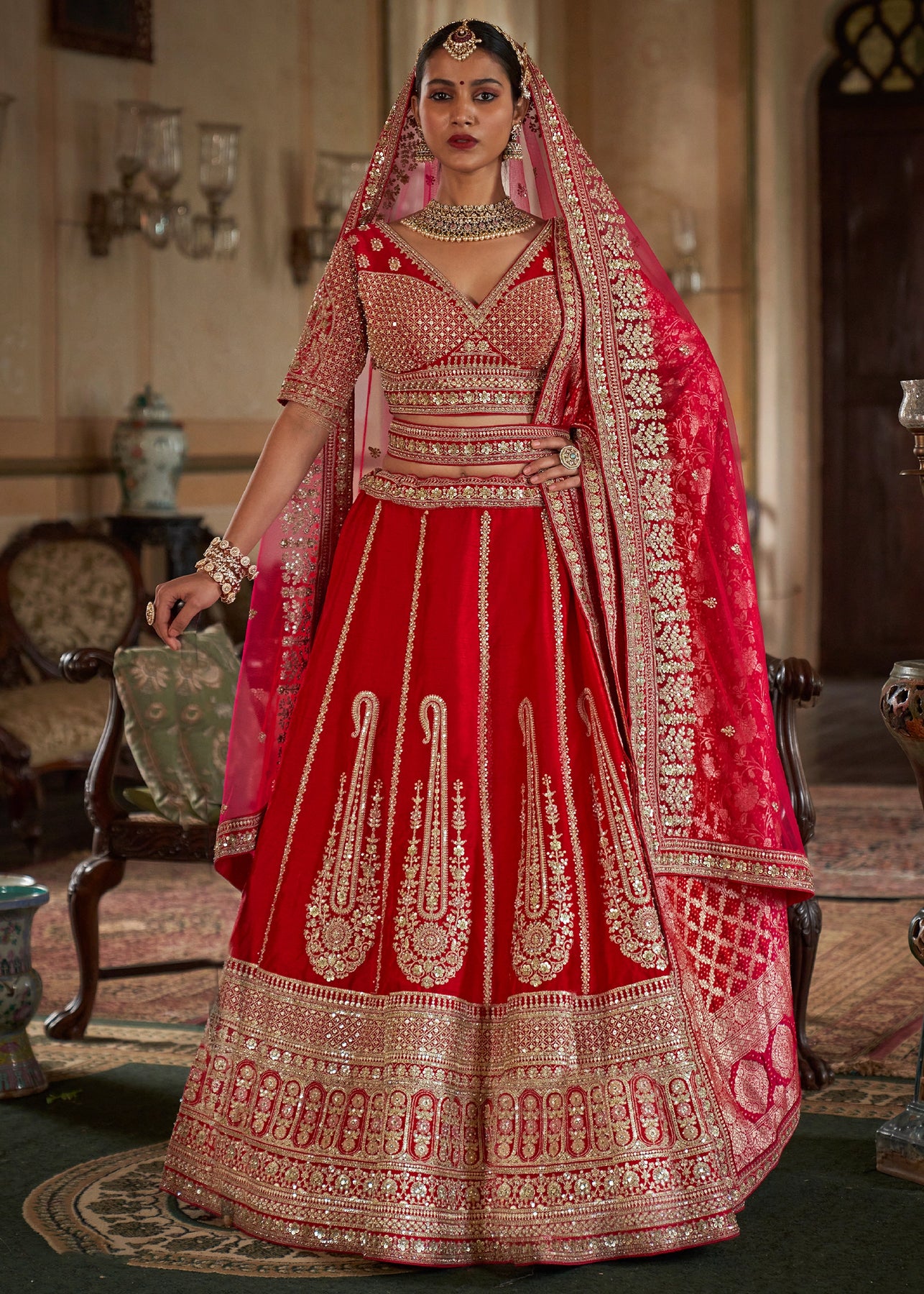 This opulent Sea Green Kanjipuram Silk Saree features traditional weaving, brought to life with heavy handwork. It is richly embellished with Zari, thread, Moti (beads), Cut-Dana, and reflective mirror work, making it a stunning choice for any grand celebration.