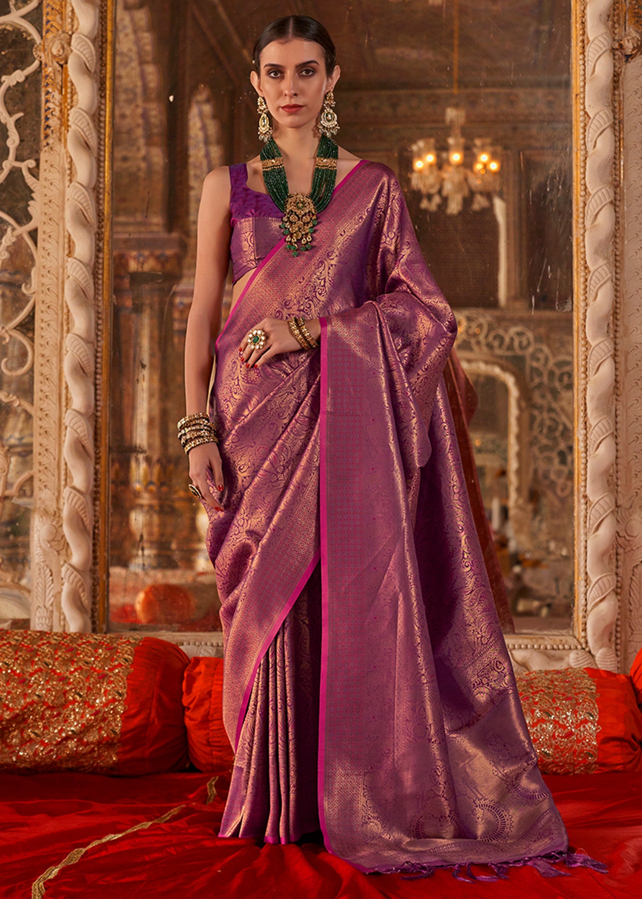Passion Purple Satin Silk Saree with Ajrakh Printed Pallu and Blouse