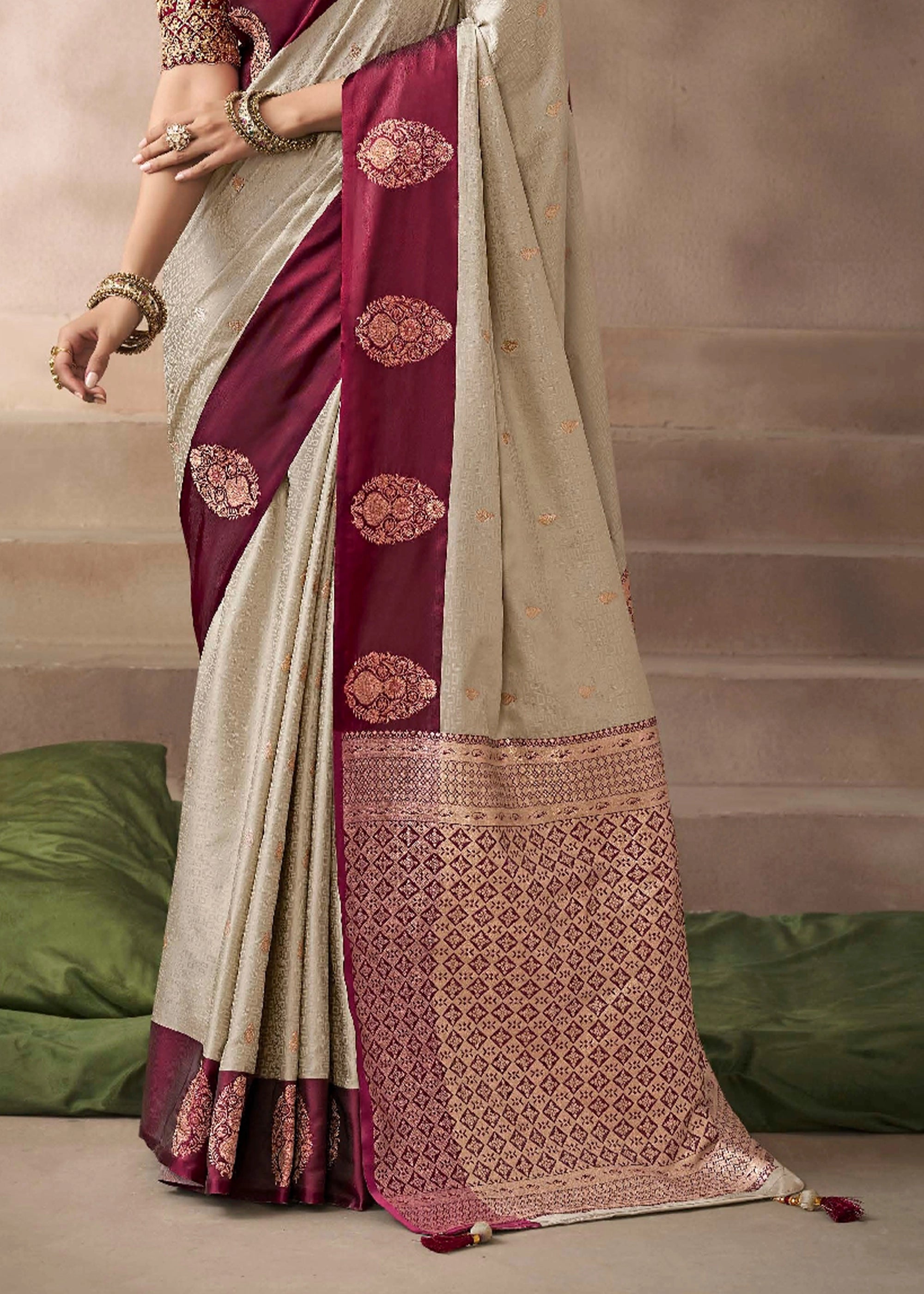 “Exclusive Offer” : Beige & Maroon Woven Banarasi Satin Silk Saree