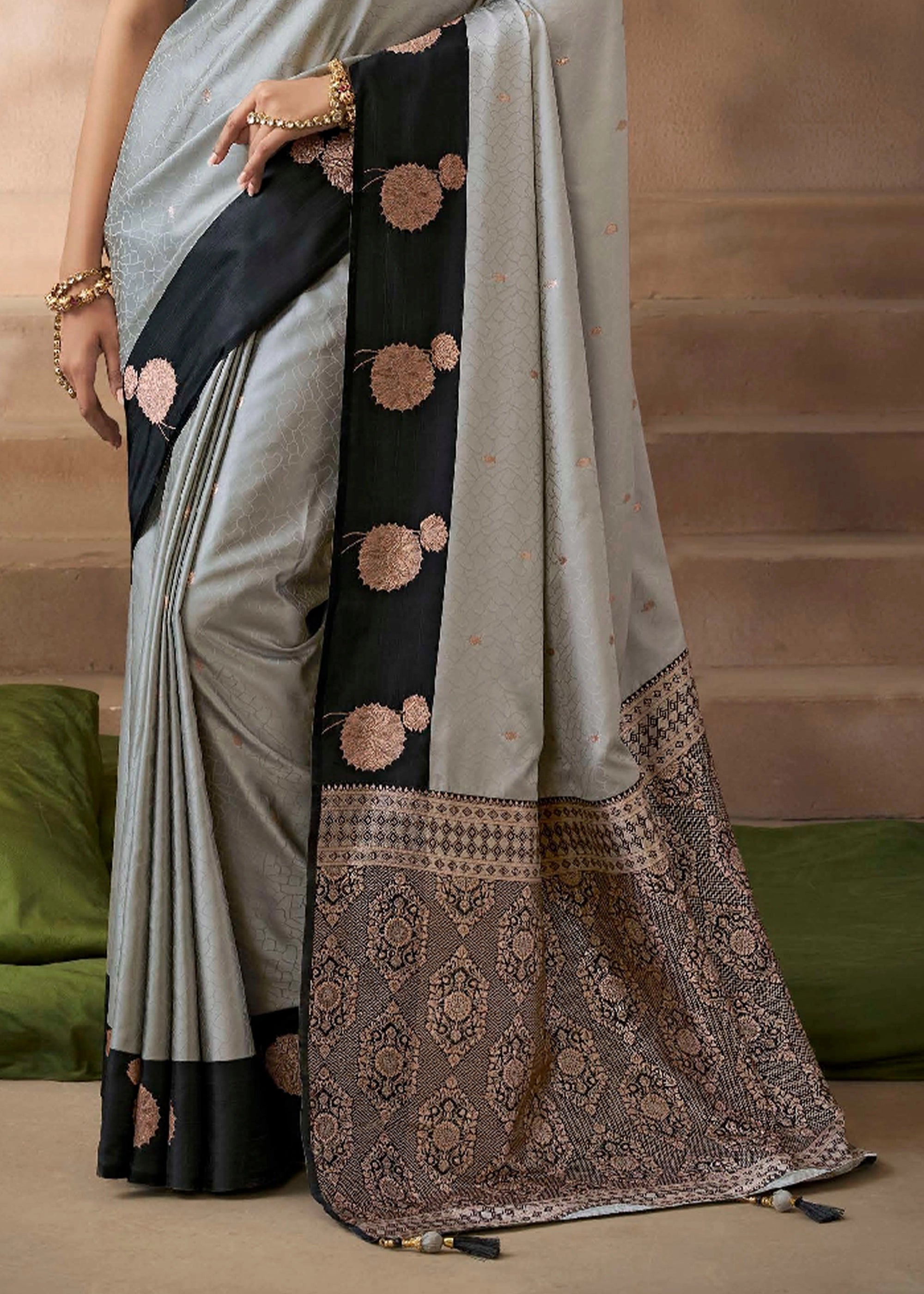 “Exclusive Offer” : Grey & Black Woven Banarasi Satin Silk Saree
