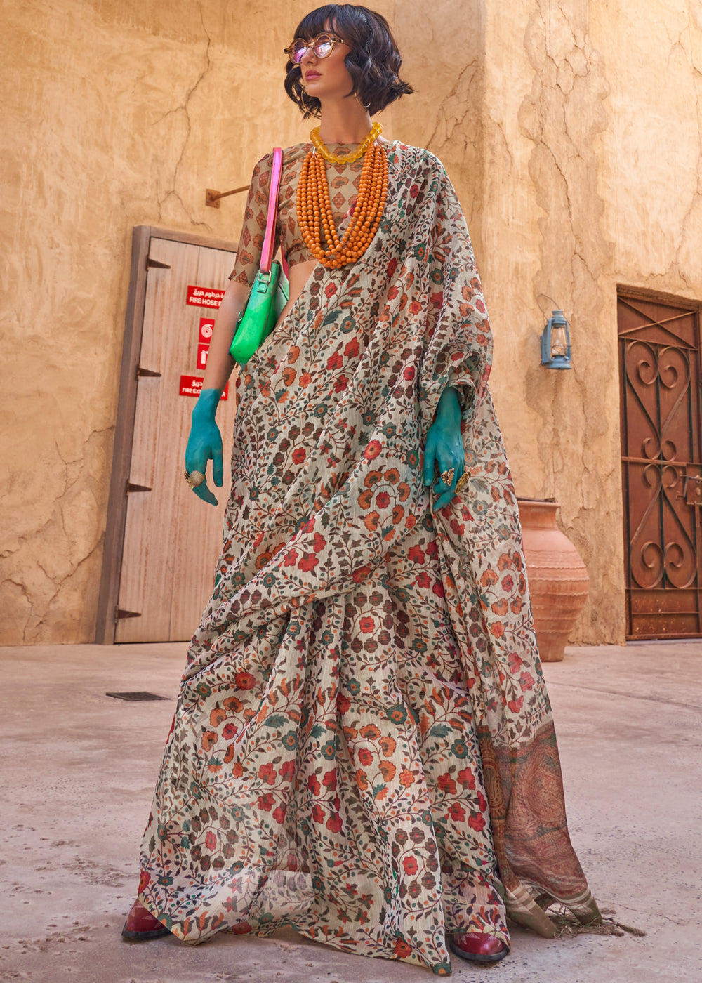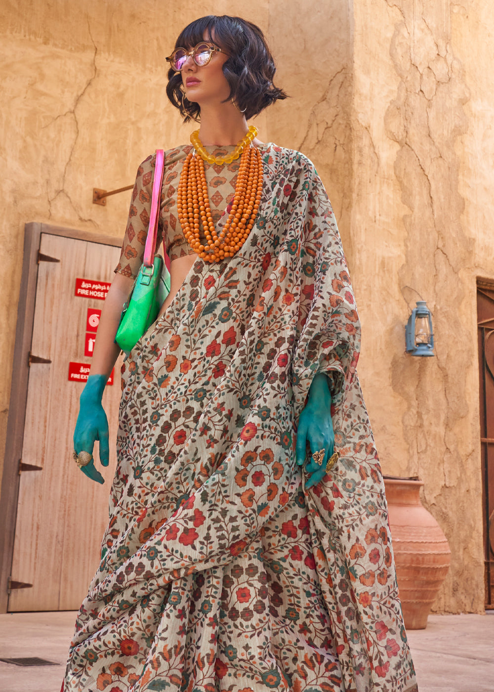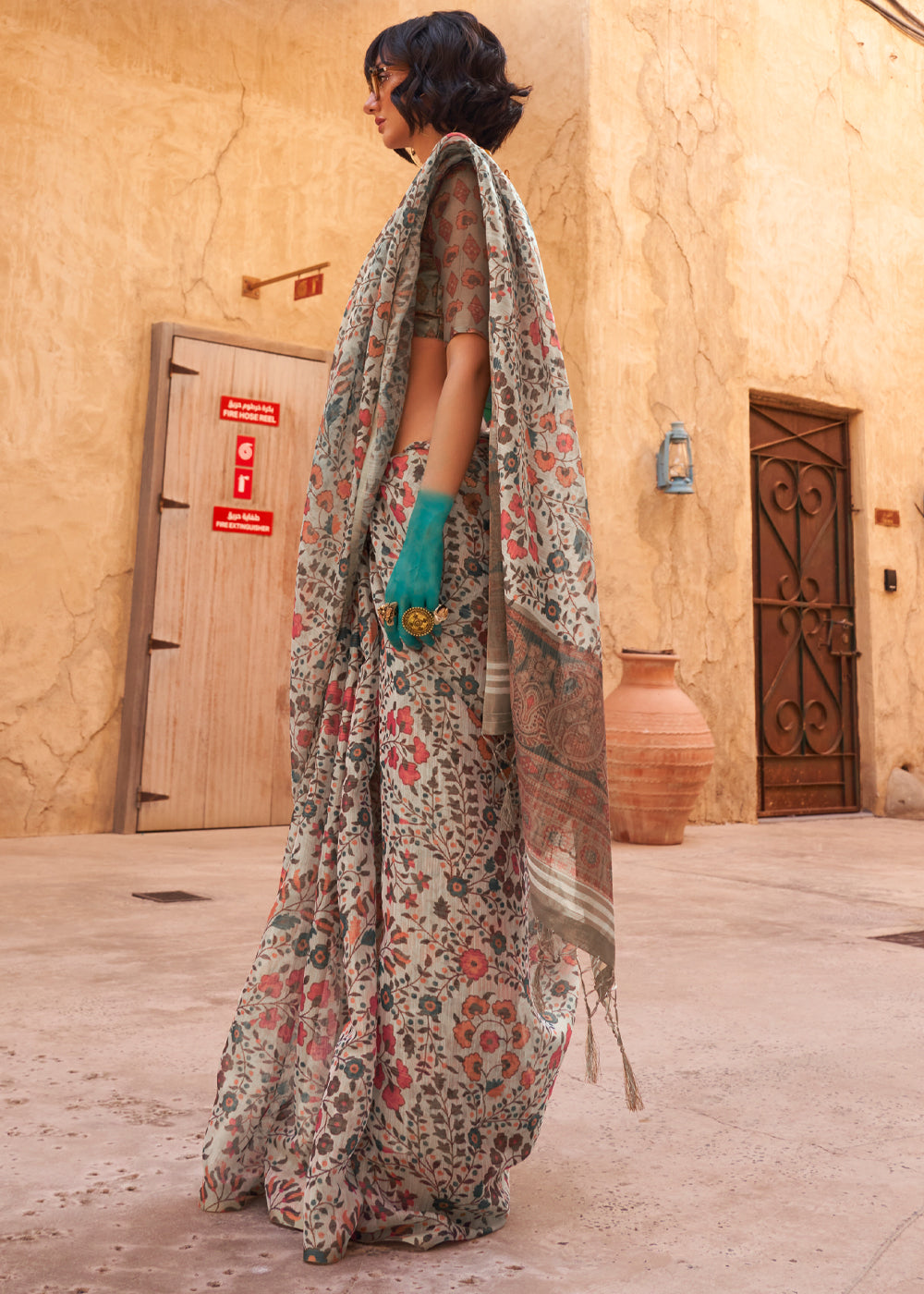 Powder Grey Printed Cotton Silk Saree With Contrast Blouse