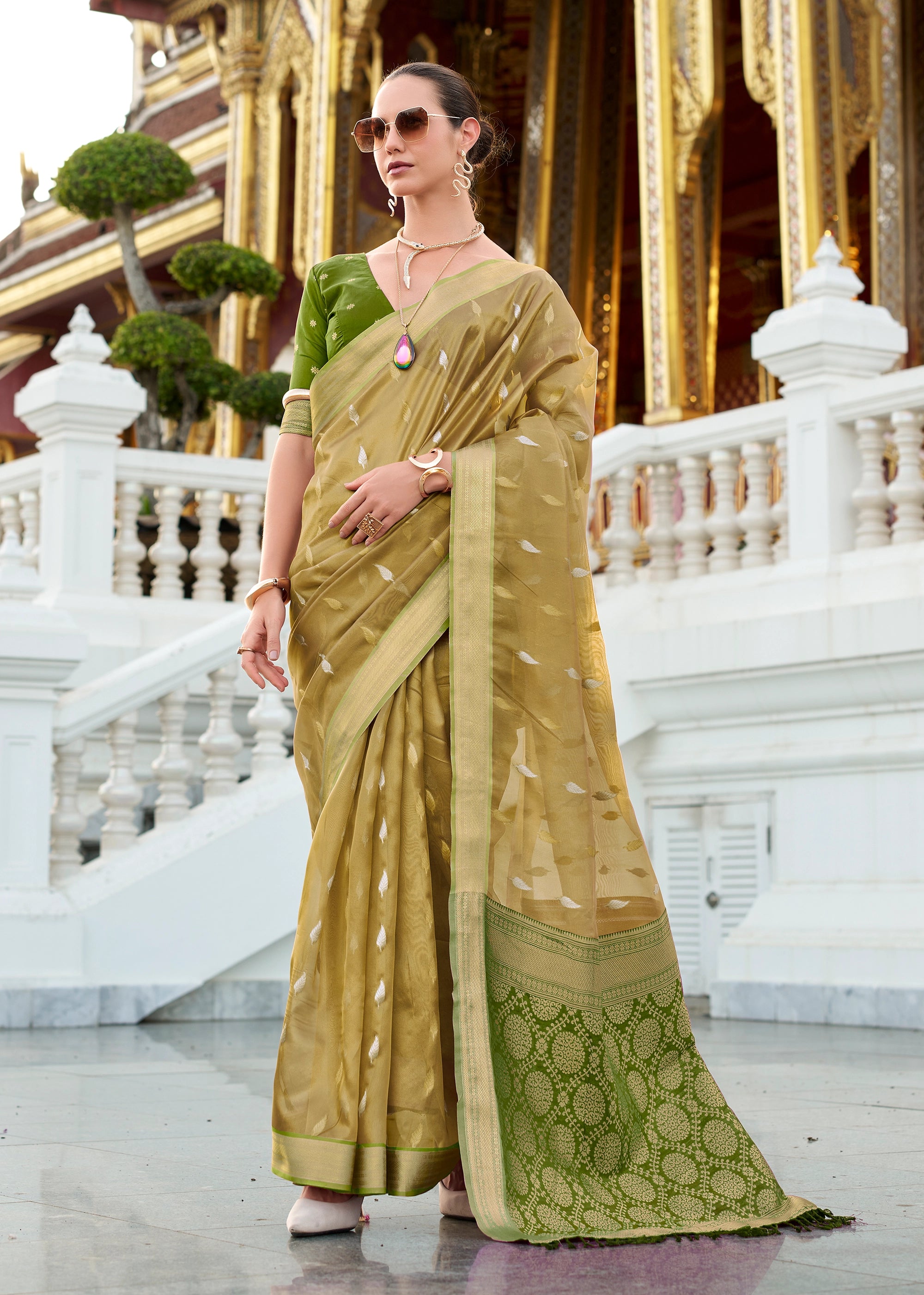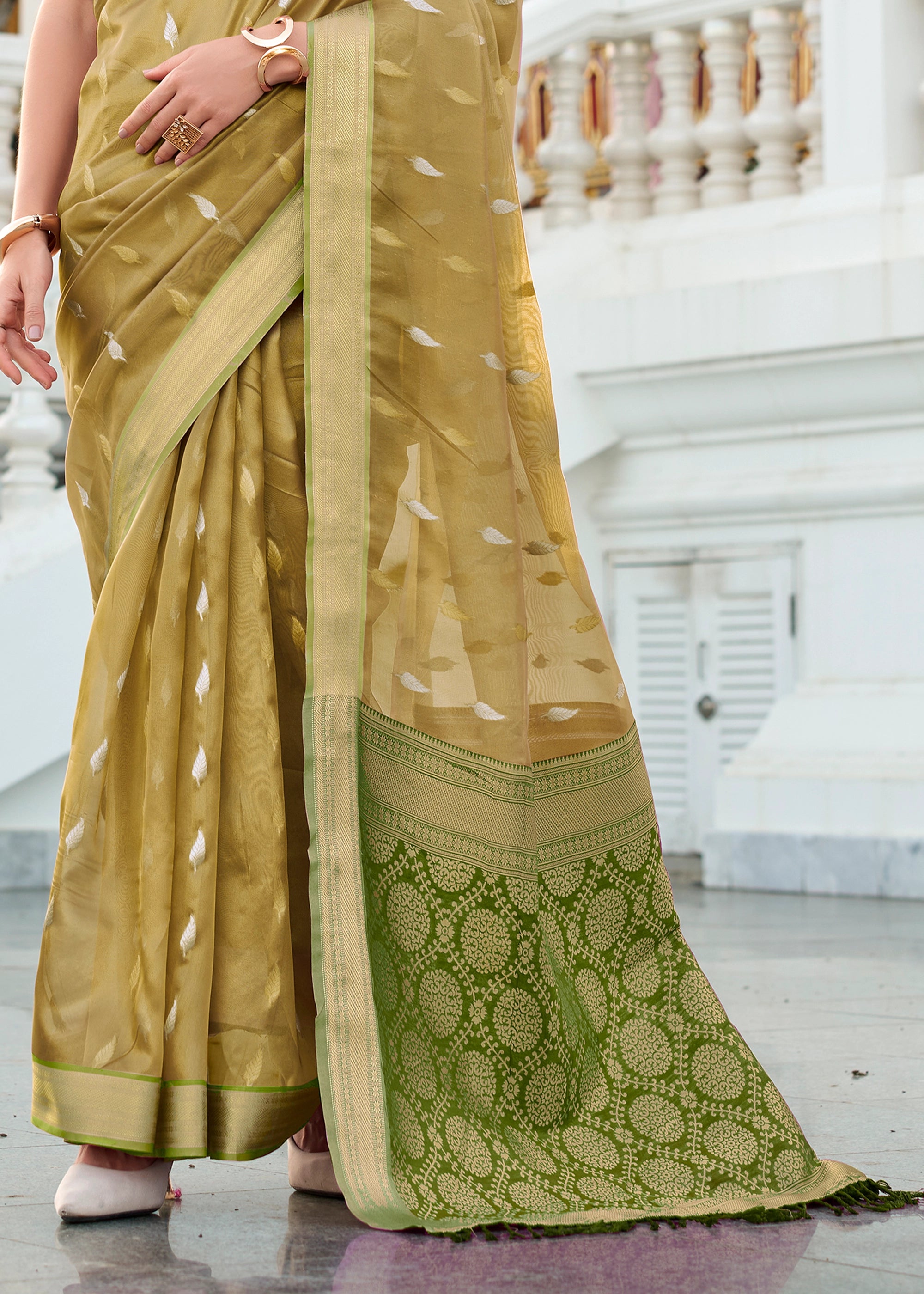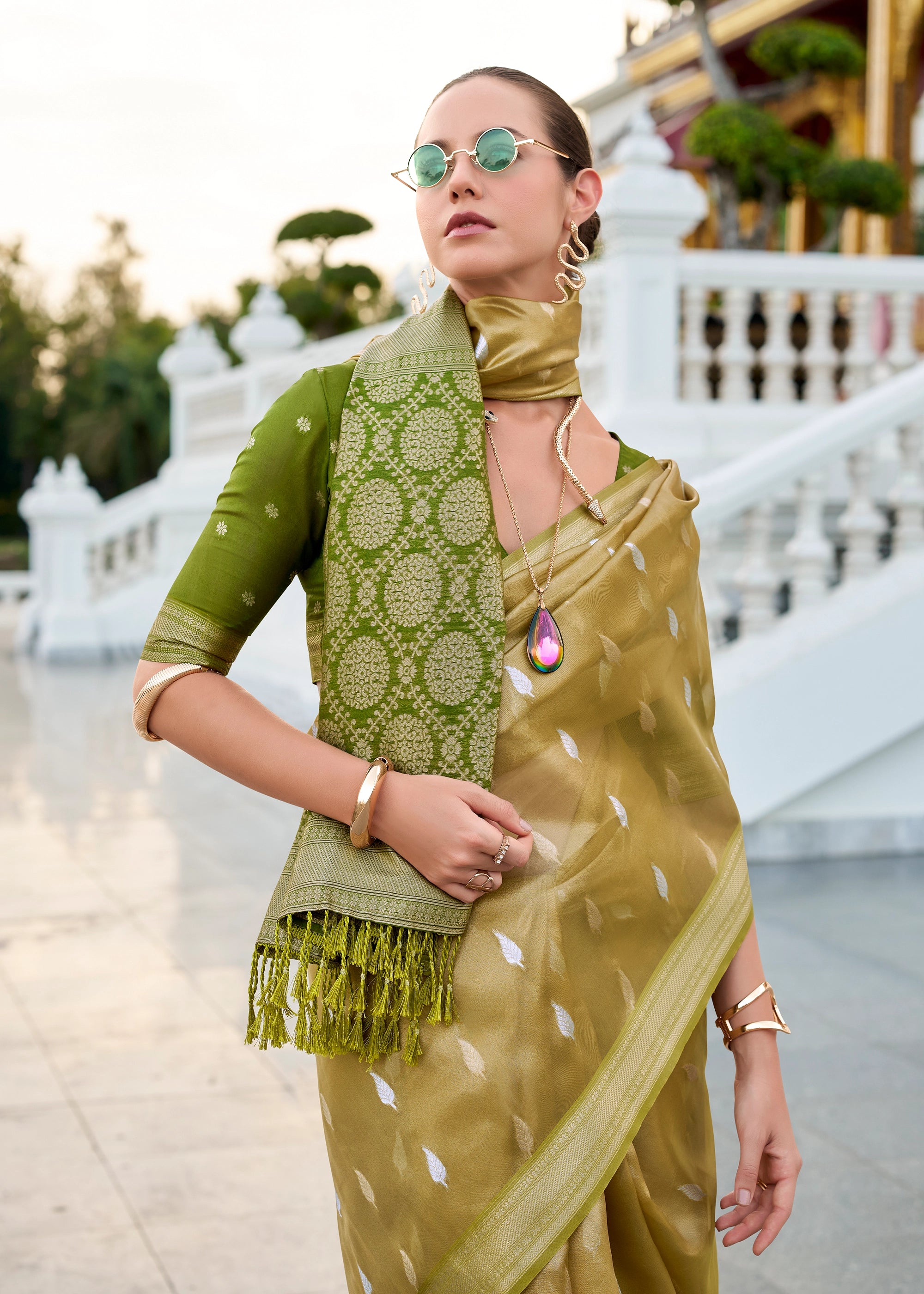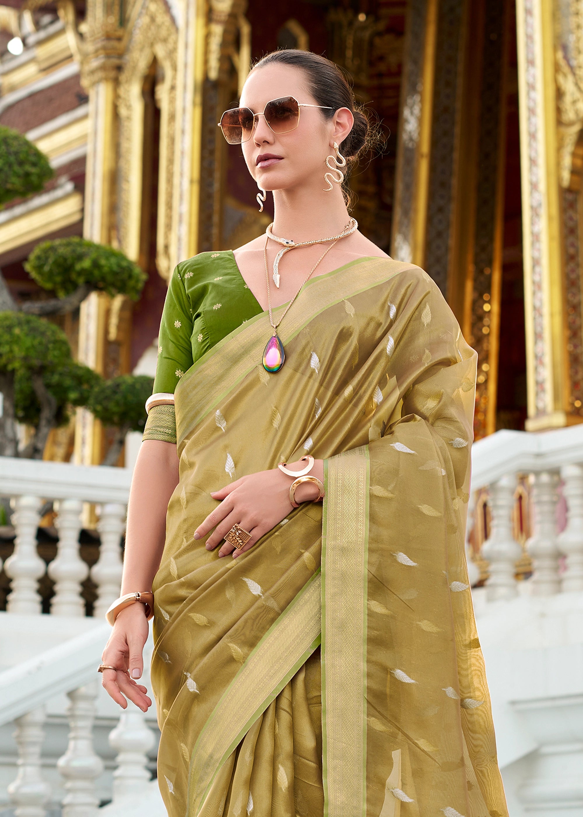 Olive Green Woven Tissue Silk Saree