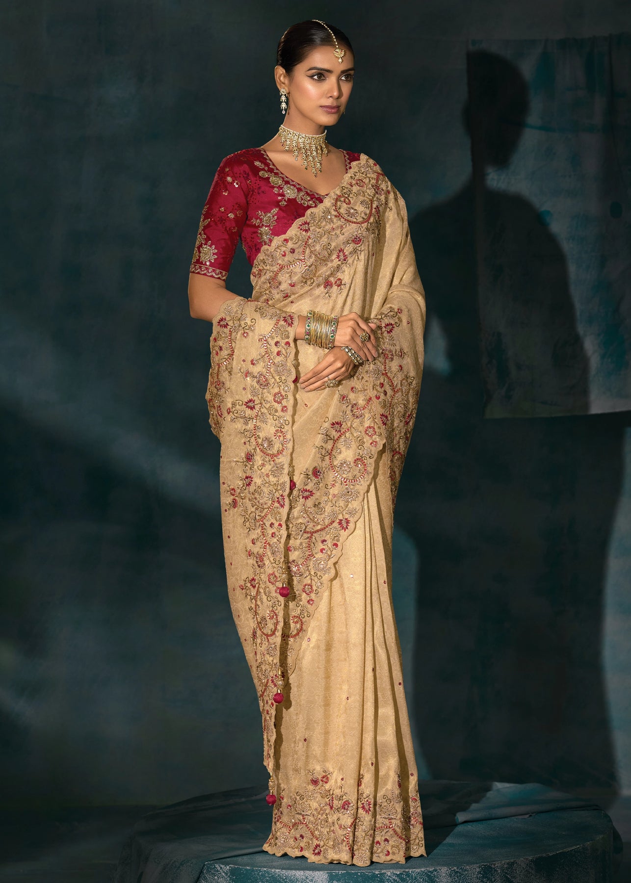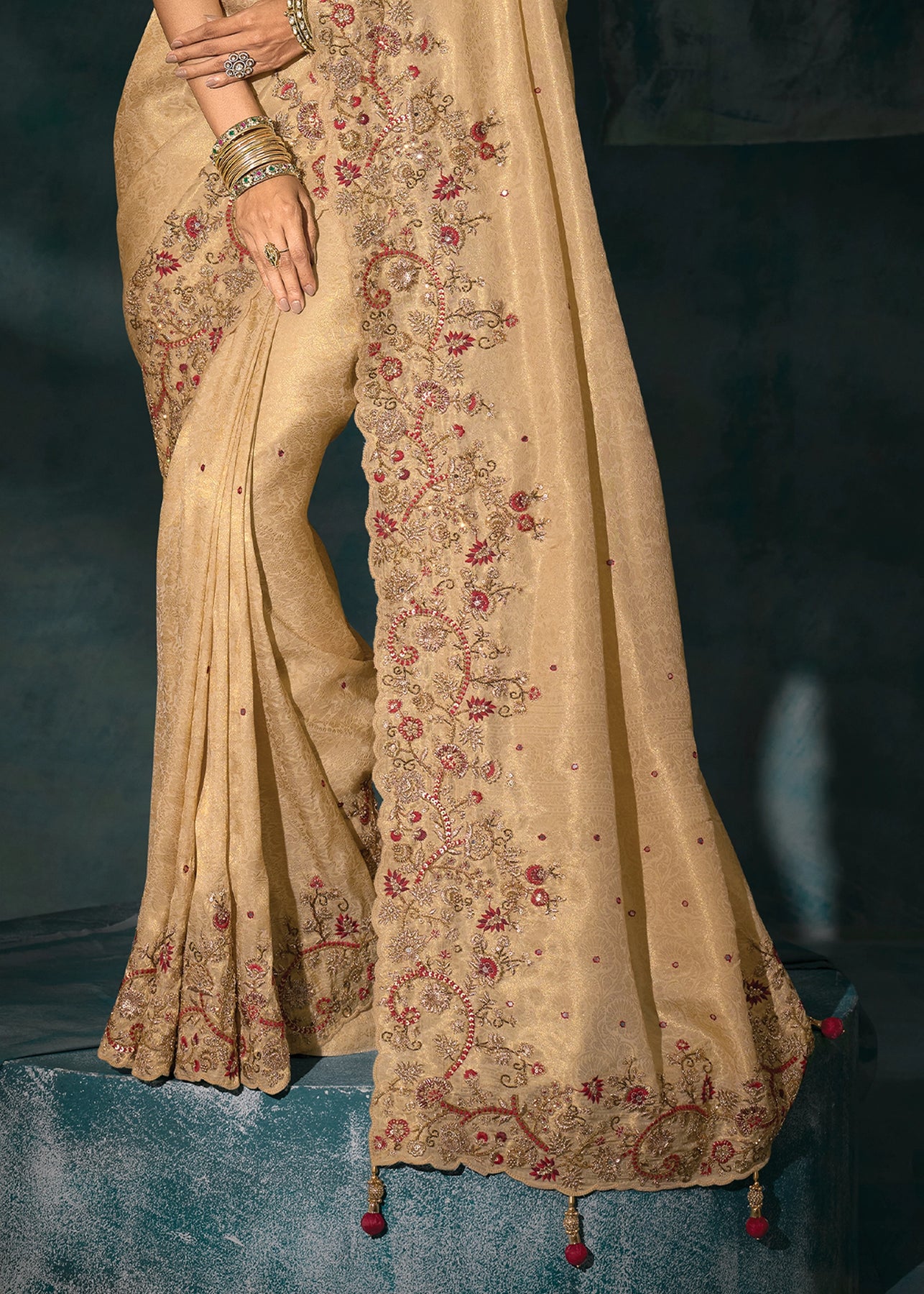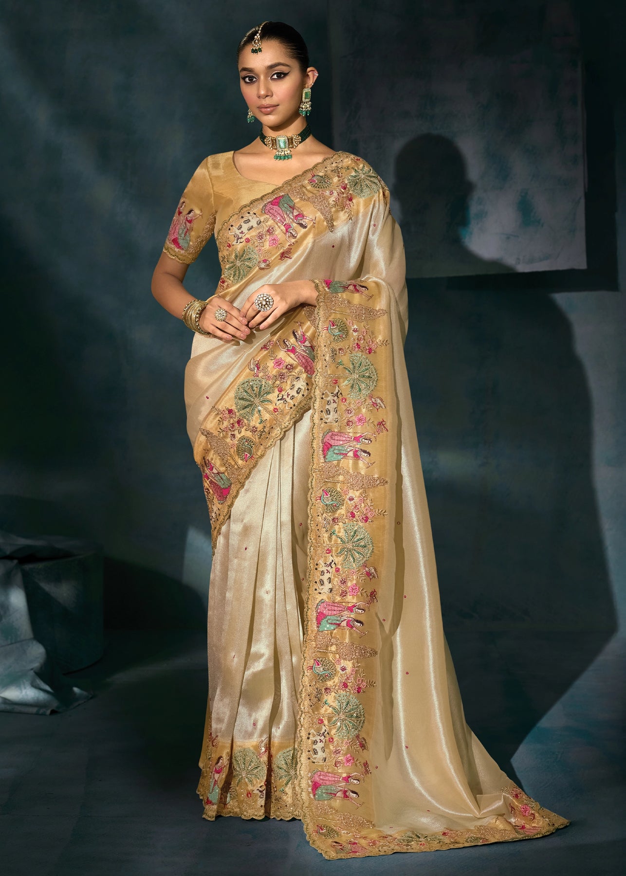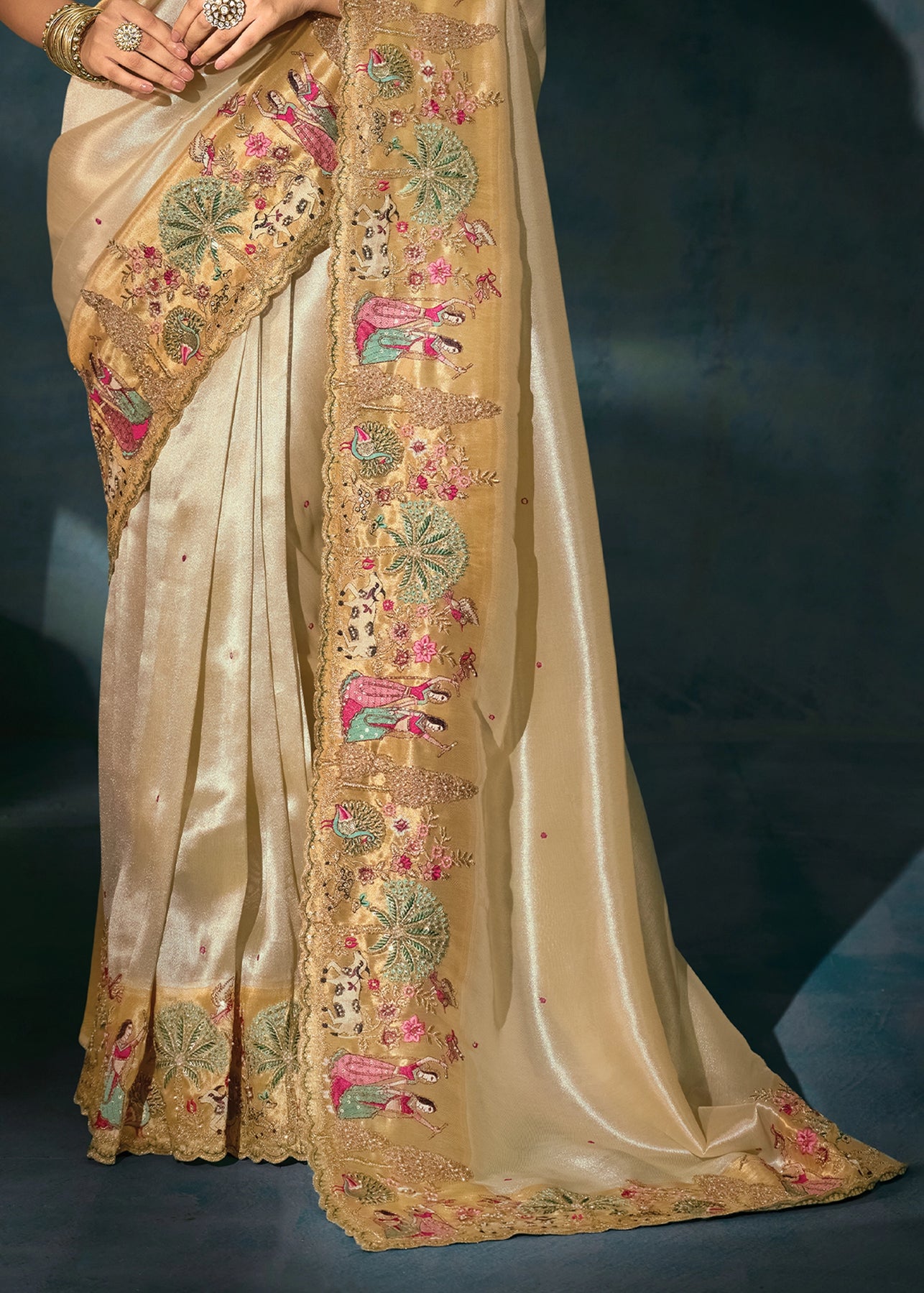Rich Cream Embroidered Designer Tissue Saree