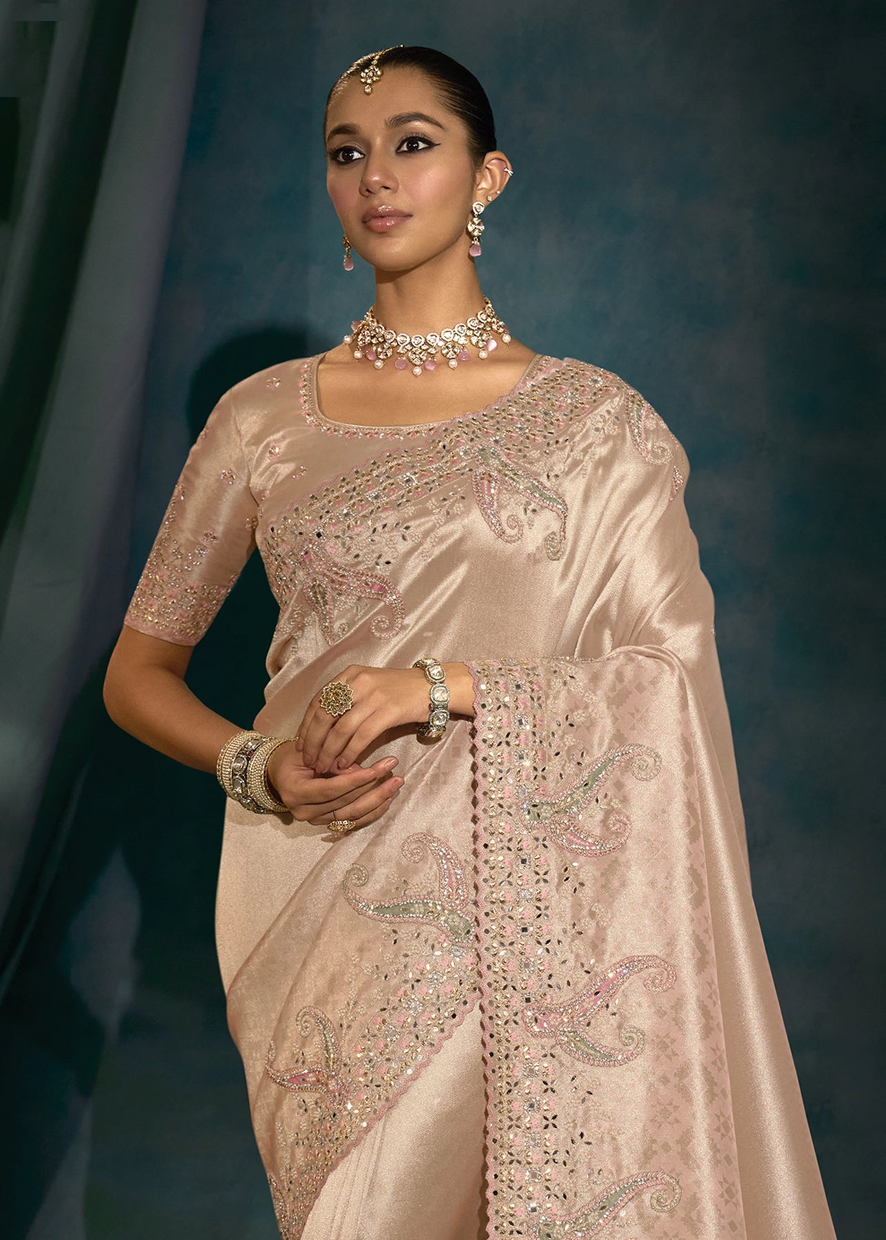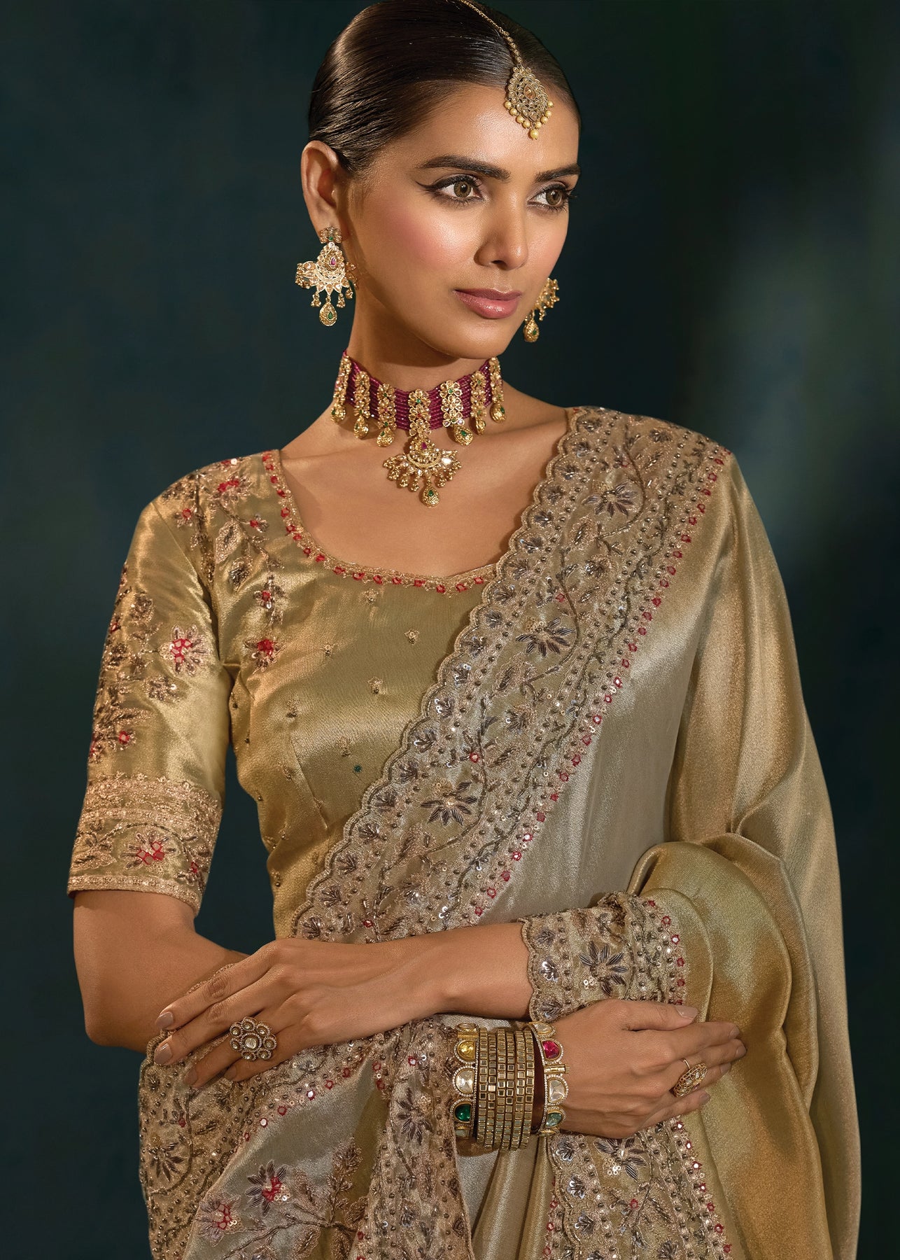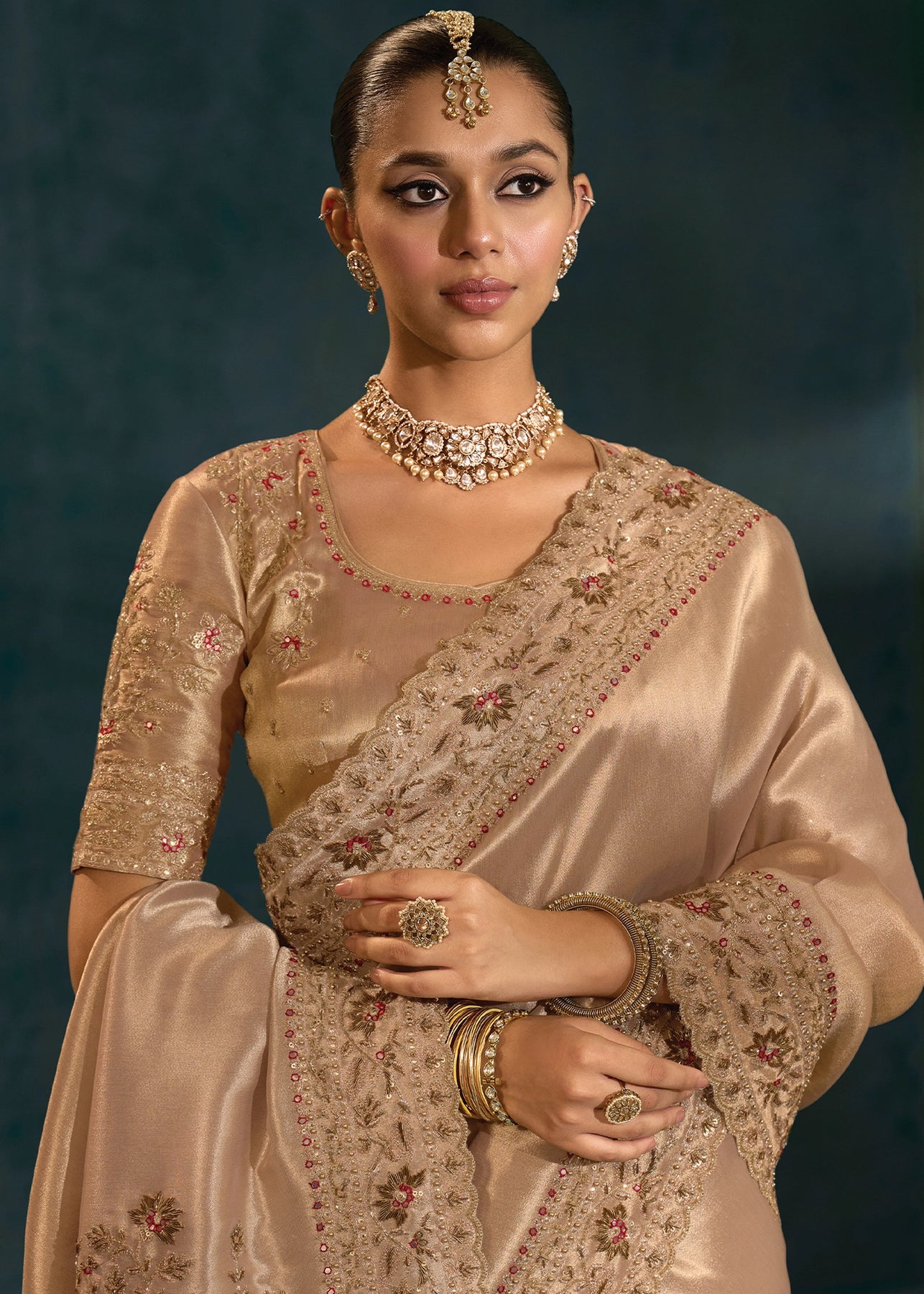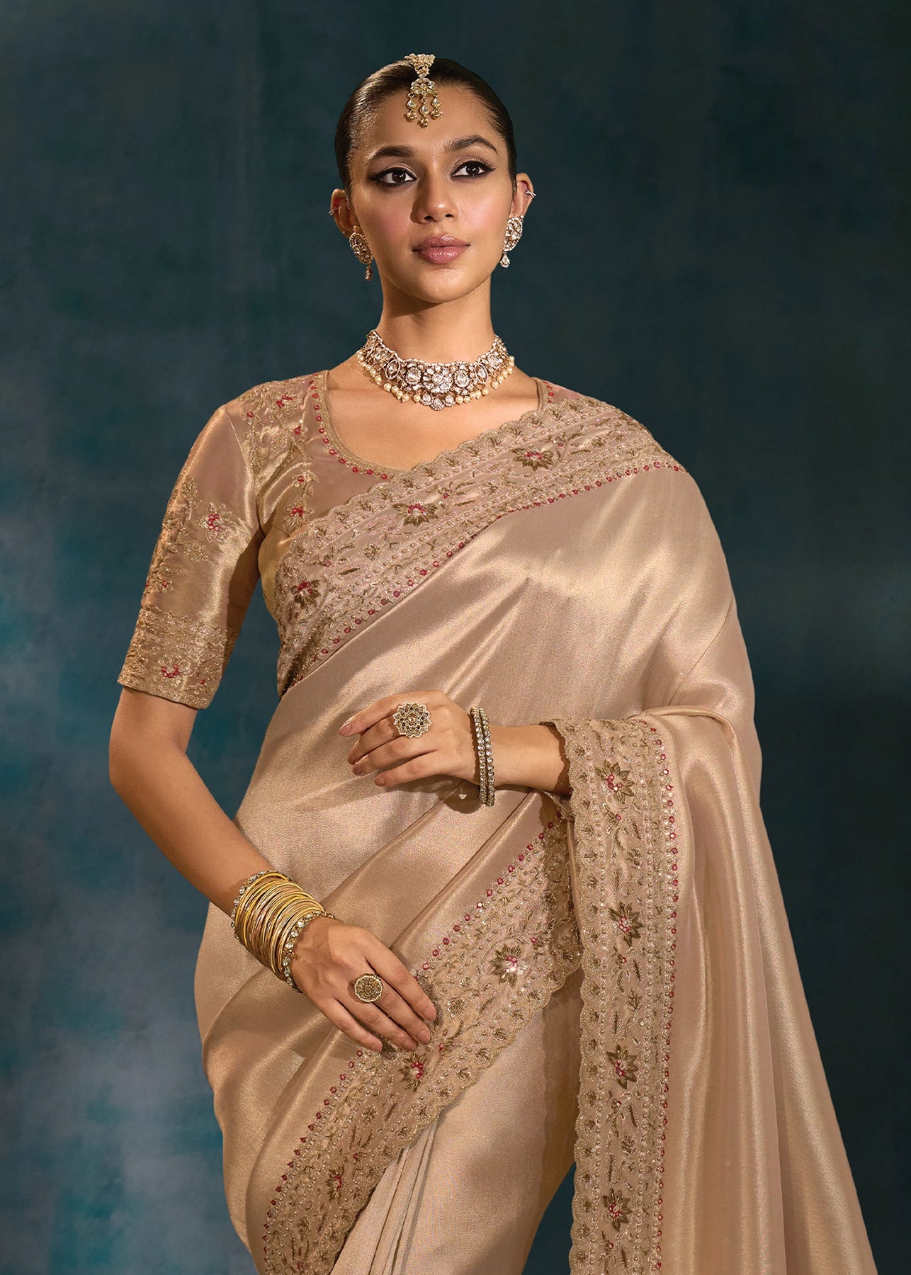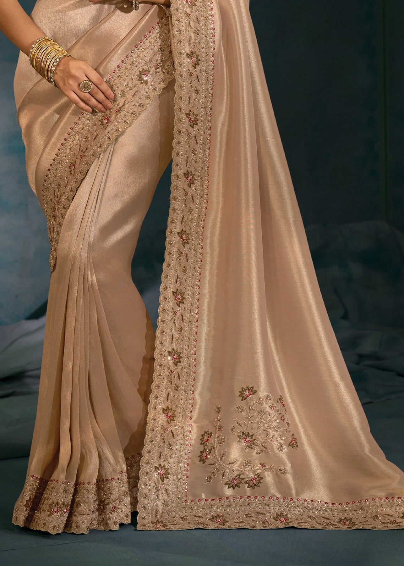 Classy Beige Embroidered Designer Tissue Saree