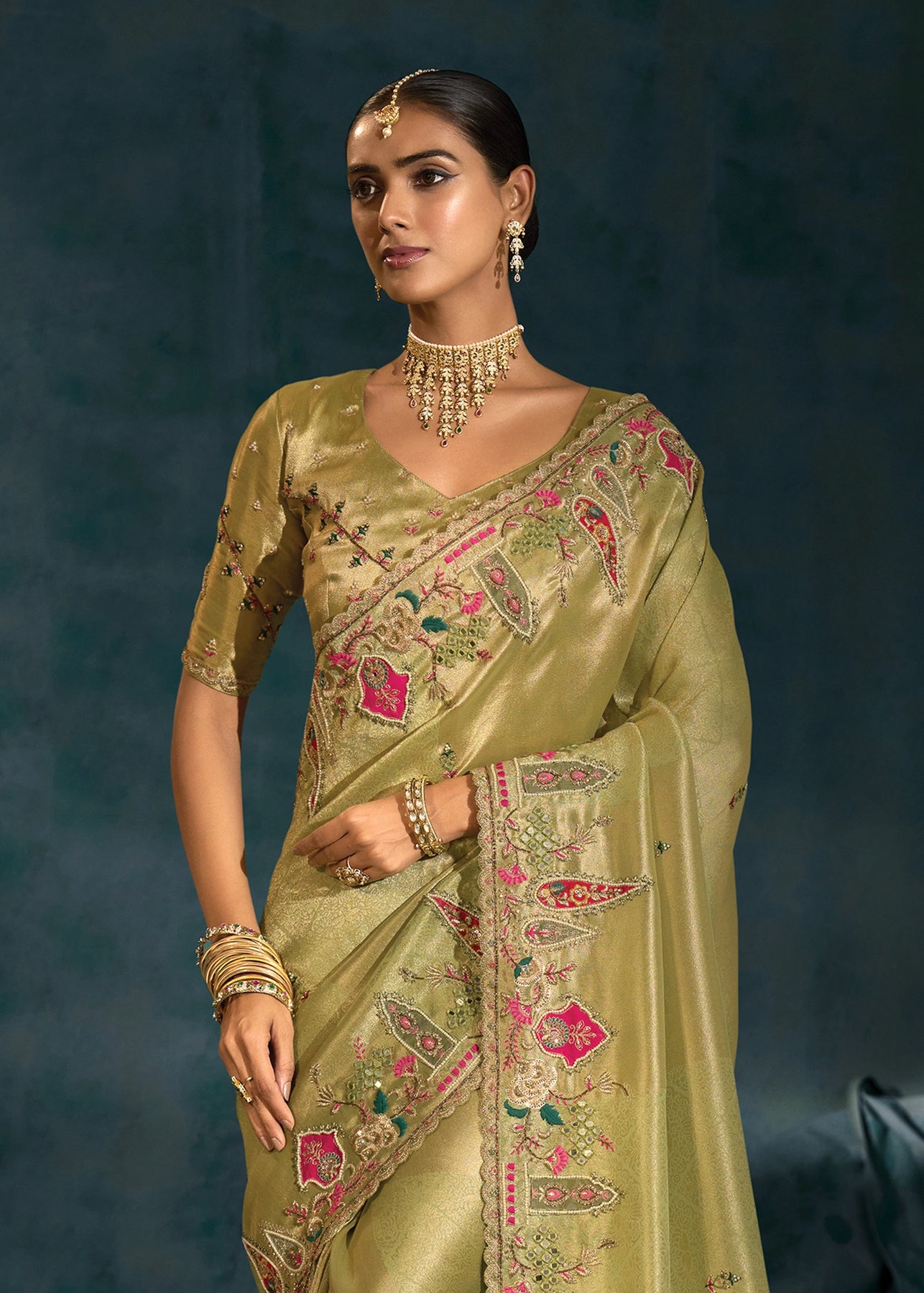 Mehandi Green Embroidered Designer Tissue Saree
