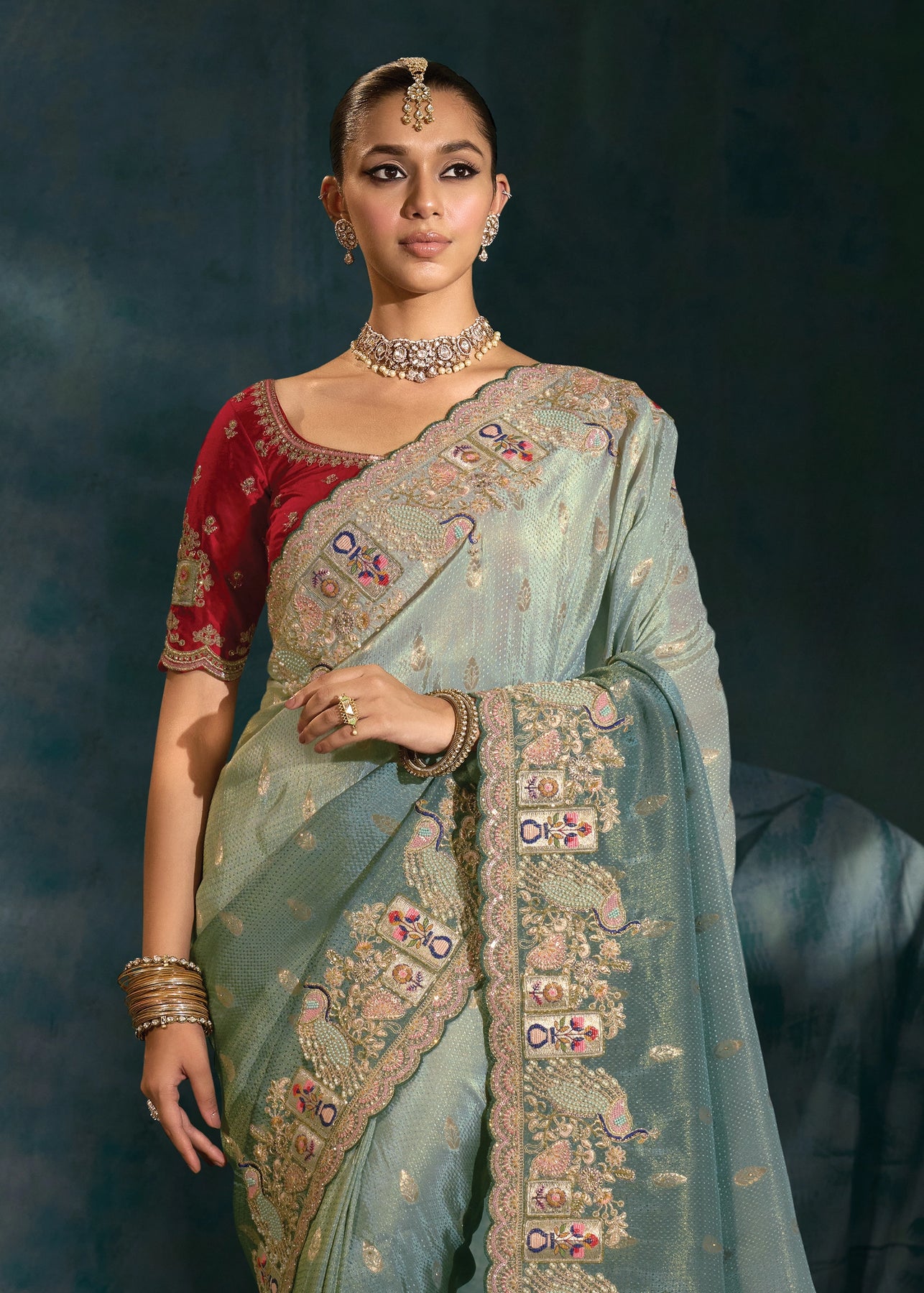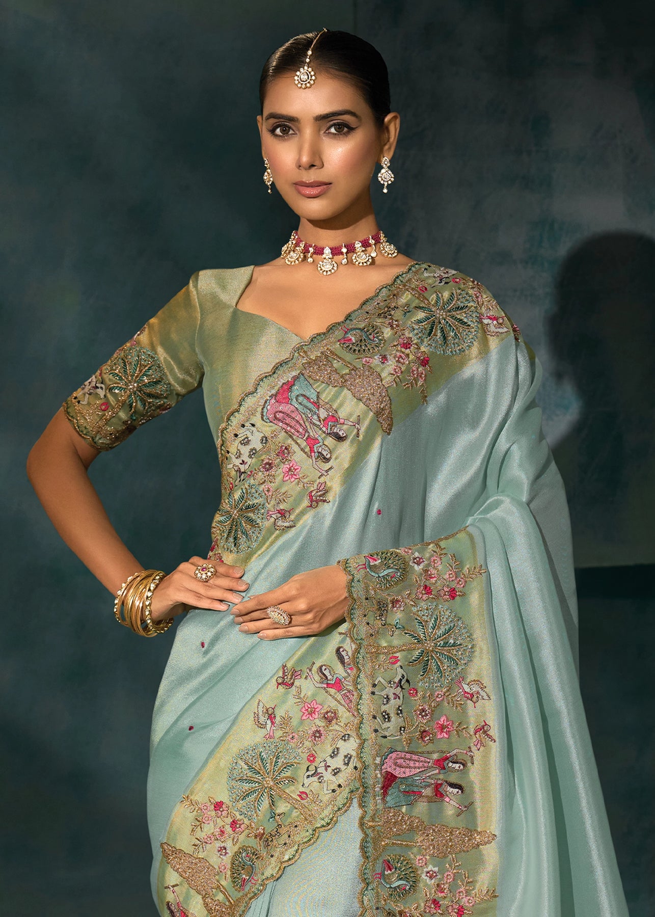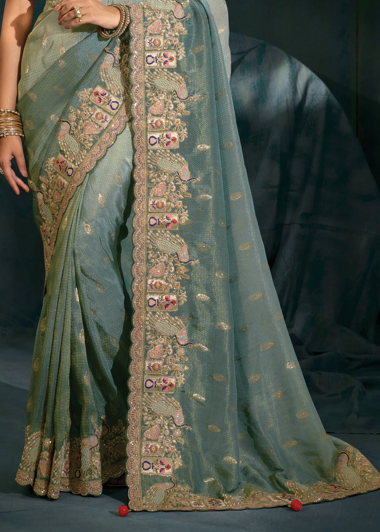 Grey Green Embroidered Designer Tissue Saree