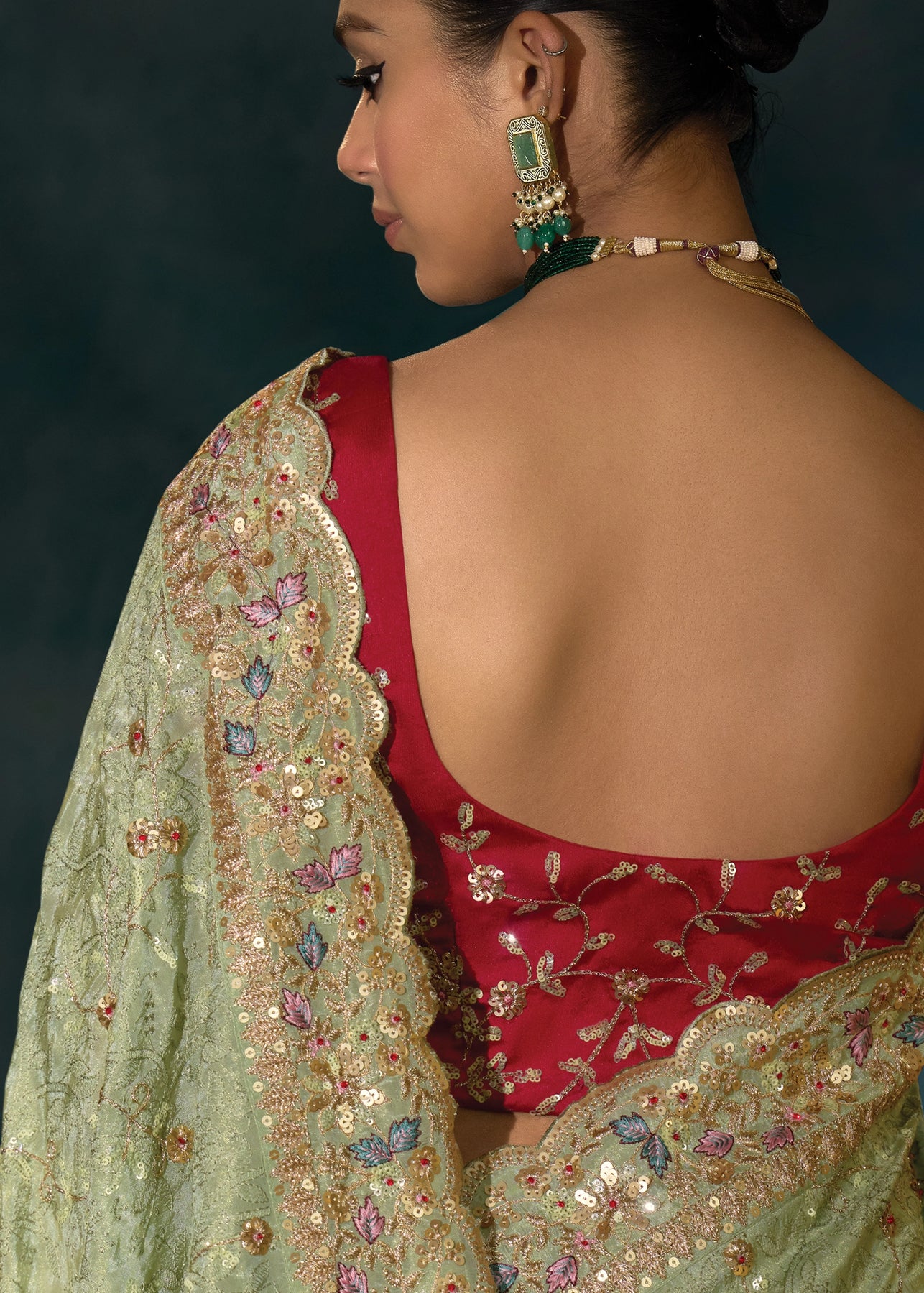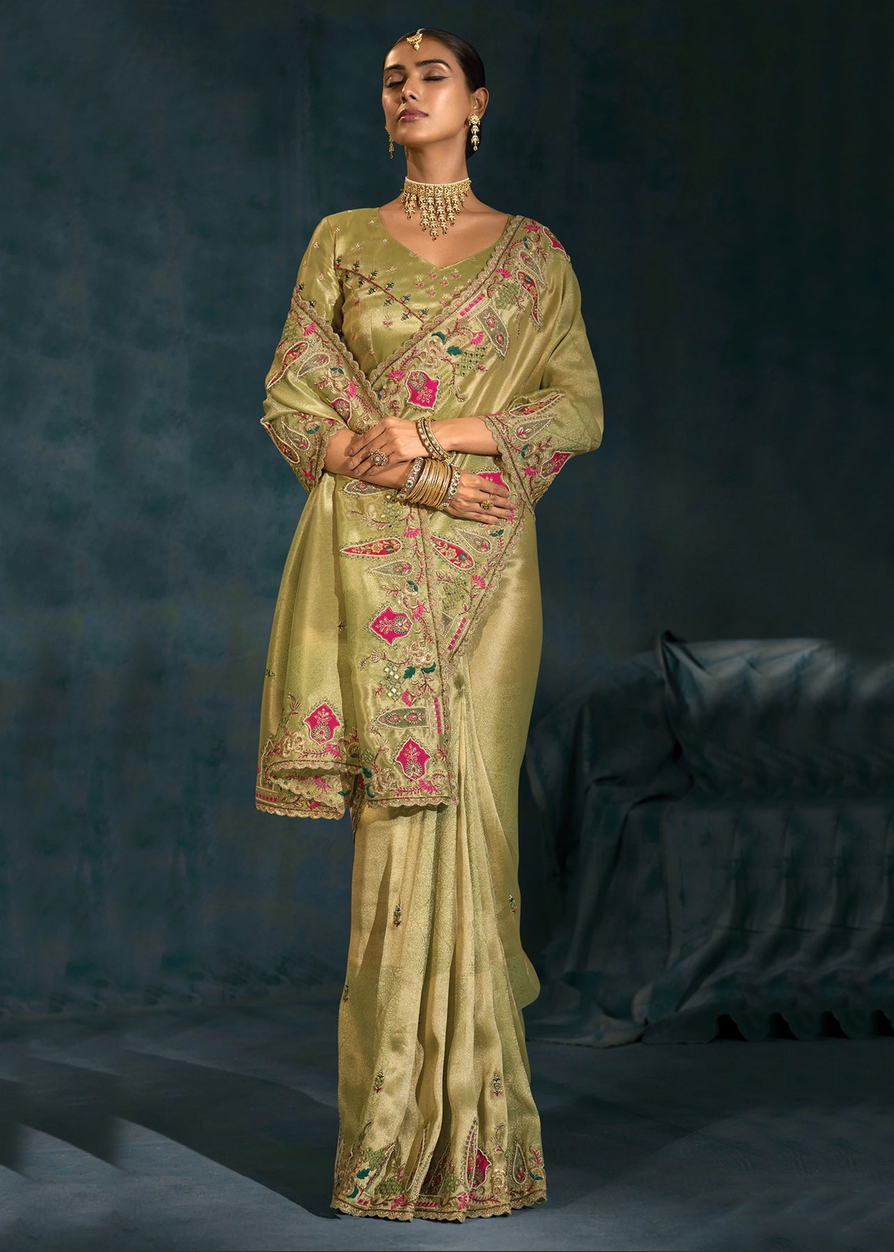 Pista Green Embroidered Designer Tissue Saree