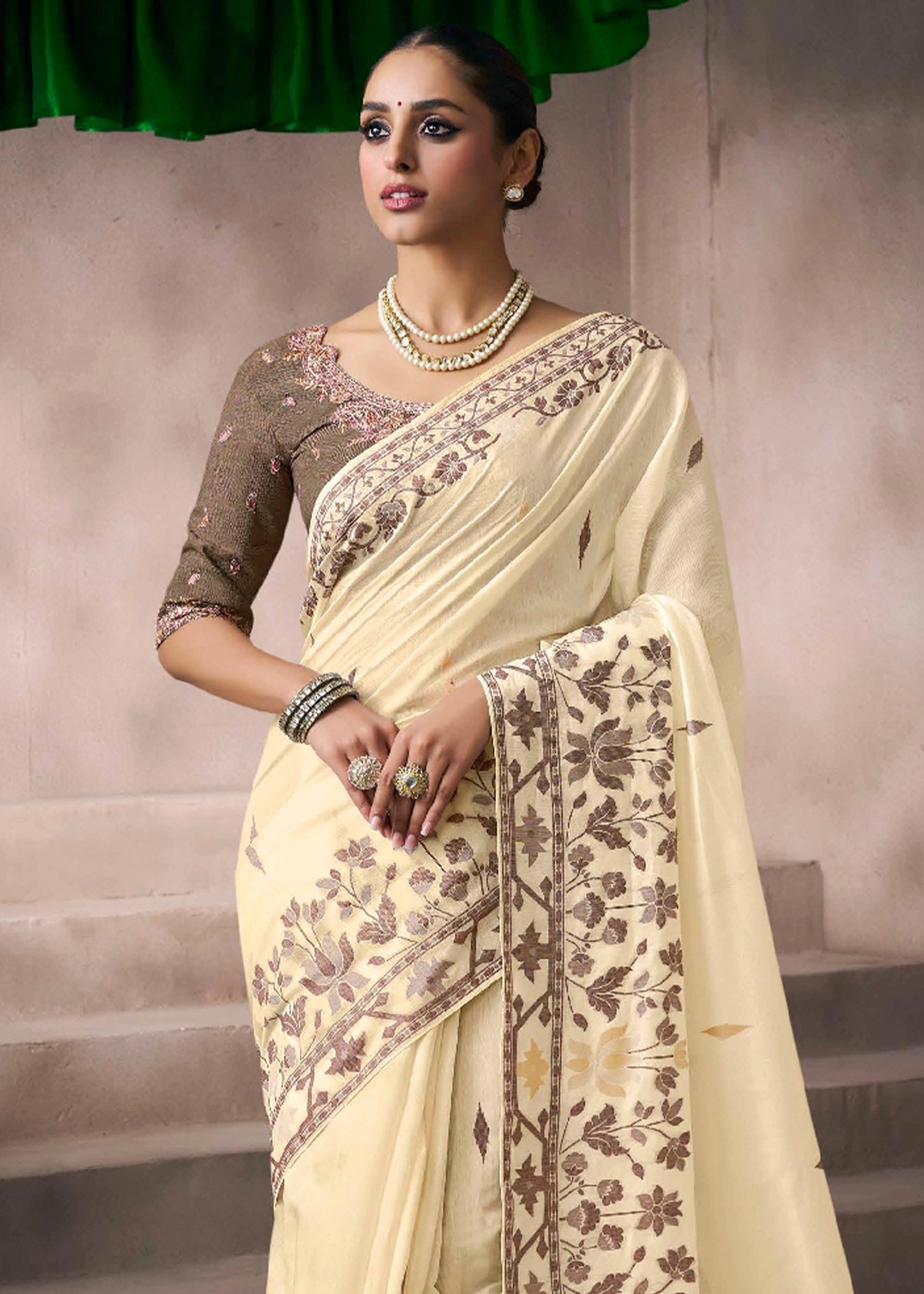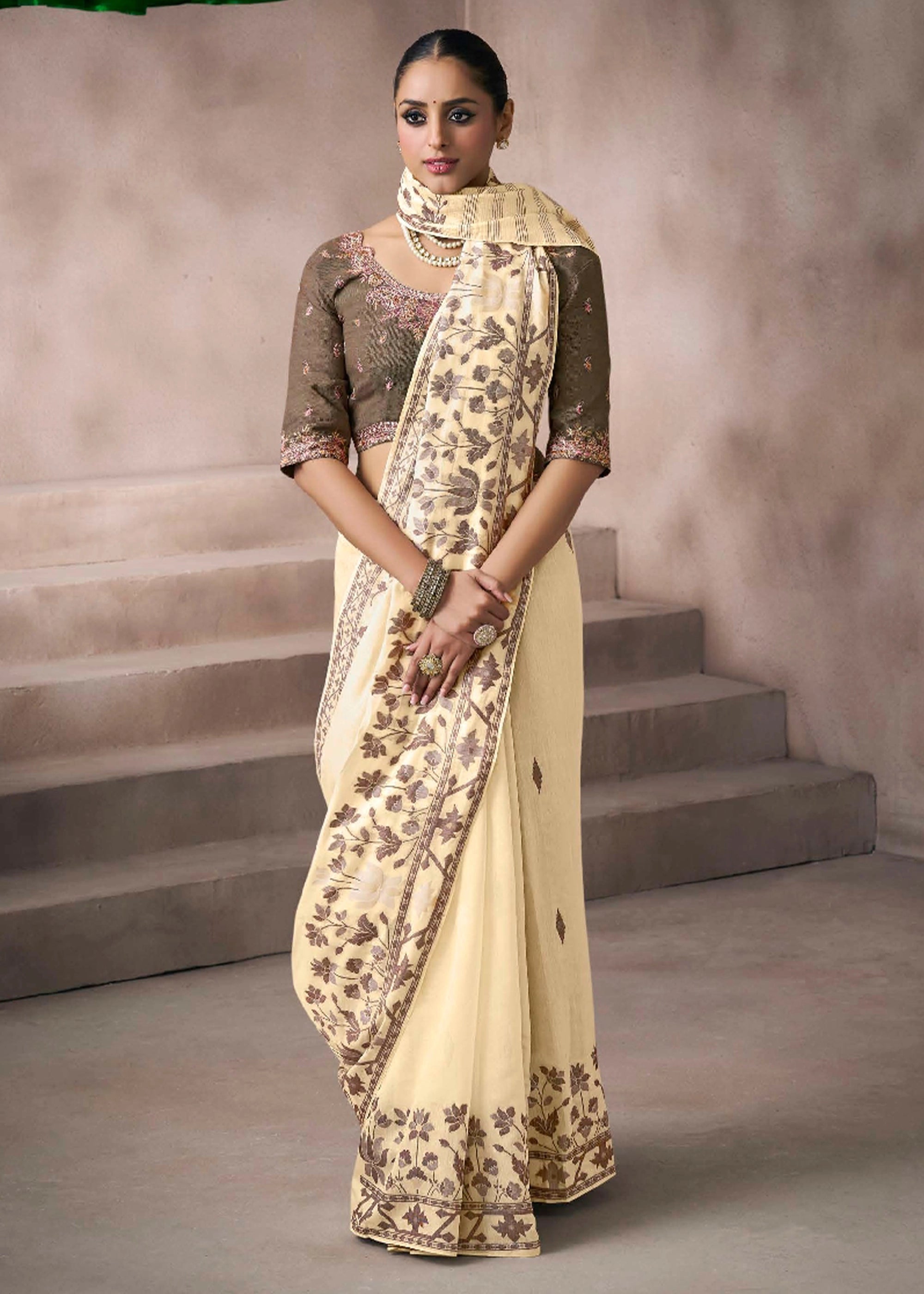 This elegant muga cotton saree features an all-over floral weaving pattern inspired by traditional Pichwai art.The soft, breathable fabric ensures comfort for any occasion, from casual wear to festive events.It comes with a contrasting blouse piece, perfect for a complete, sophisticated look.