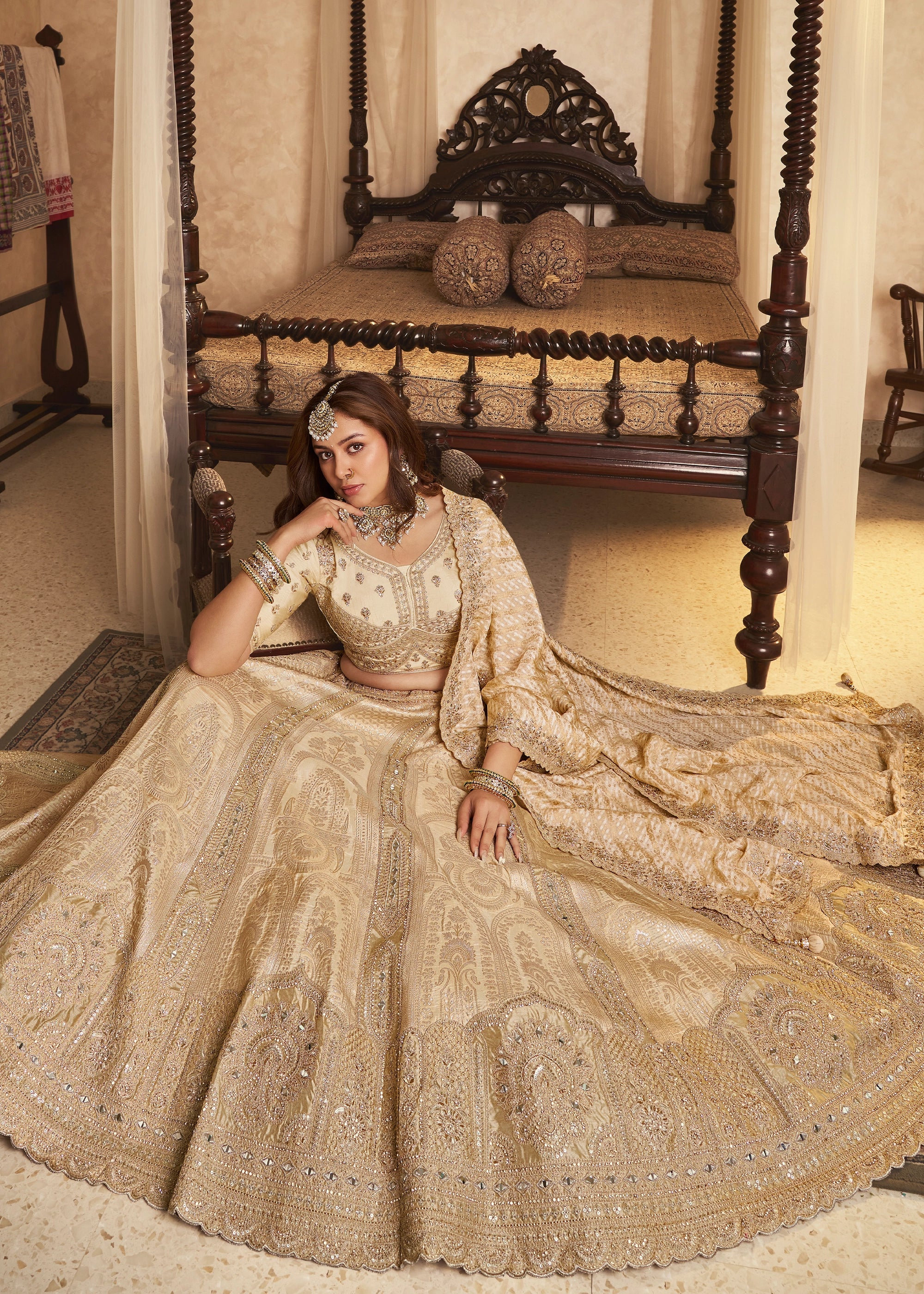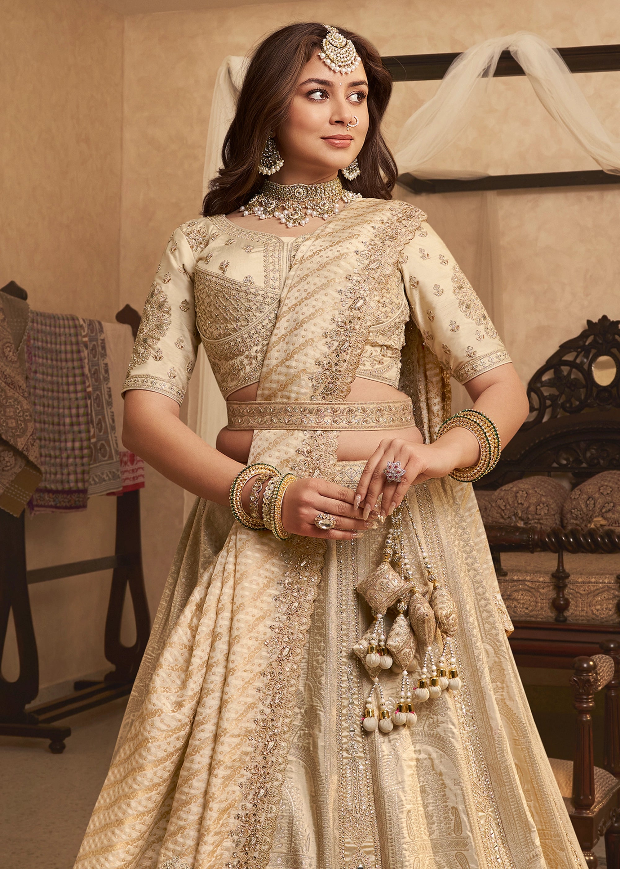 This stunning Banarasi silk leheng features intricate embroidery and vibrant traditional motifs in a beautiful multicolor palette.It is a perfect choice for weddings and festive occasions