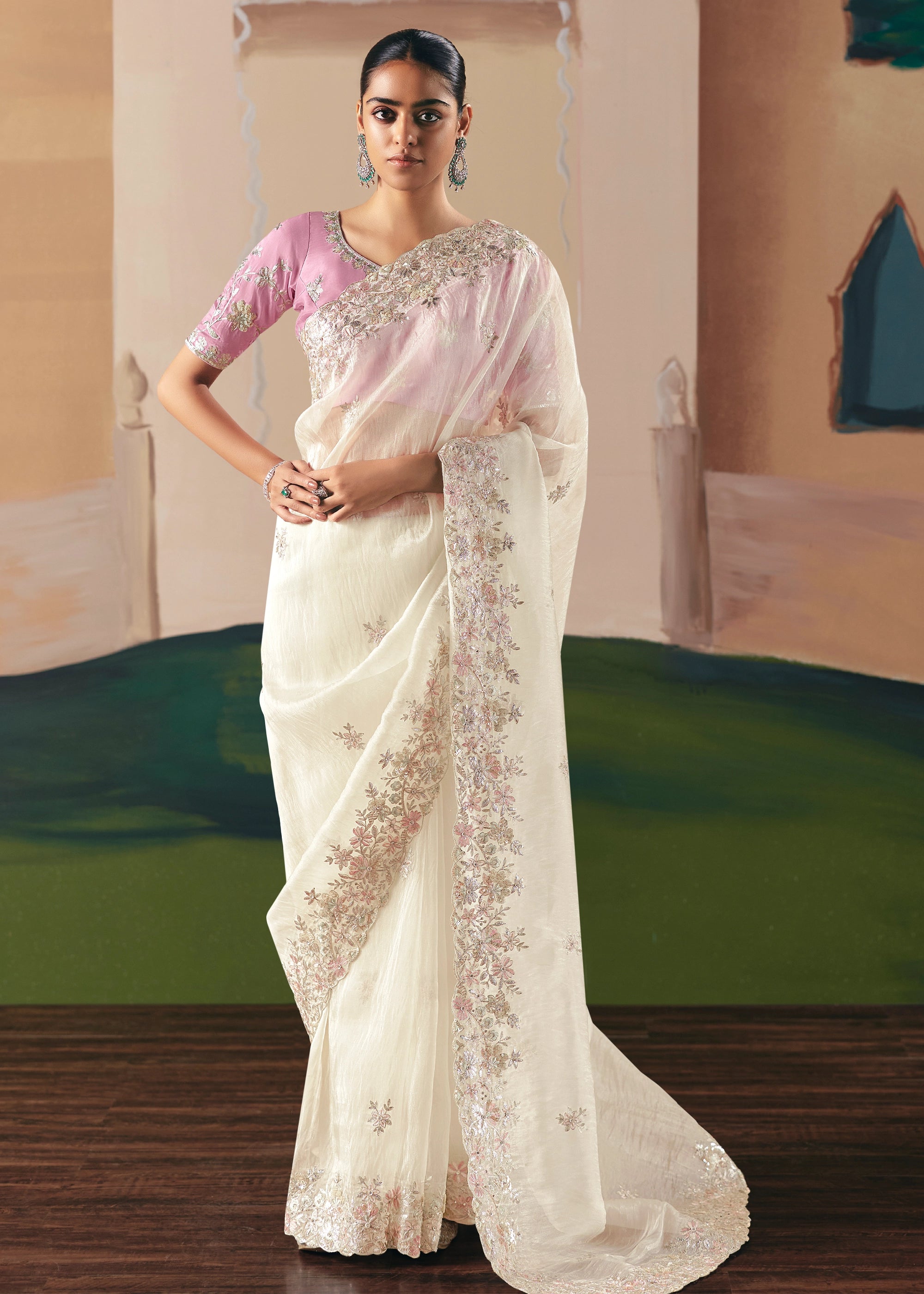 Step out in style with this elegant off-white fancy fabric saree, featuring intricate embroidery, sequins, and moti work, paired with a pink blouse for a stunning festive look.