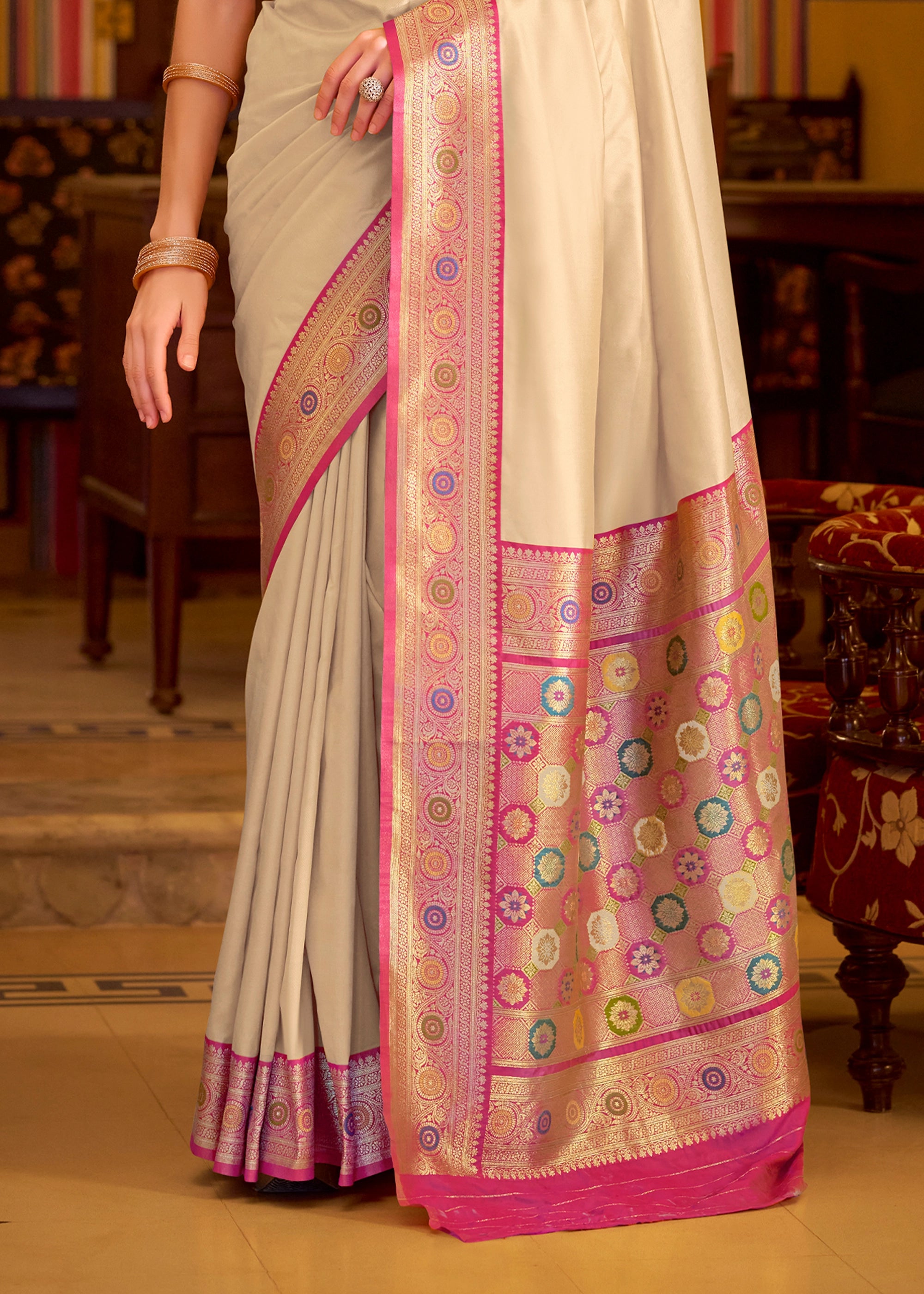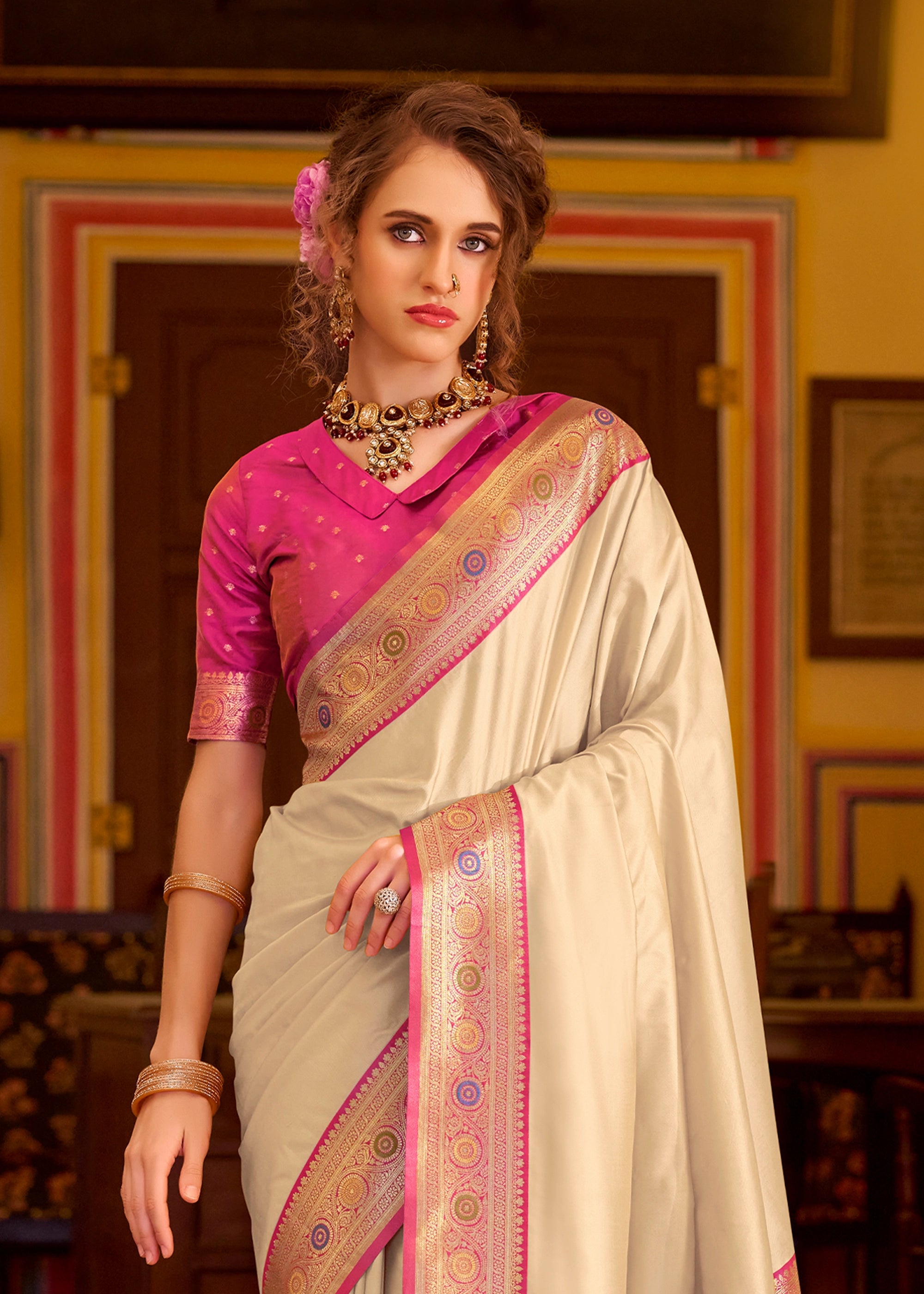 This silk saree shimmers with regal splendor.Its opulent silk threads create a rich texture and a captivating sheen.Intricate zari work, often in gold or silver, intricately weaves traditional motifs like paisleys, florals, and geometric patterns across the fabric.