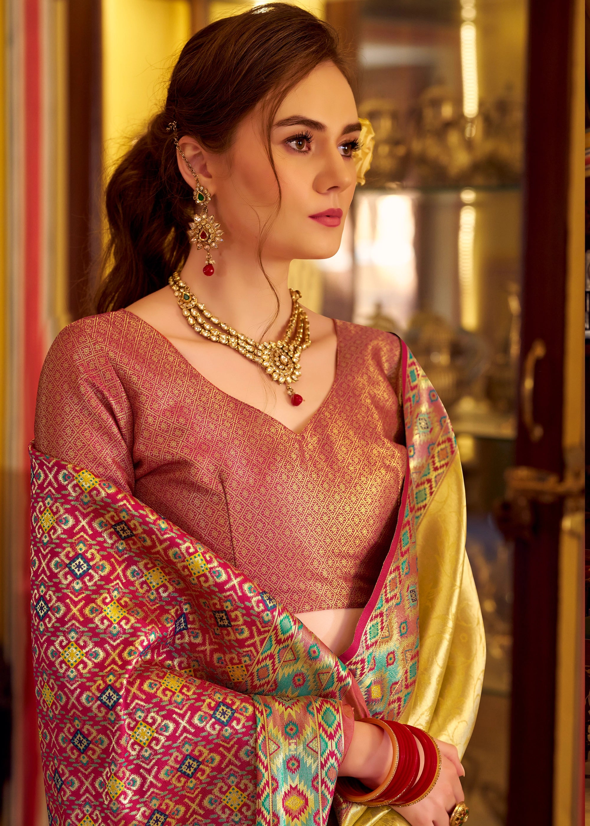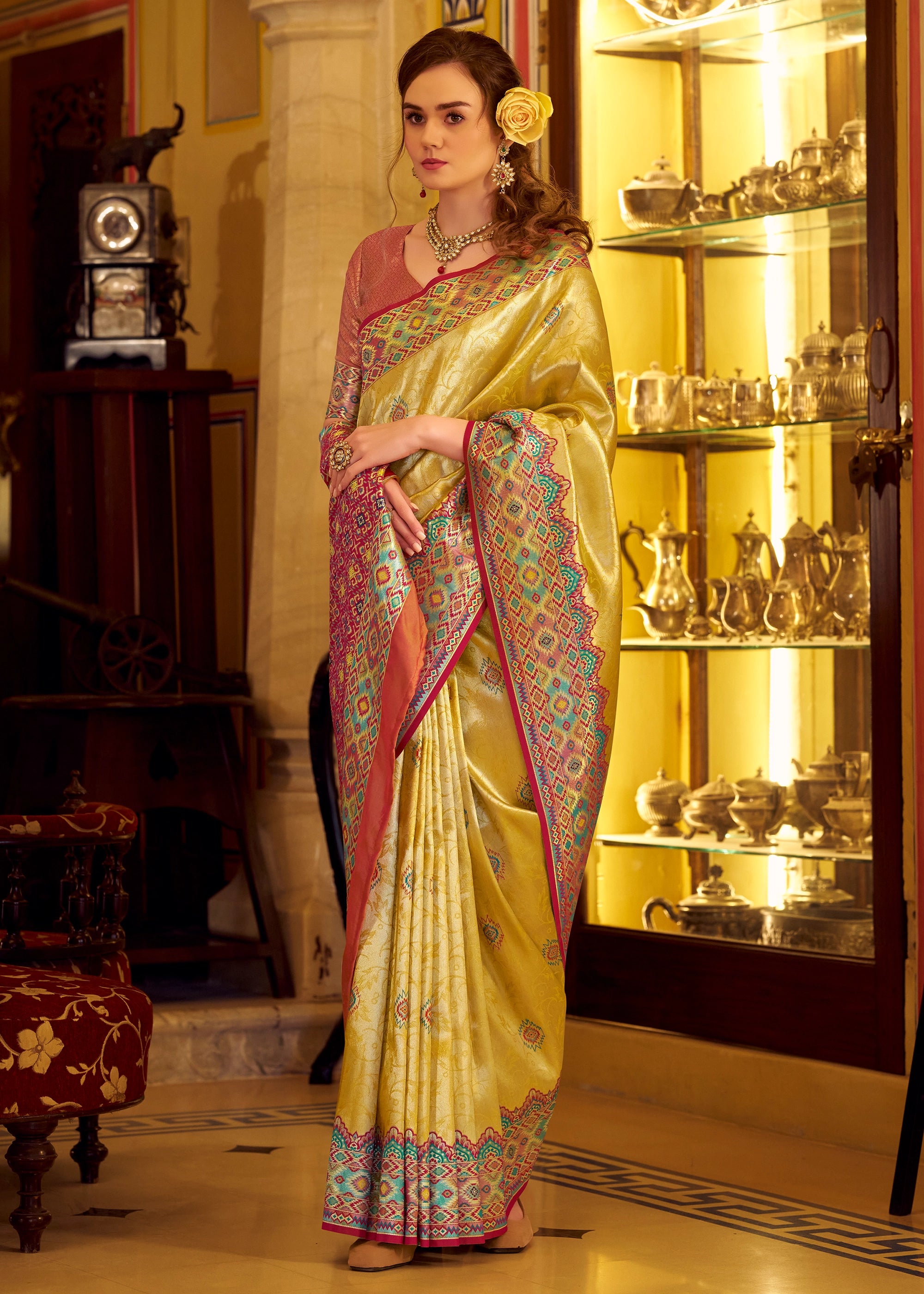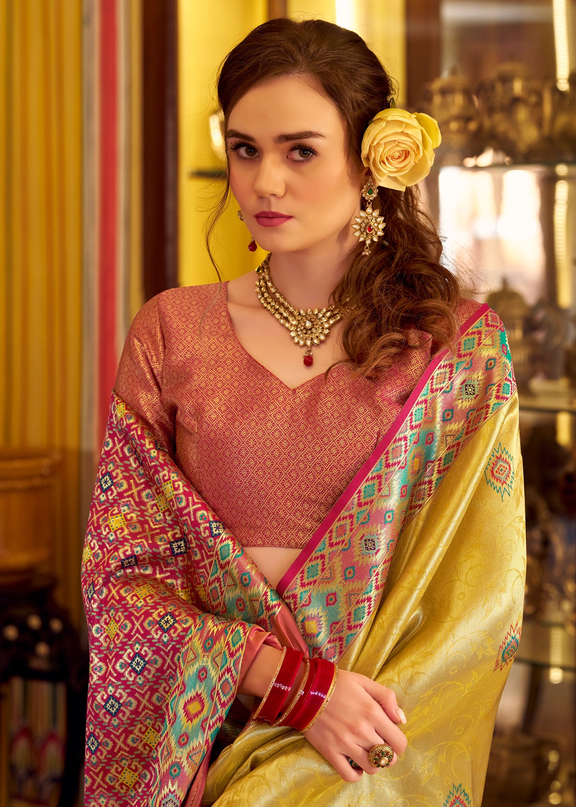 Drape yourself in this beautiful Banarasi saree with Zari woven work. This saree is woven by master weavers of Banaras. Be it your sangeet ceremony or haldi or any auspicious ceremonies, this saree will be the best companion, with the rich style and color coordination this saree is a must in wardrobe! Style it with a potli bag and high heels for a flawless look.