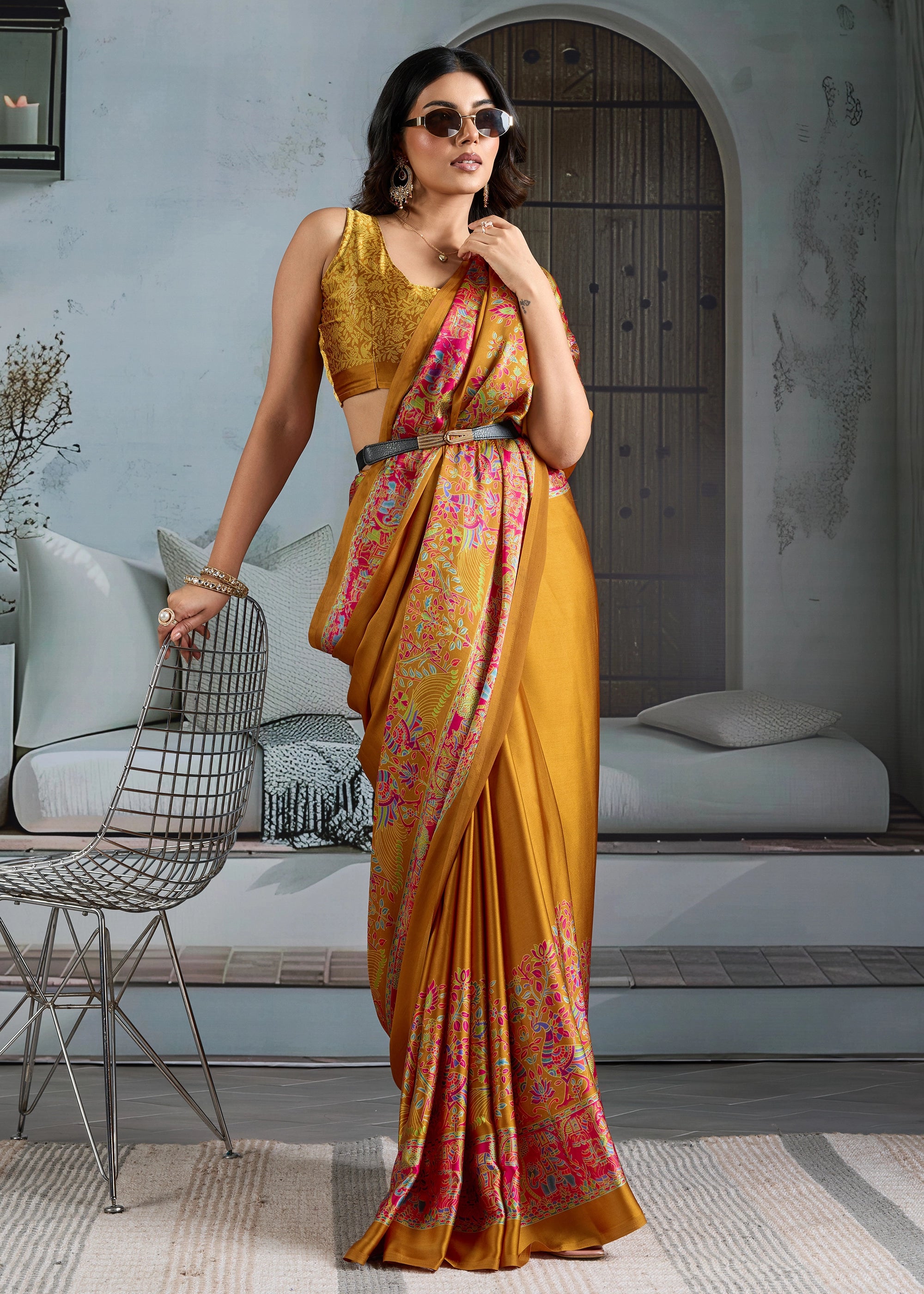Its sleek, opulent fabric provides a sophisticated base for the captivating Ajrakh printed pallu and blouse, infusing traditional charm into a modern design. Whether it's a festive gathering, a formal event, or a special evening out, this saree is designed to make you feel effortlessly elegant and uniquely beautiful.
