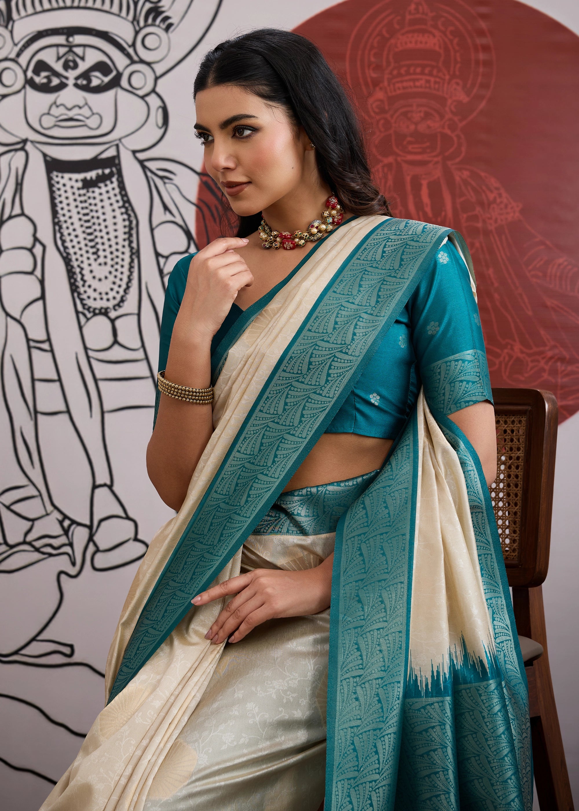 Radiate sheer sophistication in this soft silk saree, featuring a luminous dual-tone texture. Its weightless drape and golden Zari borders create a modern masterpiece for the discerning woman.
