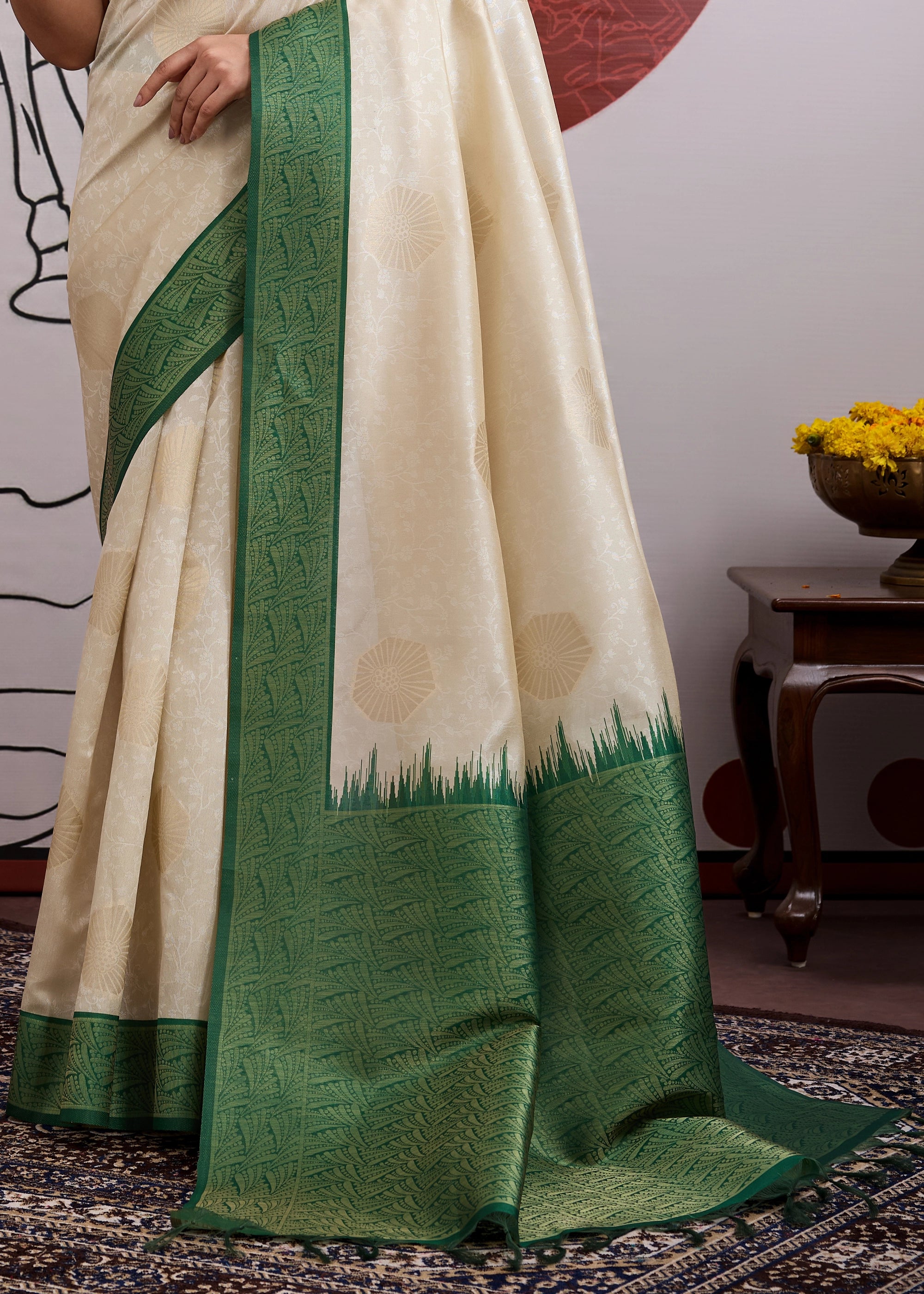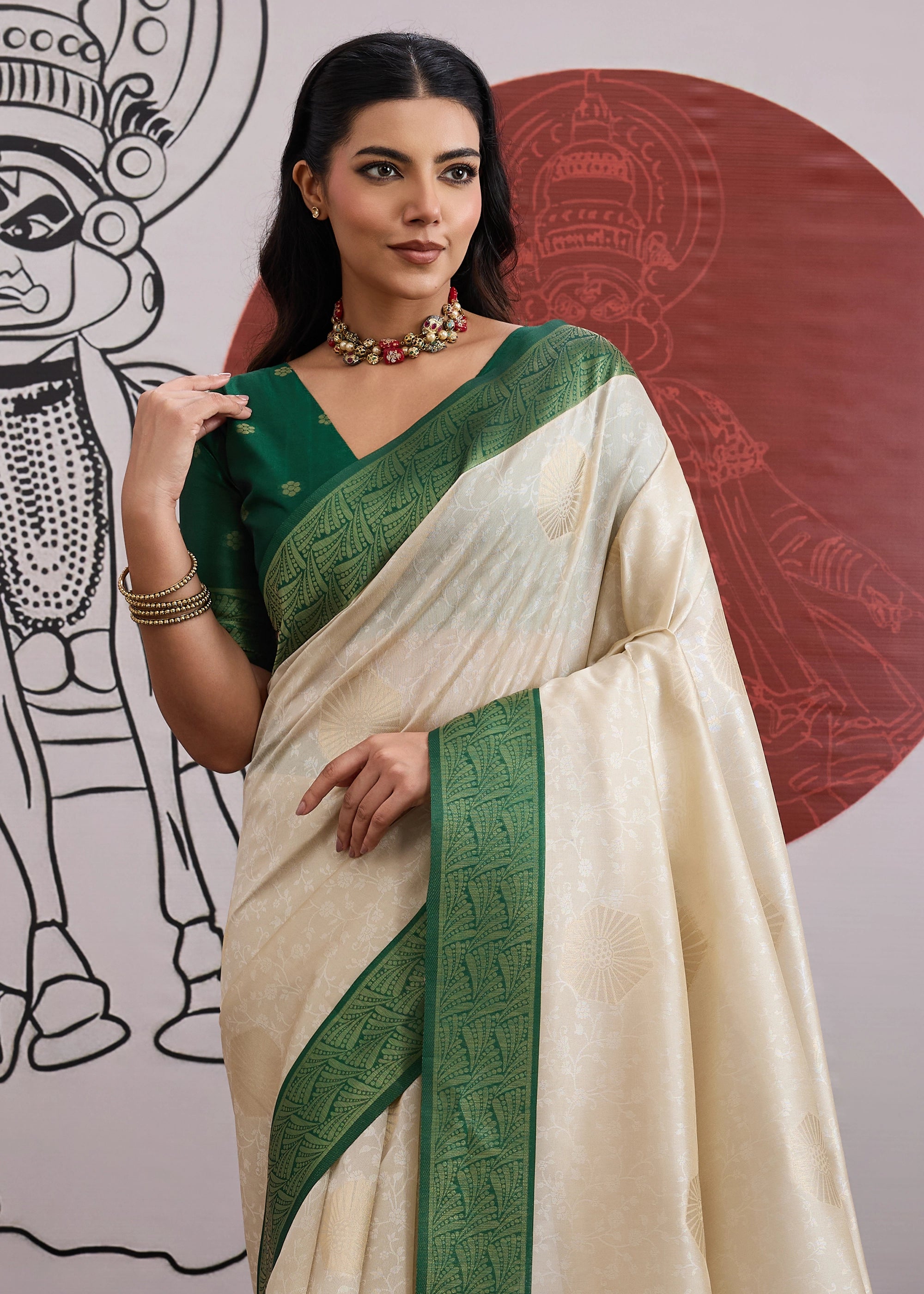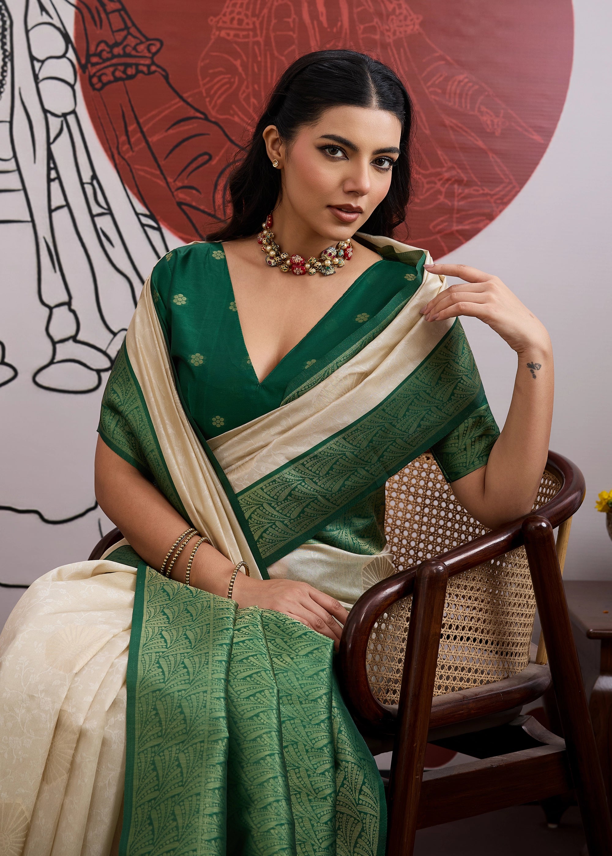 Radiate sheer sophistication in this soft silk saree, featuring a luminous dual-tone texture. Its weightless drape and golden Zari borders create a modern masterpiece for the discerning woman.
