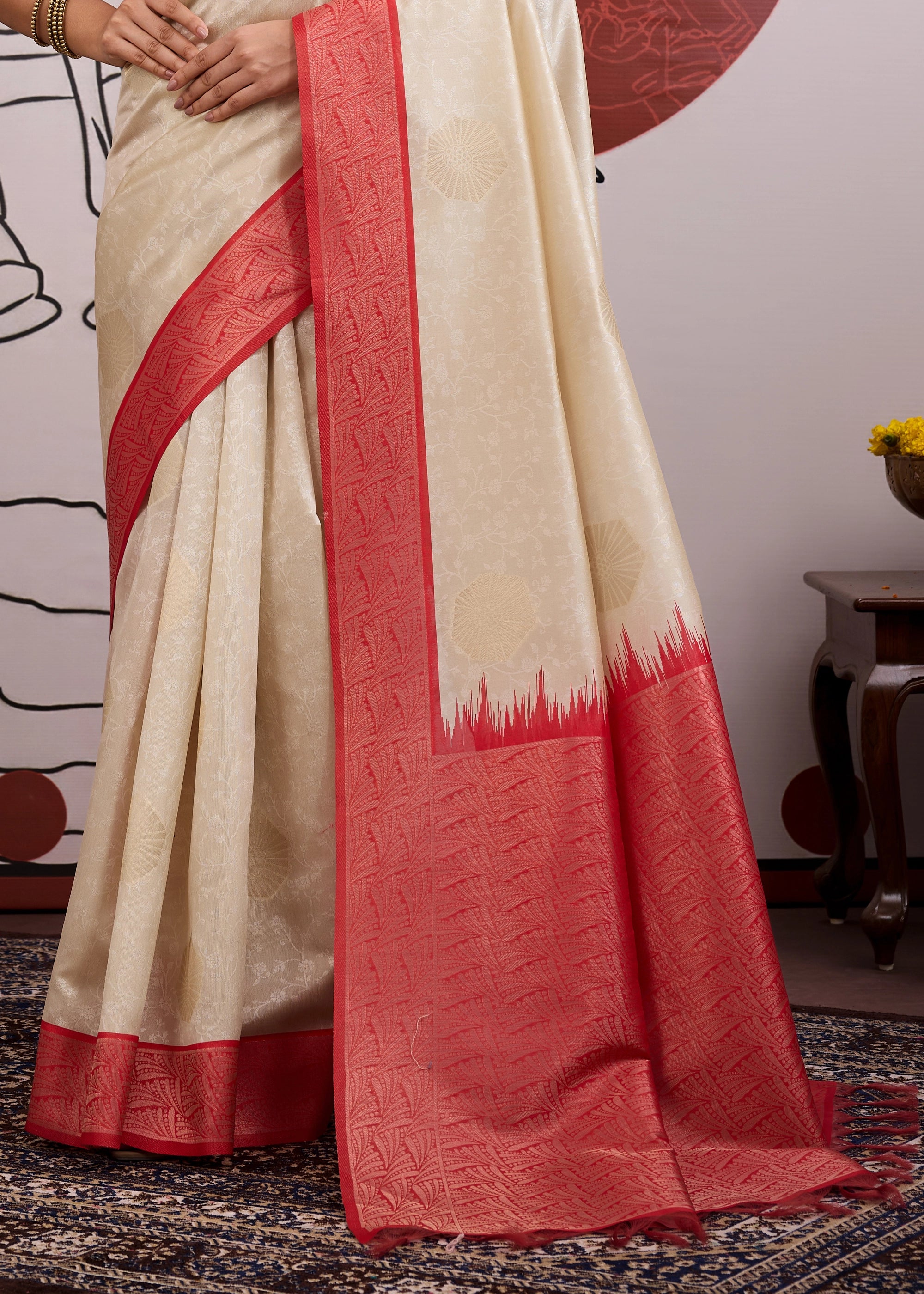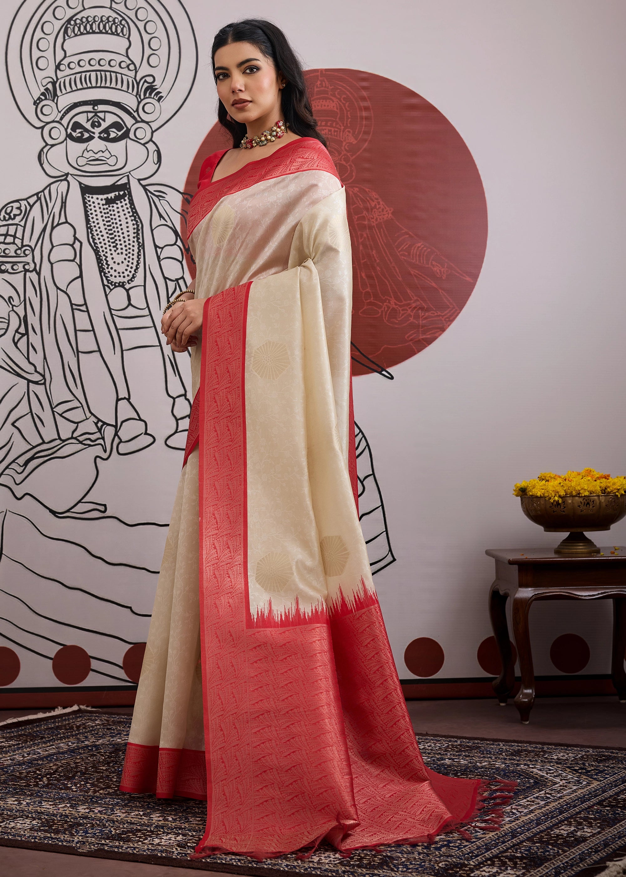 Radiate sheer sophistication in this soft silk saree, featuring a luminous dual-tone texture. Its weightless drape and golden Zari borders create a modern masterpiece for the discerning woman.