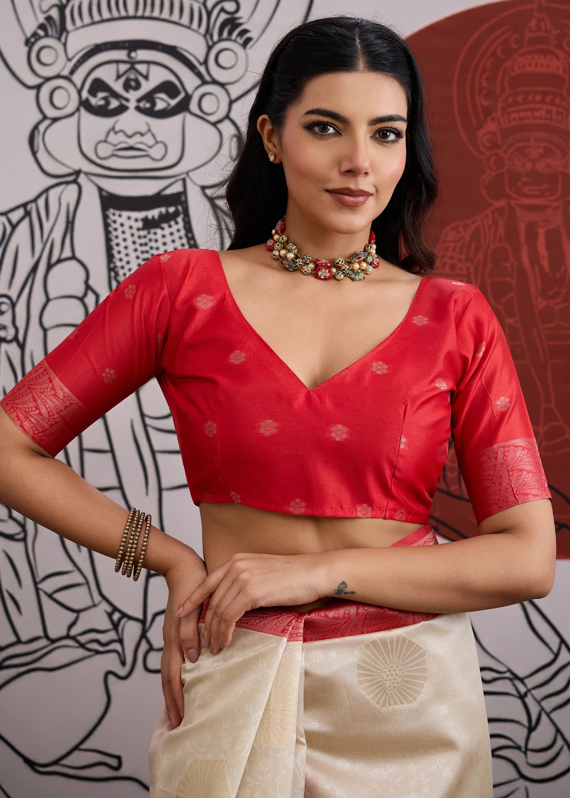Radiate sheer sophistication in this soft silk saree, featuring a luminous dual-tone texture. Its weightless drape and golden Zari...